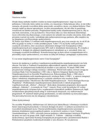 Nierówna walka Dzięki dużej zasłudze mediów wiedza na temat niepełnosprawności -staje się coraz pełniejsza. Człowiek, który jedzie na wózku, czy maszeruje z białą laską po ulicy, to nie tylko sensacja, ale przede wszystkim dobry pracownik, szczęśliwy ojciec, czy piękna kobieta. Choć niestety nadal są obecne uprzedzenia, zwykle nieuzasadnione, ale tak silne że paraliżują wrażliwość na ludzkie potrzeby. Pragnieniem każdej osoby niepełnosprawnej jest to, aby to ona była zauważona, a nie jej kalectwo. Oczywiście taka czy inna ułomność determinuje życie człowieka nią obarczonego, a tym samym nie uchodzi ona uwadze otoczenia, które albo przyjmie wartość tej osoby i potraktuje jako pełnowartościowego partnera, albo znajdzie się na marginesie cywilizowanego społeczeństwa. W Polsce żyje blisko 5,5 miliona osób niepełnosprawnych, przy tym szacuje się, że od 45 do 60% tej grupy to osoby w wieku produkcyjnym. Tylko 17% tej liczby osób pozostaje czynnych zawodowo, choć szczytnym założeniem strategii Unii Europejskiej wobec niepełnosprawnych jest zaangażowanie 60% nich w działalność ekonomiczną. W związku z barierami w dostępie do edukacji niepełnosprawni zatrudniani są w zawodach, które nie wymagają wysokich kwalifikacji. Konsekwencją tego są dużo niższe wynagrodzenia niż u pozostałej części społeczeństwa, a to niesie za sobą ich izolację i postępujące wykluczenie. Co na temat niepełnosprawności mówi Unia Europejska? Jeszcze do niedawna w polityce wspólnotowej problematyka niepełnosprawności nie była obecna. Nie było w Traktacie Europejskim odpowiednich zapisów, które dałyby prawne podstawy do podejmowania konkretnych działań w tym zakresie. W latach 1980-1990 przyjmowano różnego rodzaju rezolucje i deklaracje. Wśród nich należy zwrócić uwagę na rezolucje Rady Unii Europejskiej z 1981 roku w Sprawie Integracji Społecznej Osób Niepełnosprawnych na Szczeblu Wspólnotowym. Rekomendacje Rady z 1986 roku w sprawie zatrudniania osób niepełnosprawnych, rezolucje Rady z 1990 r. w sprawie integracji dzieci i młodzieży niepełnosprawnej w systemie szkolnym oraz rezolucje Rady „Równouprawnienie i Możliwości dla Osób Niepełnosprawnych – Nowa Strategia Rozwoju Wspólnoty”. Problematyka niepełnosprawności dominowała w takich programach wspólnotowych jak: „Helios”, „Horizon”. Była także elementem programów dotyczących edukacji: „Sokrates”, „Leomardo da Vinci” i innych. Przez wiele lat polityka UE wobec niepełnosprawnych związana była z wypłacaniem różnorakich zasiłków finansowych, bądź świadczeniem specjalistycznych usług w izolowanych miejscach, czy realizowanych programach. W ostatnich latach góruje przekonanie, że takie działania są niewystarczające. Nie prowadzą bowiem one do integracji i niezależności. Zakaz dyskryminacji Na szczeblu Wspólnoty zdefiniowano cel, którym jest identyfikacja i eliminacja wszelkich barier stanowiących przeszkody w równym dostępie do praw i w pełnym uczestnictwie we wszystkich dziedzinach życia. Chociaż problematyka niepełnosprawności pozostaje w domenie działalności poszczególnych państw, to od chwili wejścia w życie Traktatu Amsterdamskiego w 1999 r. powstały prawne podstawy zobowiązujące instytucje Wspólnoty do pracy na rzecz tej grupy osób. Zapis artykułu 13. Traktatu - zakazuje wszelkiej dyskryminacji, upoważnia Komisję Europejską do przygotowania i przedstawienia Radzie i Parlamentowi projektów konkretnych działań w tym obszarze. Po raz pierwszy niepełnosprawność została wprost wymieniona w Traktacie wraz ze wskazaniem na potrzebę przeciwdziałania dyskryminacji. Na tej podstawie Komisja przygotowała projekt dyrektywy dotyczącej równego traktowania w zatrudnianiu. Zakazuje ona bezpośredniej i pośredniej dyskryminacji. Dyskryminacja pośrednia dotyczy sytuacji, kryteriów, lub działań, które uchodząc za neutralne, stawiają osoby niepełnosprawne w pozycji gorszej od innych. Pracodawca zobowiązany jest do podjęcia działań mających usunąć skutki takich sytuacji. Zapewnienie pełnego uczestnictwa osób niepełnosprawnych oraz włączenie tej problematyki w główny nurt polityk UE to najważniejsze elementy strategii Wspólnoty wobec osób niepełnosprawnych. Kwestia niepełnosprawności jest znacząco obecna we wspólnotowej strategii zatrudnienia. Programy i inicjatywy - pieniądze Istotną rolę w polityce państw UE odgrywają programy i inicjatywy wspólnotowe. W ramach samego programu „Horizon” finansowanych było 1700 projektów. Obecnie najważniejsze inicjatywy dotyczące osób niepełnosprawnych: Wspólnotowy Program Przeciwdziałania Społecznemu Wykluczeniu – 75 milionów Euro na lata 2002-2006, WSPÓLNOTOWY Program Przeciwdziałania Dyskryminacji – niemal 100 mln Euro na lata 2001-2006. Inicjatywa Wspólnotowa IQOR - 3 nld Euro na lata 20000-2006, Pobudzanie do Zatrudnienia - w roku 2003 było przeznaczone na ten cel 10 nln Euro. Europejska Strategia Zatrudnienia finansowana jest z Europejskiego Funduszu Społecznego, którego budżet na lata 2000-2006 wynosi 60 mld Euro. Należy pamiętać, że uczestnictwo w programach wymaga własnego, państwowego, lokalnego, prywatnego wkładu finansowego. Ratujmy budżet …kosztem niepełnosprawnych? Pomimo tego, że Unia Europejska postrzegana jest jako obszar powszechnego dostatku, nie omijają ją również zagrożenia, które bagatelizowane mogą stać się początkiem kryzysu. Polska dotknięta wysokim bezrobociem nie jest w stanie sprostać dużym nakładom na ochronę zdrowia, zabezpieczenia socjalne. Doniesienia prasowe podają, że liczba osób pobierające renty, emerytury, czy inne świadczenia jest już równa liczbie tych, którzy płacą podatki zabezpieczając właśnie te cele. System staje się niewydolny, stąd rządowe pomysły, aby zmiejszając wydatki na niepełnosprawnych ratować państwo.