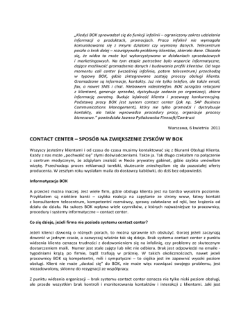 „Kiedyś BOK sprowadzał się do funkcji infolinii – ograniczony zakres udzielania informacji o produktach, promocjach. Praca infolinii nie wymagała komunikowania się z innymi działami czy wymiany danych. Telecentrum poszło o krok dalej – rozwiązywało problemy klientów, zbierało dane. Okazało się, że widza ta może być wykorzystywana w działaniach sprzedażowych i marketingowych. Na tym etapie potrzebne było wsparcie informatyczne, dające możliwość gromadzenia danych i budowania profili klientów. Od tego momentu call center (wcześniej infolinia, potem telecentrum) przechodzą w typowy BOK, gdzie zintegrowane zostają procesy obsługi klienta. Gromadzone są informacje, kontakty. Już nie tylko telefon, ale także email, fax, a nawet SMS i chat. Niebawem videotelefon. BOK zarządza relacjami z klientami, generuje sprzedaż, dystrybuuje zadania po organizacji, zbiera informację zwrotną. Buduje lojalność klienta i przewagę konkurencyjną. Podstawą pracy BOK jest system contact center (jak np. SAP Business Communications Management), który nie tylko gromadzi i dystrybuuje kontakty, ale także wprowadza procedury pracy, organizuje procesy biznesowe.” powiedziała Joanna Pytlakowska Finnsoft/Comtrust Warszawa, 6 kwietnia 2011 CONTACT CENTER – SPOSÓB NA ZWIĘKSZENIE ZYSKÓW W BOK Wszyscy jesteśmy klientami i od czasu do czasu musimy kontaktować się z Biurami Obsługi Klienta. Każdy z nas może „pochwalić się” złymi doświadczeniami. Także ja. Tak długo czekałam na połączenie z centrum medycznym, że zdążyłam znaleźć w Necie prywatny gabinet, gdzie szybko umówiłam wizytę. Przechodząc proces reklamacji torebki, skutecznie zniechęciłam się do pozostałej oferty producenta. W zeszłym roku wysłałam maila do dostawcy kablówki, do dziś bez odpowiedzi. Informatyzacja BOK A przecież można inaczej. Jest wiele firm, gdzie obsługa klienta jest na bardzo wysokim poziomie. Przykładem są niektóre banki – szybka reakcja na zapytanie ze strony www, łatwy kontakt z konsultantem telecentrum, kompetentni rozmówcy, sprawy załatwiane od ręki, bez krążenia od działu do działu. Na sukces BOK wpływa wiele czynników, z których najważniejsze to pracownicy, procedury i systemy informatyczne – contact center. Co się dzieje, jeżeli firma nie posiada systemu contact center? Jeżeli klienci dzwonią o różnych porach, to można sprawnie ich obsłużyć. Gorzej jeżeli zaczynają dzwonić w jednym czasie, a zazwyczaj właśnie tak się dzieje. Brak systemu contact center z punktu widzenia klienta oznacza trudności z dodzwonieniem się na infolinię, czy problemy ze skutecznym dostarczeniem maili. Numer jest stale zajęty lub nikt nie odbiera. Brak jest odpowiedzi na emaile tygodniami krążą po firmie, bądź trafiają w próżnię. W takich okolicznościach, nawet jeżeli pracownicy BOK są kompetentni, mili i sympatyczni – to ciężko jest im zapewnić wysoki poziom obsługi. Klient nie może „dostać się” do BOK, nie może więc rozwiązać swojego problemu, jest niezadowolony, skłonny do rezygnacji ze współpracy. Z punktu widzenia organizacji – brak systemu contact center oznacza nie tylko niski poziom obsługi, ale przede wszystkim brak kontroli i monitorowania kontaktów i interakcji z klientami. Jaki jest poziom obsługi? Ciężko ocenić, bo brak danych. To, że klienci dzwonią i są obsługiwani, de facto nic nie mówi o jakości tej obsługi, szybkości działania, rozwiązywaniu spraw. Contact center jest systemem dedykowanym biurom obsługi klienta i telecentrum. Zbiera i dystrybuuje kontakty, wprowadza jasne procedury, usprawnia procesy obsługi. System taki może być zintegrowany z innym systemem informatycznym (CRM, systemem zamówień, logistyki, finansowym, etc). Taka integracja daje większy wgląd w dane klienta. Aczkolwiek nie jest niezbędna. Sam system contact center w wielu organizacjach funkcjonuje samodzielnie i pozwala na najwyższy poziom obsługi. Poziom, który nie tylko daje klientowi satysfakcję, ale buduje jego lojalność wobec firmy i produktów. To właśnie doświadczenia z BOK determinują lojalność klienta. Okazuje się, że sam produkt (nawet bardzo dobry) nie jest gwarantem utrzymania klienta. Klient swobodnie może zmieniać producentów i dostawców, grymasić, oczekiwać specjalnego traktowania. Czym jest satysfakcja klienta? Bez lojalności i ponownych zakupów – właściwie niczym konkretnym. Satysfakcja ustępuje miejsca lojalności. Dlatego też firmy z różnych rynków zbytu dóbr konsumpcyjnych (kosmetyki, FMCG, farmaceutyki, etc), podążają drogą banków i instytucji finansowych, tworząc Departamenty Telecentrum i Obsługi Klienta. BOK centrum zysków BOK nie jest już jak kiedyś centrum kosztów, a staje się centrum generowania zysków. Już nie tylko informuje czy zbiera dane o klientach. Sprzedaje, dosprzedaje (cross/up selling), uzupełnia braki na półkach, proponuje promocje. Doradza klientowi, którą z aktualnie dostępnych promocji najlepiej wybrać. Rozmawia i, co ogromnie ważne, buduje relację. Jednocześnie pracuje pod presją czasu, terminów, targetów. Momentami konkuruje z handlowcami w terenie. Rozwiązuje problemy, reklamacje, informuje o etapach realizacji zamówień, łagodzi emocje, tłumaczy firmę i drobne uchybienia. Raz zachęca do zakupów, innym razem przeprowadza badanie, czy windykuje należności. Rozmawia, chatuje, mailuje. Czytając ten paragraf można pogubić się w zadaniach i obowiązkach, a co mówić o pracy w takim chaosie. No właśnie, wbrew pozorom to nie jest praca w chaosie, ale w znakomicie zorganizowanych procesach, jak w szwajcarskim zegarku. Za to odpowiada system contact center, bez niego praca BOK byłaby nieefektywna, a czasami wręcz niemożliwa. Jak system contact center usprawnia pracę BOK? 1. Kontakty przychodzące: Klienci i kontrahenci kontaktują się z firmą różnymi kanałami: przez telefon,