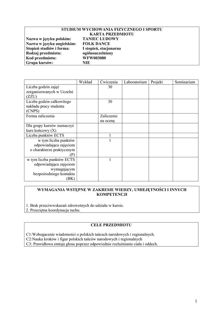 STUDIUM WYCHOWANIA FIZYCZNEGO I SPORTU KARTA PRZEDMIOTU Nazwa w języku polskim: TANIEC LUDOWY Nazwa w języku angielskim: FOLK DANCE Stopień studiów i forma: I stopień, stacjonarna Rodzaj przedmiotu: ogólnouczelniany Kod przedmiotu: WFW003080 Grupa kursów: NIE Wykład Liczba godzin zajęć zorganizowanych w Uczelni (ZZU) Liczba godzin całkowitego nakładu pracy studenta (CNPS) Forma zaliczenia Dla grupy kursów zaznaczyć kurs końcowy (X) Liczba punktów ECTS w tym liczba punktów odpowiadająca zajęciom o charakterze praktycznym (P) w tym liczba punktów ECTS odpowiadająca zajęciom wymagającym bezpośredniego kontaktu (BK) Ćwiczenia 30 Laboratorium Projekt Seminarium 30 Zaliczenie na ocenę 1 1 1 WYMAGANIA WSTĘPNE W ZAKRESIE WIEDZY, UMIEJĘTNOŚCI I INNYCH KOMPETENCJI 1. Brak przeciwwskazań zdrowotnych do udziału w kursie. 2. Przeciętna koordynacja ruchu. CELE PRZEDMIOTU C1:Wzbogacenie wiadomości o polskich tańcach narodowych i regionalnych. C2:Nauka kroków i figur polskich tańców narodowych i regionalnych C3: Prawidłowa emisja głosu poprzez odpowiednie rozluźnianie ciała i oddech. 1 PRZEDMIOTOWE EFEKTY KSZTAŁCENIA Z zakresu wiedzy: PEK_W01 Zna podstawowe kroki i figury polskich tańców narodowych i regionalnych. PEK_W02 Posiada podstawową wiedzę teoretyczną z zakresu polskich tańców narodowych i regionalnych. PEK_WO3 Posiada wiedzę z zakresu ćwiczenia prawidłowej emisji głosu. Z zakresu umiejętności: PEK_U01 Potrafi połączyć poznane kroki i figury danego tańca oraz wykonać jego część z innymi uczestnikami kursu. PEK_U02 Potrafi zaprezentować odpowiednią postawę sceniczną potrzebną do wykonania i prezentacji polskich tańców narodowych i regionalnych na scenie. Z zakresu kompetencji społecznych: PEK_K01 Potrafi efektywnie pracować w grupie , co przekłada się na jego większą aktywność społeczną , wrażliwość i odpowiedzialność (od niego zależy pokaz tańca). TREŚCI PROGRAMOWE Forma zajęć - ćwiczenia Ćw. 1 Ćw. 2 Ćw. 3-8 Ćw. 9-14 Ćw. 15 Rola i funkcja tańca – kształcenie umiejętności łączenia ruchu z muzyką, przekazanie podstawowych wiadomości z zakresu ćwiczeń rytmicznych i elementów muzyki. Wzbogacanie wiadomości o polskich tańcach narodowych i regionalnych – geneza i rys historyczny. Nauka kroków i figur wybranych polskich tańców narodowych – poloneza, mazura, krakowiaka, oberka. Podstawowe ćwiczenia techniki tańca klasycznego. Ćwiczenia z zakresu prawidłowej emisji głosu – rozluźniania ciała, oddechu. Nauka kroków i figur wybranych polskich tańców regionalnych (tańce opolsko raciborskie, zagłębiowskie, cieszyńskie, górnego śląska, górali żywieckich i beskidzkich. Podstawowe ćwiczenia z zakresu prawidłowej emisji głosu . Ćwiczenia techniki tańca klasycznego. Prezentacja filmu o polskich strojach w których tańczono tańce narodowe i regionalne. Zaliczenie semestru. Suma godzin Liczba godzin 2 2 12 12 2 30 STOSOWANE NARZĘDZIA DYDAKTYCZNE N1. Ćwiczenia praktyczne. N2. Demonstracja prowadzącego (studenta). N3. Pokaz (prezentacja filmu). N4. Wykład. OCENA OSIĄGNIĘCIA PRZEDMIOTOWYCH EFEKTÓW KSZTAŁCENIA Oceny (F – formująca (w Numer efektu Sposób oceny osiągnięcia efektu kształcenia trakcie semestru), P – kształcenia podsumowująca (na koniec semestru) F1 PEK_W01, W02, W03 Odpowiedź ustna , frekwencja. F2 PEK_U01, U02 Frekwencja, test. P Frekwencja, aktywność i postawa na zajęciach , średnia z ocen F1 i F2. 2 LITERATURA PODSTAWOWA I UZUPEŁNIAJĄCA LITERATURA PODSTAWOWA: [1] Bazielich B.: Śląskie stroje ludowe. Katowice 1988. [2] Piskorz-Branekova E.: Polskie stroje ludowe. Warszawa 1989. [3] Jachymek J.: Korowodem roztańczonym. Lublin 1991. [4] Tańce Polskie. Kalejdoskop, Fundacja artystyczna, Warszawa 1994. [5] Tańce i stroje ludowe – www.jedliniok.up.wroc.pl. LITERATURA UZUPEŁNIAJĄCA: [1] Sulima R.: Folklor i Literatura. Warszawa 1985. OPIEKUN PRZEDMIOTU (IMIĘ, NAZWISKO, ADRES E-MAIL) Henryk Brzezicki, [email protected] MACIERZ POWIĄZANIA EFEKTÓW KSZTAŁCENIA DLA PRZEDMIOTU TANIEC LUDOWY Przedmiotowy Odniesienie przedmiotowego Cele Treści Numer narzędzia efekt efektu do efektów kształcenia przedmiotu** programowe** dydaktycznego** kształcenia zdefiniowanych dla obszarowych efektów kształcenia C2 Ćw. 3-14 N1 C1 N3, N4 C3 Ćw. 1-2, Ćw. 15 Ćw. 3-14 Potrafi połączyć poznane kroki i PEK_U01 (umiejętności) figury danego tańca oraz wykonać jego część z innymi uczestnikami PEK_U02 kursu jednocześnie prezentując odpowiednią postawę sceniczną potrzebną do właściwej prezentacji polskich tańców narodowych i regionalnych na scenie. C1, C2,C3 Ćw. 1-14 N1, N4 C1, C2,C3 Ćw. 1-14 N1, N4 Promuje kulturowe znaczenie PEK_K01 (kompetencje) polskich tańców ludowych przejawiając większą aktywność społeczną . ** - z tabel powyżej C1, C2,C3 Ćw. 1-14 N1, N4 PEK_W01 (wiedza) PEK_W02 PEK_W03 Posiada podstawową wiedzę teoretyczną i praktyczną z zakresu znajomości polskich tańców narodowych i regionalnych oraz ćwiczeń prawidłowej emisji głosu. N1, N4 3