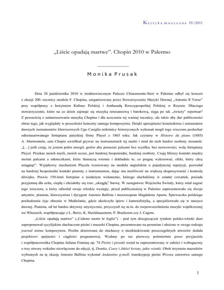 Kr y t y k a m u z y c z n a IV/2011 „Liście opadają martwe”. Chopin 2010 w Palermo Monika Prusak Dnia 28 października 2010 w średniowiecznym Palazzo Chiaramonte-Steri w Palermo odbył się koncert z okazji 200. rocznicy urodzin F. Chopina, zorganizowany przez Stowarzyszenie Muzyki Dawnej „Antonio Il Verso” przy współpracy z Instytutem Kultury Polskiej i Ambasadą Rzeczypospolitej Polskiej w Rzymie. Dlaczego stowarzyszenie, które na co dzień zajmuje się muzyką renesansową i barokową, sięga po tak „świeży” repertuar? Z pewnością z zainteresowania muzyką Chopina i dla uczczenia tej ważnej rocznicy, ale także aby dać publiczności obraz tego, jak wyglądały w przeszłości koncerty samego kompozytora. Dzięki uprzejmości konstruktora i restauratora dawnych instrumentów klawiszowych Ugo Casiglia miłośnicy historycznych wykonań mogli tego wieczoru posłuchać odrestaurowanego fortepianu paryskiej firmy Pleyel z 1865 roku. Jak czytamy w Histoire du piano (1885) A. Marmontela, sam Chopin uwielbiał grywać na instrumentach tej marki i miał do nich bardzo osobisty stosunek: „[…] jeśli czuję, że jestem pełen energii, gotów aby poruszać palcami bez wysiłku, bez nerwowości, wolę fortepiany Pleyel. Przekaz moich myśli, moich uczuć, jest bardziej bezpośredni, bardziej osobisty. Czuję bliższy kontakt między moimi palcami a młoteczkami, które tłumaczą wiernie i dokładnie to, co pragnę wykreować, efekt, który chcę osiągnąć”. Wyjątkowy mechanizm Pleyela wzorowany na modelu angielskim o pojedynczej repetycji, pozwalał na bardziej bezpośredni kontakt pianisty z instrumentem, dając mu możliwość na większą ekspresywność i kontrolę dźwięku. Prawie 150-letni fortepian o niedużym wolumenie, którego słuchaliśmy w ostatni czwartek, posiada przyjemną dla ucha, ciepłą i chciałoby się rzec „okrągłą” barwę. W zastępstwie Wojciecha Świtały, który miał zagrać tego wieczoru, a który odwołał swoje włoskie występy, przed publicznością w Palermo zaprezentowało się dwoje artystów, pianista, klawesynista i dyrygent Antonio Ballista i mezzosopran Magdalena Aparta. Śpiewaczka polskiego pochodzenia żyje obecnie w Mediolanie, gdzie ukończyła śpiew i kameralistykę, a specjalizowała się w muzyce dawnej. Pianista, od lat bardzo aktywny artystycznie, przyczynił się m.in. do rozpowszechnienia muzyki współczesnej we Włoszech, współpracując z L. Berio, K. Stockhausenem, P. Boulezem czy J. Cagem. „Liście opadają martwe” („Cadono morte le foglie”) – pod tym druzgocącym tytułem polsko-włoski duet zaproponował sycylijskim słuchaczom pieśni i mazurki Chopina, prezentowane na przemian i ułożone w swego rodzaju journal intime kompozytora. Prośba skierowana do słuchaczy o nieoklaskiwanie poszczególnych utworów dodała projektowi spójności i ciągłości programowej. Wydany po raz pierwszy pośmiertnie przez przyjaciela i współpracownika Chopina Juliana Fontanę op. 74 Pieśni i piosnki został tu zaprezentowany w całości i wzbogacony o trzy utwory wokalne niewłączone do edycji, tj. Dumka, Czary i Jakież kwiaty, jakie wianki. Obok trzynastu mazurków wybranych na tę okazję Antonio Ballista wykonał Andantino g-moll, transkrypcję pieśni Wiosna autorstwa samego Chopina. 1 Kr y t y k a m u z y c z n a IV/2011 Koncert rozpoczęła jedna z najbardziej popularnych pieśni Życzenie [op. 74 nr 1, sł. S. Witwicki], pozornie wesoła piosnka w wykonaniu Magdaleny Aparty zabrzmiała bardzo melancholijnie i żałośnie, w porównaniu z którą charakter następującej po niej, bardziej lirycznej Wiosny [op. 74 nr 2, sł. S. Witwicki] wydał się prawie taneczny. Dwa utwory fortepianowe, Mazurek d-moll i wspomniane wyżej Andantino g-moll, wprowadziły moment zadumy, z którego wyrwała słuchaczy skoczna i rubaszna Hulanka [op. 74 nr 4, sł. S. Witwicki] poprzedzająca Mazurek B-dur (druga wersja) o równie ludowym charakterze. Kolejna kompozycja to powrót do nostalgii, pieśń Nie ma czego trzeba [op. 74 nr 13, sł. B. Zaleski], którą solistka potraktowała ze słuszną prostotą i liryzmem. Następujący po niej Mazurek B-dur op. 7 nr 1, choć dobrze znany, dzięki ciemnej barwie fortepianu Pleyel zabrzmiał nostalgicznie i wyjątkowo. Kolejne cztery kompozycje to teatralna Piosnka litewska [op. 74. nr 16, sł. lud. litewskie, przekł. L. Osiński], Mazurek D-dur, pieśń Gdzie lubi [op. 74 nr 5, sł. S. Witwicki] i kolejny Mazurek D-dur, utrzymane w podobnym żywym tempie i charakterze. Następująca po nich pieśń Precz z moich oczu [op. 74 nr 6, sł. A. Mickiewicz] to jeden z najciekawszych i najczęściej wykonywanych utworów ze zbioru. Głos Magdaleny Aparty wydał się tu jednak zbyt mało ekspresyjny, szczególnie w pierwszej części utworu zabrakło wskazanego przez kompozytora appassionato. Pełen dramatyzmu i kontrastów dynamicznych Mazurek cis-moll op. 30 nr 4 ustąpił miejsca krótkiej i smutnej Dumce [op. posth., sł. B. Zaleski]. W kolejnej pieśni Narzeczony [op. 74 nr 15, sł. S. Witwicki] pochody chromatyczne fortepianu zbudowały charakter utworu na zmianę ze strofami głosu, również tutaj osobliwą rolę odegrała ciemna barwa instrumentu. Pierwszą część koncertu zamknęły dwie kompozycje pełne nostalgii i zadumy: Mazurek f-moll op. 63 nr 2, w którym Ballista dał popis pięknego rubato, i pieśń Leci liście z drzewa [op. 74 nr 17, sł. W. Pol], utwór, którego faza początkowa daje wrażenie niezwykłej przestrzeni, jaką Chopin otrzymuje poprzez, ciekawie zrealizowany przez parę artystów, efekt echa między głosem i fortepianem. Drugą część koncertu otworzył jeden z najtkliwszych mazurków Chopina, Mazurek a-moll op. 17 nr 4. Następująca po nim pieśń Pierścień [op. 74 nr 14, sł. S. Witwicki] o podobnym charakterze płynnie ustąpiła miejsca kolejnej Śliczny chłopiec [op. 74 nr 8, sł. B. Zaleski], która została wykonana z 