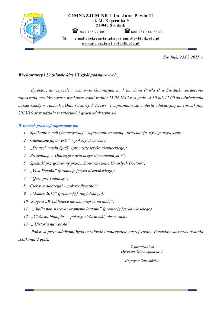 GIMNAZJUM NR 1 im. Jana Pawła II ul . M . K ope r ni k a 9 21-040 Świ dni k 0 8 1 4 6 8 77 0 0 fa x : 0 8 1 4 6 8 7 7 0 2 e- ma i l : s e kr e t a ri a t. g i mn a zj u m1 @s wi d n i k. e d u . p l www. g i mn a zj u m1 . s wi d n i k. e d u . p l Świdnik, 23.03.2015 r. Wychowawcy i Uczniowie klas VI szkół podstawowych, dyrektor, nauczyciele i uczniowie Gimnazjum nr 1 im. Jana Pawła II w Świdniku serdecznie zapraszają uczniów wraz z wychowawcami w dniu 15.04.2015 r. o godz. 8.30 lub 11.00 do odwiedzenia naszej szkoły w ramach „Dnia Otwartych Drzwi” i zapoznania się z ofertą edukacyjną na rok szkolny 2015/16 oraz udziału w zajęciach i grach edukacyjnych. W ramach promocji zapraszamy na: 1. Spotkanie w sali gimnastycznej – zapoznanie ze szkołą - prezentacja, występ artystyczny; 2. Chemiczne fajerwerki” - pokazy chemiczne; 3. „Deutsch macht Spaβ” (promocję języka niemieckiego); 4. Prezentację „ Dlaczego warto uczyć się matematyki ?”; 5. Spektakl przygotowany przez„ Stowarzyszenie Umarłych Poetów”; 6. „Viva España” (promocję języka hiszpańskiego); 7. “Quiz przyrodniczy”; 8. Ciekawe dlaczego? – pokazy fizyczne”; 9. „Oskary 2015” (promocję j. angielskiego); 10. Zajęcia „W bibliotece nie ma miejsca na nudę”; 11. „ Italia non si trova veramente lontano” (promocję języka włoskiego) 12. „Ciekawa biologia” – pokazy, ciekawostki, obserwacje; 13. „ Historia na wesoło” Państwa przewodnikami będą uczniowie i nauczyciele naszej szkoły. Przewidywany czas trwania spotkania 2 godz. Z poważaniem Dyrektor Gimnazjum nr 1 Krystyna Zarosińska