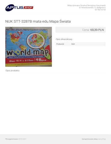 Sklep dziecięcy Smykuś Remigiusz Kaczmarek ul. Nowotoruńska 12, Bydgoszcz 52 362 02 63 NUK STT-3287B mata edu.Mapa Świata Cena: 69,39 PLN Opis słownikowy Producent NUK Opis produktu Plik wygenerowano: 03-03-2017 Powered by TCPDF (www.tcpdf.org) Oprogramowanie sklepu: AptusShop