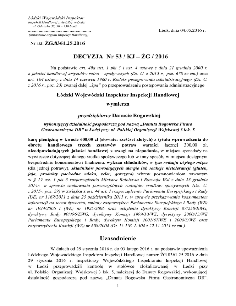 Łódzki Wojewódzki Inspektor Inspekcji Handlowej z siedzibą w Łodzi ul. Gdańska 38, 90 – 730 Łódź Łódź, dnia 04.05.2016 r. ..................................................... (oznaczenie organu Inspekcji Handlowej) Nr akt: ŻG.8361.25.2016 DECYZJA Nr 53 / KJ – ŻG / 2016 Na podstawie art. 40a ust. 1 pkt 3 i ust. 4 ustawy z dnia 21 grudnia 2000 r. o jakości handlowej artykułów rolno – spożywczych (Dz. U. z 2015 r., poz. 678 ze zm.) oraz art. 104 ustawy z dnia 14 czerwca 1960 r. Kodeks postępowania administracyjnego (Dz. U. z 2016 r., poz. 23) zwanej dalej „kpa” po przeprowadzeniu postępowania administracyjnego Łódzki Wojewódzki Inspektor Inspekcji Handlowej wymierza przedsiębiorcy Danucie Rogowskiej wykonującej działalność gospodarczą pod nazwą „Danuta Rogowska Firma Gastronomiczna DR” w Łodzi przy ul. Polskiej Organizacji Wojskowej 3 lok. 5 karę pieniężną w kwocie 600,00 zł (słownie: sześćset złotych) z tytułu wprowadzenia do obrotu handlowego trzech zestawów potraw wartości łącznej 300,00 zł, nieodpowiadających jakości handlowej z uwagi na niepodanie, w miejscu sprzedaży na wywieszce dotyczącej danego środka spożywczego lub w inny sposób, w miejscu dostępnym bezpośrednio konsumentowi finalnemu, wykazu składników, w tym rodzaju użytego mięsa (dla jednej potrawy), składników powodujących alergie lub reakcje nietolerancji (gluten, jaja, produkty pochodne mleka, seler, gorczyca) wbrew postanowieniom zawartym w § 19 ust. 1 pkt 3 rozporządzenia Ministra Rolnictwa i Rozwoju Wsi z dnia 23 grudnia 2014r. w sprawie znakowania poszczególnych rodzajów środków spożywczych (Dz. U. z 2015r. poz. 29) w związku z art. 44 ust. 1 rozporządzenia Parlamentu Europejskiego i Rady (UE) nr 1169/2011 z dnia 25 października 2011 r. w sprawie przekazywania konsumentom informacji na temat żywności, zmiany rozporządzeń Parlamentu Europejskiego i Rady (WE) nr 1924/2006 i (WE) nr 1925/2006 oraz uchylenia dyrektywy Komisji 87/250/EWG, dyrektywy Rady 90/496/EWG, dyrektywy Komisji 1999/10/WE, dyrektywy 2000/13/WE Parlamentu Europejskiego i Rady, dyrektyw Komisji 2002/67/WE i 2008/5/WE oraz rozporządzenia Komisji (WE) nr 608/2004 (Dz. U. UE. L 304 z 22.11.2011 ze zm.). Uzasadnienie W dniach od 29 stycznia 2016 r. do 03 lutego 2016 r. na podstawie upoważnienia Łódzkiego Wojewódzkiego Inspektora Inspekcji Handlowej numer ŻG.8361.25.2016 z dnia 29 stycznia 2016 r. inspektorzy Wojewódzkiego Inspektoratu Inspekcji Handlowej w Łodzi przeprowadzili kontrolę w stołówce zlokalizowanej w Łodzi przy ul. Polskiej Organizacji Wojskowej 3 lok. 5, należącej do Danuty Rogowskiej, wykonującej działalność gospodarczą pod nazwą „Danuta Rogowska Firma Gastronomiczna DR”. 1 Kontrolę przeprowadzono na podstawie przepisów art. 3 ust. 1 - 3 rozporządzenia Parlamentu Europejskiego i Rady (WE) nr 882/2004 z dnia 29 kwietnia 2004 r. w sprawie kontroli urzędowych przeprowadzanych w celu sprawdzenia zgodności z prawem paszowym i żywnościowym oraz regułami dotyczącymi zdrowia zwierząt i dobrostanu zwierząt (Dz. U. L 165 z 30.4.2004 r. ze zm.), art. 17 ust. 3 ustawy z dnia 21 grudnia 2000 r. o jakości handlowej artykułów rolno-spożywczych (Dz. U. z 2015 r., poz. 678 ze zm.), art. 24 ust. 1 rozporządzenia Parlamentu Europejskiego i Rady (WE) nr 1935/2004 z dnia 27 października 2004 r. w sprawie materiałów i wyrobów przeznaczonych do kontaktu z żywnością oraz uchylającego dyrektywy 80/590/EWG (Dz. U. z 27.10.2004 s. 4 ze zm.) w związku z art. 3 ust. 1 pkt 6 oraz art. 3 ust. 1 pkt 1, 2 ustawy z dnia 15 grudnia 2000 r. o Inspekcji Handlowej (Dz. U. z 2014 r., poz. 148 ze zm.) w obecności kontrolowanego przedsiębiorcy Danuty Rogowskiej. Celem sprawdzenia jakości potraw oraz prawidłowości oznakowania i rzetelności przekazywanych o nich informacji, inspektorzy występując w charakterze nabywców zakupili potrawy deklarowane w cenniku jako „filet z ryby w jajku, ziemniaki, surówka z kiszonej kapusty” w cenie 9,50 zł, „placki ziemniaczane ze śmietaną” w cenie 9,50 zł. Filet z ryby w jajku pobrano do badań laboratoryjnych celem dokonania identyfikacji gatunku ryby (deklaracja ustna miruna), zaś pozostałe potrawy poddano ocenie organoleptycznej na miejscu [próbki pobrano na podstawie art. 16 ust. 1 pkt 10 i rozdziału 6 ustawy z dnia 15 grudnia 2000 r. o Inspekcji Handlowej (Dz. U. z 2014 r. poz. 148 ze zm.)]. Przeprowadzone badania laboratoryjne oraz ocena organoleptyczna nie wykazały nieprawidłowości. Dokonane natomiast w miejscu sprzedaży oględziny wykazały nieprawidłowości w oznakowaniu trzech zestawów potraw oferowanych w cenie 10 zł (zestaw studencki), w tym dań pochodzących z zakupu, wartości łącznej 300,00 zł zadeklarowanych w menu na dzień 29.01.2016 r. jako: Zestaw I: (15 porcji) 300g Owocowa z makaronem, 100 g Filet z ryby w jajku, 200 g Ziemniaki, 100g Surówka z kiszonej kapusty, 200 g Kompot, Zestaw II: (10 porcji) 300g Jarzynowa z ziemniakami, 100 g Sztuka mięsa w sosie musztardowym, 200 g Ziemniaki, 100 g Buraczki zasmażane, 200 g Kompot”, Zestaw III: (5 porcji) 300 g Zupa, 250 g 250 g Placki ziemniaczane ze śmietaną, 200 g Kompot”. 2 W wyniku dokonania powyższych czynności stwierdzono, że w miejscu sprzedaży na wywieszce dotyczącej danego środka spożywczego lub w inny sposób w miejscu dostępnym bezpośrednio konsumentowi finalnemu, przedsiębiorca nie podał wykazu składników, w tym rodzaju użytego mięsa dla potrawy deklarowanej jako sztuka mięsa w sosie musztardowym), składników powodujących alergie lub reakcje nietolerancji (gluten, jaja, produkty pochodne mleka, seler, gorczyca) obecnych w gotowych wyrobach. Brak powyższych informacji narusza postanowienia § 19 ust. 1 pkt 3 rozporządzenia Ministra Rolnictwa i Rozwoju Wsi z dnia 23 grudnia 2014 r. w sprawie znakowania poszczególnych rodzajów środków spożywczych (Dz. U. z 2015 r. poz. 29
