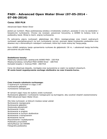 PADI - Advanced Open Water Diver (07-05-2014 07-06-2014) Cena: 850 PLN Advanced Open Water Diver Jesteś już nurkiem. Masz podstawową wiedzę o środowisku wodnym, pozwala Ci ona na swobodne i bezpieczne nurkowanie. Chcesz się rozwijać, poszerzać horyzonty, a AOWD to kolejny krok w podwodny świat. Mniej tu teorii, więcej nurkowania. Po zaliczeniu pięciu nurkowań: głębokiego (do 30m), nawigacyjnego oraz trzech wybranych nurkowań specjalizacyjnych (w tym nurkowanie nocne), poznasz lepiej środowisko podwodne oraz dowiesz się o różnorodnych rodzajach nurkowań, które być może staną się Twoją pasją. Kurs AOWD zwiększy twoje uprawnienia nurkowe do głębokości 30 m, i udoskonali twoją technikę poruszania się pod wodą. Dodatkowe koszty: Materiały szkoleniowe -podręcznik AOWD PADI - 150 PLN Międzynarodowy certyfikat PADI AOWD Diver - 180 PLN Komplet książka + licencja PADI - 260 PLN Cena nie obejmuje dojazdu, noclegów oraz wyżywienia w części na wodach otwartych. W cenie koszt wypożyczenia suchego skafandra na czas trwania kursu. Czas trwania szkolenia nurkowego: 5 wybranych nurkowań w ciągu 2 dni nurkowanie głębokie nurkowanie nawigacyjne W ramach zajęć masz do wyboru wiele nurkowań. Nurkowanie głębokie i nurkowanie nawigacyjne są wymagane, aby uzyskać stopień zaawansowany PADI Advanced Open Water Diver. Oto lista nurkowań, w których możesz wziąć udział: Nurkowanie nawigacyjne Nurkowanie głębokie Doskonała pływalność Nurkowanie z łodzi Nurkowanie w prądzie Nurkowanie w suchym skafandrze Nurkowanie z komputerem Nurkowanie nocne Poszukiwanie i wydobywanie Podwodny przyrodnik Identyfikacja ryb AWARE Fotografia podwodna Filmowanie podwodne Nurkowanie wrakowe Nurkowanie na wysokości Nurkowanie na skuterze Egzamin końcowy: Każdy kursant otrzymujący licencję Advanced Open Water Diver musi zdać uprzednio egzamin końcowy z wynikiem przynajmniej 80%. Licencja: Licencja Advanced Open Water Diver upoważnia jej posiadacza do samodzielnego nurkowania z nurkiem o podobnych uprawnieniach lub z wyższym stopniem do głębokości 30 metrów. Uzyskiwane uprawnienia: certyfikat PADI Advanced Open Water Diver nurkowanie głębokie do 30 metrów nurkowanie nocne, wrakowe, nawigacyjne… SCUBA SERVICE - VERTIGO UL. STOCZNIOWCÓW 9, 03-982 WARSZAWA email: [email protected] tel: +48 (22) 869 24 50 www.scubaservice.com.pl Powered by TCPDF (www.tcpdf.org)