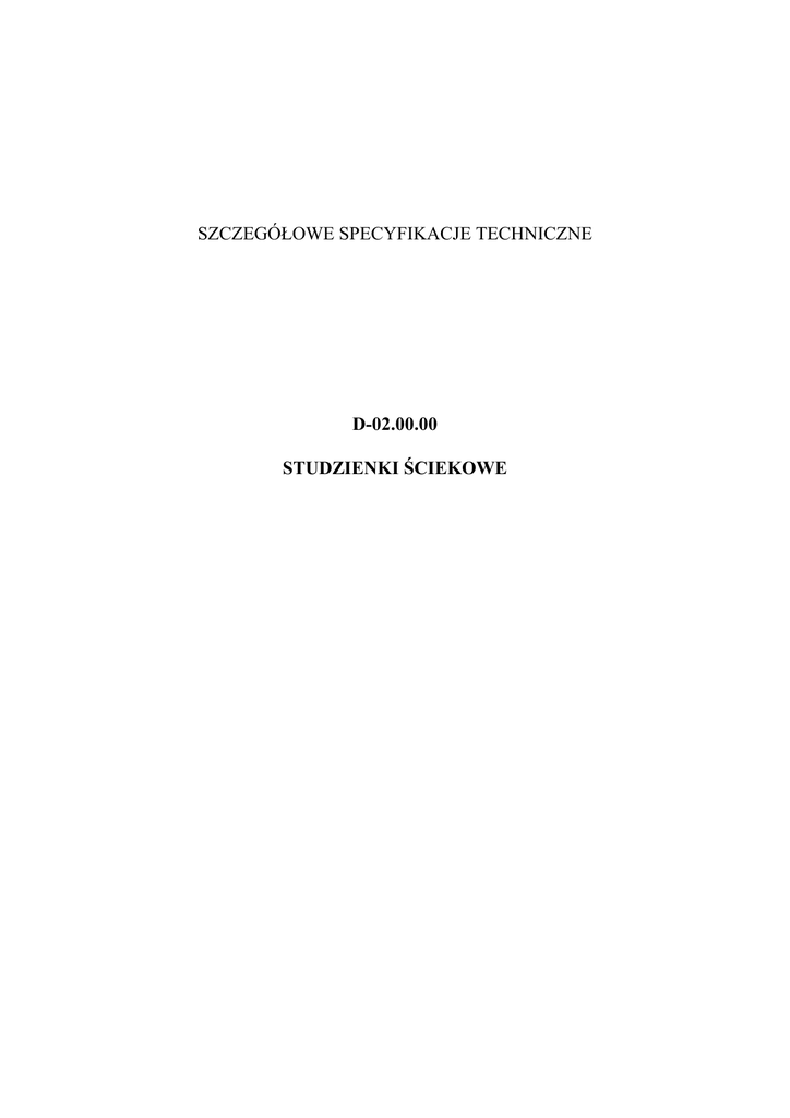 SZCZEGÓŁOWE SPECYFIKACJE TECHNICZNE D-02.00.00 STUDZIENKI ŚCIEKOWE 1. WSTĘP 1.1. Przedmiot ST Przedmiotem niniejszej specyfikacji technicznej (ST), są wymagania dotyczące wykonania i odbioru nawierzchni z wykonaniem studni betonowych kanalizacji deszczowej. 1.2. Zakres stosowania ST ST jest stosowana jako dokument przetargowy i kontraktowy przy zlecaniu i realizacji robót wymienionych w p. 1.1. 1.3. Zakres robót objętych ST ST obejmuje wszystkie roboty związane z wykonaniem, kontrolą i odbiorem wykonania studni betonowych kanalizacji deszczowej. 1.4. Określenia podstawowe 1.4.1. Kanał - liniowa budowla przeznaczona do grawitacyjnego odprowadzania ścieków. 1.4.2. Kanał deszczowy - kanał przeznaczony do odprowadzania ścieków opadowych. 1.4.3. Przykanalik - kanał przeznaczony do połączenia wpustu deszczowego z siecią kanalizacji deszczowej. 1.4.4. Wpust deszczowy - urządzenie do odbioru ścieków opadowych, spływających do kanału z utwardzonych powierzchni terenu. 1.4.5. Komora robocza - zasadnicza część studzienki lub komory przeznaczona do czynności eksploatacyjnych. Wysokość komory roboczej jest to odległość pomiędzy rzędną dolnej powierzchni płyty lub innego elementu przykrycia studzienki lub komory, a rzędną spocznika. 1.4.6. Komin włazowy - szyb połączeniowy komory roboczej z powierzchnią ziemi, przeznaczony do zejścia obsługi do komory roboczej. 1.4.7. Płyta przykrycia studzienki lub komory - płyta przykrywająca komorę roboczą. 1.4.8. Właz kanałowy - element żeliwny przeznaczony do przykrycia podziemnych studzienek rewizyjnych lub komór kanalizacyjnych, umożliwiający dostęp do urządzeń kanalizacyjnych. 1.4.9. Kineta - wyprofilowany rowek w dnie studzienki, przeznaczony do przepływu w nim ścieków. 1.4.10. Spocznik - element dna studzienki lub komory kanalizacyjnej pomiędzy kinetą a ścianą komory roboczej. 1.4.11. Pozostałe określenia podstawowe są zgodne z obowiązującymi, odpowiednimi polskimi normami i z definicjami podanymi w SST D-M-00.00.00 „Wymagania ogólne” pkt 1.4. 1.5. Ogólne wymagania dotyczące robót Ogólne wymagania dotyczące robót podano w OST D-00.00.00 "Wymagania ogólne". 2. MATERIAŁY 2.1. Wymagania ogólne Ogólne wymagania dotyczące materiałów podano w OST D-00.00.00. "Wymagania ogólne". 2.2. Rury betonowe Rury betonowe ze stopką i bez stopki o średnicy od 0,20 m do 1,0 m, zgodne z BN-83/8971-06.02 [19]. 2.3. Studnie ściekowe 2.3.1. Wpusty uliczne żeliwne Wpusty uliczne żeliwne powinny odpowiadać wymaganiom PN-H-74080-01 [12] i PN-H-74080-04 [13]. 2.3.2. Kręgi betonowe prefabrykowane Na studzienki ściekowe stosowane są prefabrykowane kręgi betonowe o średnicy 50 cm, wysokości 30 cm lub 60 cm, z betonu klasy B 25, wg KB1-22.2.6 (6) [22]. 2.3.3. Pierścienie żelbetowe prefabrykowane Pierścienie żelbetowe prefabrykowane o średnicy 65 cm powinny być wykonane z betonu wibrowanego klasy B 20 zbrojonego stalą StOS. 2.3.4. Płyty żelbetowe prefabrykowane Płyty żelbetowe prefabrykowane powinny mieć grubość 11 cm i być wykonane z betonu wibrowanego klasy B 20 zbrojonego stalą StOS. 2.3.5. Płyty fundamentowe zbrojone Płyty fundamentowe zbrojone powinny posiadać grubość 15 cm i być wykonane z betonu klasy B 15. 2.3.6. Kruszywo na podsypkę Podsypka może być wykonana z tłucznia lub żwiru. Użyty materiał na podsypkę powinien odpowiadać wymaganiom stosownych norm, np. PN-B-06712 [7], PN-B-11111 [3], PN-B-11112 [4]. 2.3.7. Beton Beton hydrotechniczny B-15 i B-20 powinien odpowiadać wymaganiom BN-62/6738-07 [17]. 2.3.8. Zaprawa cementowa Zaprawa cementowa powinna odpowiadać wymaganiom PN-B-14501 [7]. 3. SPRZĘT 3.1. Wymagania ogólne dotyczące sprzętu Wymagania ogólne dotyczące sprzętu podano w OST D-00.00.00. "Wymagania ogólne" 3.2. Sprzęt do wykonania robót Wykonawca przystępujący do wykonania kanalizacji deszczowej powinien wykazać się możliwością korzystania z następującego sprzętu: − żurawi budowlanych samochodowych, − koparek przedsiębiernych, − sprzętu do zagęszczania gruntu, 4. TRANSPORT 4.1. Wymagania ogólne Ogólne wymagania dla transportu podano w OST D-00.00.00. "Wymagania ogólne". 4.2. Transport rur kanałowych Rury, zarówno kamionkowe jak i betonowe, mogą być przewożone dowolnymi środkami transportu w sposób zabezpieczający je przed uszkodzeniem lub zniszczeniem. Wykonawca zapewni przewóz rur w pozycji poziomej wzdłuż środka transportu, z wyjątkiem rur betonowych o stosunku średnicy nominalnej do długości, większej niż 1,0 m, które należy przewozić w pozycji pionowej i tylko w jednej warstwie. Wykonawca zabezpieczy wyroby przewożone w pozycji poziomej przed przesuwaniem i przetaczaniem pod wpływem sił bezwładności występujących w czasie ruchu pojazdów. Przy wielowarstwowym układaniu rur górna warstwa nie może przewyższać ścian środka transportu o więcej niż 1/3 średnicy zewnętrznej wyrobu (rury kamionkowe nie wyżej niż 2 m). Pierwszą warstwę rur kielichowych należy układać na podkładach drewnianych, zaś poszczególne warstwy w miejscach stykania się wyrobów należy przekładać materiałem wyściółkowym (o grubości warstwy od 2 do 4 cm po ugnieceniu). 4.3. Transport kręgów Transport kręgów powinien odbywać się samochodami w pozycji wbudowania lub prostopadle do pozycji wbudowania. Dla zabezpieczenia przed uszkodzeniem przewożonych elementów, Wykonawca dokona ich usztywnienia przez zastosowanie przekładek, rozporów i klinów z drewna, gumy lub innych odpowiednich materiałów. 4.4. Transport wpustów żeliwnych Skrzynki lub ramki wpustów mogą być przewożone dowolnymi środkami transportu w sposób zabezpieczony przed przesuwaniem się podczas transportu. 4.5. Transport mieszanki betonowej Do przewozu mieszanki betonowej Wykonawca zapewni takie środki transportowe, które nie spowodują segregacji składników, zmiany składu mieszanki, zanieczyszc
