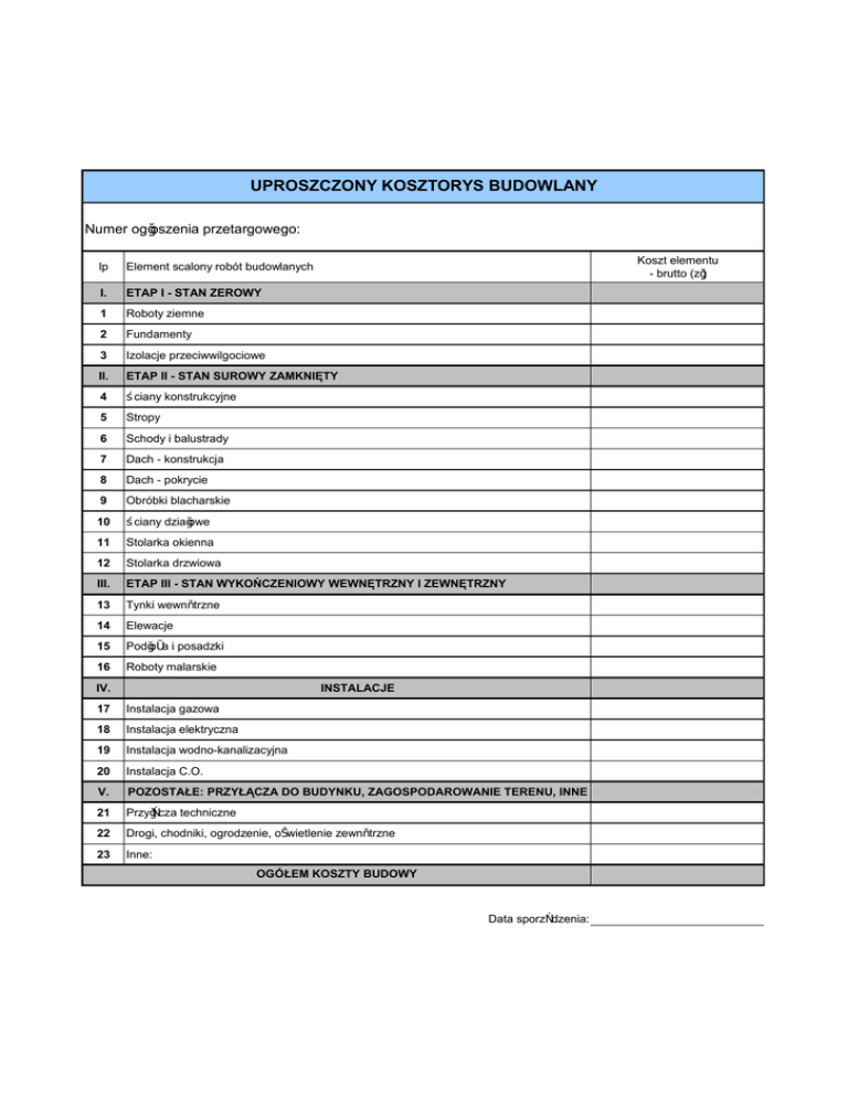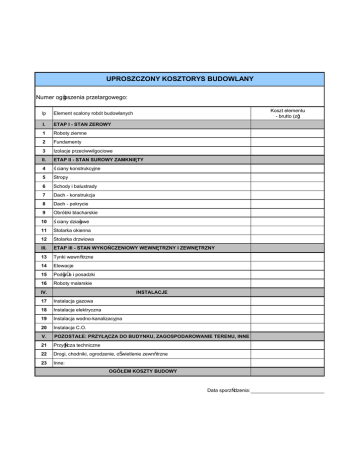UPROSZCZONY KOSZTORYS BUDOWLANY Numer ogłoszenia przetargowego: Koszt elementu - brutto (zł) lp Element scalony robót budowlanych I. ETAP I - STAN ZEROWY 1 Roboty ziemne 2 Fundamenty 3 Izolacje przeciwwilgociowe II. ETAP II - STAN SUROWY ZAMKNIĘTY 4 Ściany konstrukcyjne 5 Stropy 6 Schody i balustrady 7 Dach - konstrukcja 8 Dach - pokrycie 9 Obróbki blacharskie 10 Ściany działowe 11 Stolarka okienna 12 Stolarka drzwiowa III. ETAP III - STAN WYKOŃCZENIOWY WEWNĘTRZNY I ZEWNĘTRZNY 13 Tynki wewnętrzne 14 Elewacje 15 Podłoża i posadzki 16 Roboty malarskie IV. INSTALACJE 17 Instalacja gazowa 18 Instalacja elektryczna 19 Instalacja wodno-kanalizacyjna 20 Instalacja C.O. V. POZOSTAŁE: PRZYŁĄCZA DO BUDYNKU, ZAGOSPODAROWANIE TERENU, INNE 21 Przyłącza techniczne 22 Drogi, chodniki, ogrodzenie, oświetlenie zewnętrzne 23 Inne: OGÓŁEM KOSZTY BUDOWY Data sporządzenia: