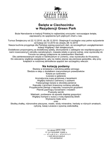 Święta w Ciechocinku w Rezydencji Green Park Boże Narodzenie w tradycji Polskiej to najbardziej uroczyste i wzruszające święta, zapraszamy do spędzenia tych pięknych chwil u nas. Turnus Świąteczny od 22.12.2010. do 28.12.2010. Obejmuje 6 noclegów oraz pełne wyżywienie od kolacji 22.12.2010 do obiadu 28.12.2010 Nasza kuchnia przygotuje dla Państwa szereg pysznych dań, ze szczególnym uwzględnieniem kolacji Wigilijnej i dań świątecznych. Dodatkowo proponujemy,za dodatkową opłatą, skorzystanie z zabiegów we współpracującym z nami nowoczesnym ośrodku sanatoryjnym, masaże,relaks w grocie solnej, oraz wycieczkę do Torunia na zakupy połączone ze zwiedzaniem Starówki. Dla zainteresowanych wizyta w Sanktuarium w Licheniu, oraz wycieczka do Kruszwicy. Do wieczerzy wigilijnej zasiądziemy, gdy na niebie ukarze się pierwsza gwiazdka, aby przy kolędach w rodzinnej atmosferze spędzić ten szczególny wieczór. Na kolację podamy Śledzia w śmietanie z odrobiną jabłka winnego Śledzia w oleju z dodatkiem marynowanym prawdziwków Karpia po żydowsku Łososia w galarecie Aromatyczną zupę grzybową z łazankami Wigilijny barszcz czerwony z uszkami Tradycyjnego karpia w złocistej panierce Kapustę z grochem kraszoną rumianą cebulką Przypieczone pierogi z kapustą i suszonymi grzybami Piernik pachnący korzeniami i miodem Puszysty sernik Makówki, podawane na sposób śląskiej gospodyni Wigilijny kompot z suszu z nutą wędzonej śliwki Wytrawne białe wino oraz Słodką chałkę, różnorodne pieczywa, masło, wody mineralne, herbaty w różnych smakach, cytrynę, kawę Lavazza z pyszną czekoladką W pierwszy dzień Świąt proponujemy Śniadanie Półmisek mięs pieczonych Szynka wędzona podawana na ciepło Galantyna z kurczaka Pasztet z dziczyzny Grzybki w occie Śliwki marynowane z domowej spiżarni Korniszony Sos tatarski Żurawina Chrzan Kawa i herbata Obiad Zupa kremowa z marchwi z nutą pomarańczową, podawana z siekaną cielęciną Udo z gęsi podawane z białymi kluskami i czerwoną kapustą Wytrawne czerwone wino Deser Lody śmietankowe z prażonymi migdałami, podawane na musie truskawkowym z odrobiną słodkiej śmietanki Kolacja Sałatka Szefa Kuchni Steki z polędwiczek wieprzowych w koszulkach z szynki szwarcwaldzkiej Rumiane ziemniaki Sałatka cesarska Owoce W drugi dzień Świąt na stołach pojawi się Śniadanie Vitello tonnato – cielęcina z sosem tuńczykowym Półmisek wędlin południowych Caprese z nutą octu balsamicznego i świeżą bazylią Sałatka z krewetkami Kawa latte i Herbata Sok ze świeżych pomarańcz Obiad Zupa cebulowa z grzankami Pierś z indyka podawana z fasolką szparagową, pomidorami koktajlowymi, szalotką i ryżem Wytrawne białe wino Deser Tiramisu własnego wyrobu podawane na sosie cappuccino Kolacja Filet z piersi kurczaka marynowany w occie balsamicznym z nutą czosnku, podawany na łożu z rukoli, białe pieczywo Spaghetti ze szpinakiem i suszonymi pomidorami ozdobione wiórkami sera pecorino Szaszłyk z soczystego melona i winogron. Istnieje możliwość indywidualnego ustalenia menu zgodnie z Państwa upodobaniami lub dietą. Chętnie dostosujemy się do Państwa potrzeb. Życzymy miłego pobytu! Cennik 1100 pln/osobę w Penthausie (4 do 6 osób) 1200 pln/osobę w pokojach 1,2 i 3 osobowych 1500 pln/osobę w 2 pokojowym apartamencie dla 2 osób