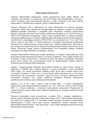 1 Memorandum Informacyjne Niniejsze Memorandum