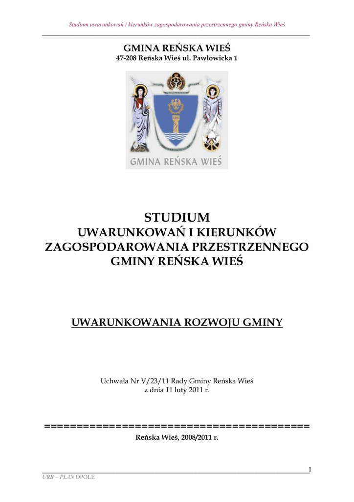 Studium uwarunkowań i kierunków zagospodarowania przestrzennego gminy Reńska Wieś ___________________________________________________________________________ GMINA REŃSKA WIEŚ 47-208 Reńska Wieś ul. Pawłowicka 1 STUDIUM UWARUNKOWAŃ I KIERUNKÓW ZAGOSPODAROWANIA PRZESTRZENNEGO GMINY REŃSKA WIEŚ UWARUNKOWANIA ROZWOJU GMINY Uchwała Nr V/23/11 Rady Gminy Reńska Wieś z dnia 11 luty 2011 r. ========================================= Reńska Wieś, 2008/2011 r. ___________________________________________________________________________1 URB – PLAN OPOLE Studium uwarunkowań i kierunków zagospodarowania przestrzennego gminy Reńska Wieś ___________________________________________________________________________ I. PRZEDMIOT I ZAKRES OPRACOWANIA 1. Przedmiot opracowania Wprowadzenie do zmiany Studium. Studium uwarunkowań i kierunków zagospodarowania przestrzennego gminy Reńska Wieś opracowane zostało na przełomie lat 1998 i 1999 i przyjęte przez Radę Gminy Reńska Wieś uchwałą Nr VII/60/99 z dnia 10 maja 1999 roku. Stosownie do wymogów ustawy z dnia 27 marca 2003 roku o planowaniu i zagospodarowaniu przestrzennym (Dz. U nr 80 .poz.717 z późn. zmianami) we wrześniu 2007 roku dokonana została ocena aktualności Studium, która wykazała potrzebę aktualizacji tego dokumentu. Obowiązek przeprowadzenia oceny aktualności Studium wynika z art. 32 ww ustawy. Zgodnie z tym artykułem oceny aktualności Studium dokonuje się na podstawie analizy zmian w zagospodarowaniu przestrzennym gminy oraz oceny postępów w opracowywaniu miejscowych planów zagospodarowania przestrzennego z uwzględnieniem: = decyzji o warunkach zabudowy i decyzji o ustaleniu lokalizacji inwestycji celu publicznego wydawanych w przypadku braku planu miejscowego, = wniosków w sprawie sporządzenia lub zmiany planu miejscowego, = wniosków samorządu gminy w sprawie kierunków rozwoju gminy. W szczególności w ocenie aktualności bada również zgodność studium z wymogami wynikającymi z przepisów art. 10 ust. 1 i 2 ustawy oraz Rozporządzenia Ministra Infrastruktury z 28 kwietnia 2004r. w sprawie zakresu projektu studium uwarunkowań i kierunków zagospodarowania przestrzennego gminy (Dz. U. z 2004 r. Nr 118 póz. 1233). Dla gminy Reńska Wieś, Studium sporządzone zostało wcześniej niż Strategia rozwoju i Plan zagospodarowania przestrzennego województwa opolskiego oraz przed określeniem polityki zawartej w Strategii rozwoju gminy Reńska Wieś. W tej sytuacji konieczna jest weryfikacja Studium wprowadzająca zmiany wynikające z dokumentów planistycznych wyższego rzędu i uchwalonych miejscowych planów zagospodarowania przestrzennego, a także wyznaczenia nowych kierunków rozwoju przestrzennego zgodnych z polityką przestrzenną uchwaloną w Strategii Rozwoju Gminy Reńska Wieś. Konieczność aktualizacji Studium wiąże się również ze zmianami prawnymi jakie nastąpiły w okresie jego obowiązywania oraz wymogiem jego dostosowania do aktualnego stanu prawnego. Studium uwarunkowań i kierunków zagospodarowania przestrzennego gminy Reńska Wieś sporządzone zostało pod rządami nieobowiązującej już ustawy o zagospodarowaniu przestrzennym z 7 lipca 1994r. Dodatkowo, od czasu jego uchwalenia weszło w życie wiele przepisów odrębnych ściśle związanych z planowaniem przestrzennym i regulujących zagadnienia uwzględniane w Studium, są to m.in.: • ustawa z dnia 27 kwietnia 2001r. Prawo ochrony środowiska (tj. Dz. U. nr 25, poz. 150 z 2008 r.). • „II Polityka Ekologiczna Państwa na lata 2003-2006 z uwzględnieniem perspektywy na lata 2007-2010 z dnia 8 maja 2003r. (M.P. Nr 33 poz.433), • Europejska Konwencja Krajobrazowa. Florencja 20 października 2000r. Ratyfikowana przez Polskę w czerwcu 2004r.(Dz. U. 2006 nr 14 póz. 98), ___________________________________________________________________________2 URB – PLAN OPOLE Studium uwarunkowań i kierunków zagospodarowania przestrzennego gminy Reńska Wieś ___________________________________________________________________________ • ustawa z dnia 16 kwietnia 2004.r o ochronie przyrody (Dz. U. 2004 nr 92 póz. 880), • ustawa z dnia 18 lipca 2001r. Prawo wodne (tekst jedn. Dz. U. Z 2005r Nr 239 poz.2019 z późn. zm.), • ustawa z dnia 6 lipca 2001 r. o ustanowieniu programu wieloletniego "Program dla Odry 2006" (Dz. U. Nr 98, póz. 1067), • ustawa z dnia 7 czerwca 2001 r. O zbiorowym zaopatrzeniu w wodę i zbiorowym odprowadzaniu ścieków (t.j. Dz. U. z 2006 r. Nr 123, póz. 858, z późn. zm., • rozporządzenie Ministra Środowiska z dnia 22 grudnia 2004r. w sprawie wyznaczania obszaru i granic aglomeracji (Dz. U. nr 283 póz. 2841), • ustawa z dnia 27 kwietnia 2001 r. O odpadach (t.j. Dz. U. z 2007 r. Nr39 poz.251 z p. zm.), • ustawa z dnia 28 marca 2003r o transporcie kolejowym (tj. Dz. U. z 2007 r. Nr 16, póz. 94.), • decyzja nr 62 Ministra Infrastruktury z dnia 26 września 2005 r. w sprawie ustalenia terenów, przez które przebiegają linie kolejowe, jako terenów zamkniętych, • ustawa z dnia 10 kwietnia 2003r o szczególnych zasadach przygotowywania i realizacji inwestycji w zakresie dróg publicznych (Dz. U. Nr 80 póz.721), • ustawa z dnia 23 lipca 2003r o ochronie zabytków i opiece nad zabytkami (Dz. U. z 2003r. Nr 162, póz. 1568), • ustawa z 3 października 2008r. o udostępnianiu informacji o środowisku i jego ochronie, udziale społeczeństwa w ochronie środowiska oraz o ocenach oddziaływania na środowisko ( Dz. U. Nr 199, poz.1227 z 2008r.). Ocena aktualności dała podstawę Radzie Gminy Reńska Wieś do podjęcia uchwały w sprawie aktualności Studium uwarunkowań i kierunków zagospodarowania przestrzennego gminy Reńska Wieś a następnie uchwały nr XVII/105/08 z dnia 26 marca 2008 roku w sprawie przystąpienia do zmiany Studium. W podjętej uchwale został określony z wnioskami wynikającymi z tej oceny. zakres zmiany Studium, zgodnie 2. Zakres studium Podstawowy
