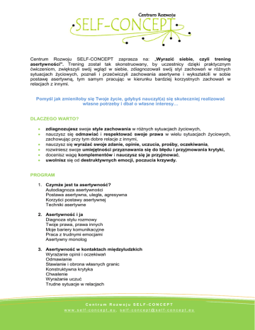 Centrum Rozwoju SELF-CONCEPT zaprasza na: „Wyrazić siebie, czyli trening asertywności". Trening został tak skonstruowany, by uczestnicy dzięki praktycznym ćwiczeniom, zwiększyli swój wgląd w siebie, zdiagnozowali swój styl zachowań w róŜnych sytuacjach Ŝyciowych, poznali i przećwiczyli zachowania asertywne i wykształcili w sobie postawę asertywną, tym samym pracując w kierunku bardziej korzystnych zachowań w relacjach z innymi. Pomyśl jak zmieniłoby się Twoje Ŝycie, gdybyś nauczył(a) się skuteczniej realizować własne potrzeby i dbał o własne interesy… DLACZEGO WARTO? • • • • • • zdiagnozujesz swoje style zachowania w róŜnych sytuacjach Ŝyciowych, nauczysz się odmawiać i respektować swoje prawa w wielu sytuacjach Ŝyciowych, zachowując przy tym dobre relacje z innymi, nauczysz się wyraŜać swoje zdanie, opinie, uczucia, prośby, oczekiwania, rozwiniesz swoje umiejętności przyznawania się do błędu i przyjmowania krytyki, docenisz wagę komplementów i nauczysz się je przyjmować, uwolnisz się od destruktywnych emocji, poczucia krzywdy. PROGRAM 1. CzymŜe jest ta asertywność? Autodiagnoza asertywności Postawa asertywna, uległa, agresywna Korzyści postawy asertywnej Techniki asertywne 2. Asertywność i ja Diagnoza stylu rozmowy Twoje prawa, prawa innych Moje bariery komunikacyjne Praca z trudnymi emocjami Asertywny monolog 3. Asertywność w kontaktach międzyludzkich WyraŜanie opinii i oczekiwań Odmawianie Stawianie i obrona własnych granic Konstruktywna krytyka Chwalenie WyraŜanie uczuć Trudne sytuacje w relacjach Centrum Rozwoju SELF-CONCEPT www.self-concept.eu, [email protected] WAśNE INFORMACJE O SZKOLENIU minimum teorii, maksimum praktyki (gry szkoleniowe, ćwiczenia indywidualne i grupowe, dyskusje, praca z kamerą, testy), przed szkoleniem program zostanie dopasowany do potrzeb uczestników biorących w nim udział (analiza przedszkoleniowa), praca na własnych sytuacjach, grupa maksymalnie 10 osób, moŜliwość konsultacji po szkoleniu. INFORMACJE ORGANIZACYJNE TERMIN: 06-07.04.2011, w godzinach: 9-17 (do uzgodnienia w drugim dniu 8-16) MIEJSCE: Łódź. Miejsce szkolenia jest uzaleŜnione od ilości uczestników, zostanie jeszcze potwierdzone przed szkoleniem. CENA: 650 PLN + 23% VAT = 799,50 PLN Cena treningu zawiera: - indywidualną analizę potrzeb i oczekiwań, - materiały szkoleniowe, - indywidualne konsultacje poszkoleniowe, - zadania rozwojowe, - lunch i serwis kawowy. RABATY: - przy jednoczesnym zgłoszeniu drugiej osoby -5%, - przy trzeciej i kaŜdej następnej -10%, - zgłoszenie do 28.03.2011 -5%. ZAPISY Zgłoszenia przyjmowane są do 04.04.2011 lub do wyczerpania miejsc. W celu zgłoszenia się na trening proszę wypełnić formularz zgłoszeniowy na stronie: http://self-concept.eu/formularz-zgloszeniowy.html lub wysłać e-mail na adres: [email protected]. Strona 2 W razie pytań proszę o kontakt bezpośrednio z trenerem: Aleksandra Mroczkowska, [email protected], Tel: 0 505 104 024. Centrum Rozwoju SELF-CONCEPT www.self-concept.eu, [email protected]