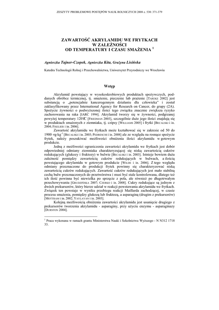 ZESZYTY PROBLEMOWE POSTĘPÓW NAUK ROLNICZYCH 2008 z. 530: 371-379 ZAWARTOŚĆ AKRYLAMIDU WE FRYTKACH W ZALEśNOŚCI OD TEMPERATURY I CZASU SMAśENIA 1 Agnieszka Tajner-Czopek, Agnieszka Kita, GraŜyna Lisińska Katedra Technologii Rolnej i Przechowalnictwa, Uniwersytet Przyrodniczy we Wrocławiu Wstęp Akrylamid powstający w wysokoskrobiowych produktach spoŜywczych, poddanych obróbce termicznej, tj. smaŜenie, pieczenie lub praŜenie [TAREKE 2002] jest substancją o „potencjalnie kancerogennym działaniu dla człowieka” i został zaklasyfikowany przez International Agency for Research on Cancer, do grupy (2A). SpoŜycie Ŝywności o podwyŜszonej ilości tego związku znacznie zwiększa ryzyko zachorowania na raka [IARC 1994]. Akrylamid tworzy się w Ŝywności, podgrzanej powyŜej temperatury 120°C [FRIEDMAN 2003], szczególnie duŜe jego ilości znajdują się w produktach smaŜonych z ziemniaka, tj. czipsy [WILLIAMS 2005] i frytki [BECALSKI i in. 2004; FISELIER i in. 2006]. Zawartość akrylamidu we frytkach moŜe kształtować się w zakresie od 50 do 1900 µg⋅kg-1 [BECALSKI i in. 2003; PEDRESCHI i in. 2008] ale ze względu na rosnące spoŜycie frytek, naleŜy poszukiwać moŜliwości obniŜenia ilości akrylamidu w gotowym produkcie. Jedną z moŜliwości ograniczenia zawartości akrylamidu we frytkach jest dobór odpowiedniej odmiany ziemniaka charakteryzującej się niską zawartością cukrów redukujących (glukozy i fruktozy) w bulwie [BECALSKI i in. 2003]. Istnieje bowiem duŜa zaleŜność pomiędzy zawartością cukrów redukujących w bulwach, a ilością powstającego akrylamidu w gotowym produkcie [WILDE i in. 2006]. Z tego względu odmiany przeznaczone do produkcji frytek powinny się charakteryzować niską zawartością cukrów redukujących. Zawartość cukrów redukujących jest mało stabilną cechą bulw przeznaczonych do przetwórstwa i musi być stale kontrolowana, dlatego teŜ ich ilość powinna być niewielka po sprzęcie z pola, ale równieŜ po długotrwałym przechowywaniu [GRUDZIŃSKA 2007; CZERKO i in. 2008]. Cukry redukujące są jednym z dwóch prekursorów, który bierze udział w reakcji powstawania akrylamidu we frytkach. Związek ten powstaje w wyniku przebiegu reakcji Maillarda zachodzącej, w czasie procesu smaŜenia, pomiędzy glukozą lub fruktozą, a asparaginą (drugim z prekursorów) [MOTTRAM i in. 2002; YAYLAYAN i in. 2003]. Kolejną moŜliwością obniŜenia zawartości akrylamidu jest usunięcie drugiego z prekursorów tworzenia akrylamidu - asparaginy, przy uŜyciu enzymu - asparaginazy [DURSTON 2004]. 1 Praca wykonana w ramach grantu Ministerstwa Nauki i Szkolnictwa WyŜszego - N N312 1718 33. 372 A. Tajner-Czopek, A. Kita, G. Lisińska Zawartość akrylamidu we frytkach zaleŜy nie tylko od właściwości surowca (zawartości cukrów redukujących), ale równieŜ od stosowanych parametrów procesu technologicznego (czas i temperatura smaŜenia). Zastosowanie wyŜszej temperatury i/lub dłuŜszego czasu smaŜenia sprzyja powstawaniu większej ilości tego związku w gotowym produkcie [ROMANI i in. 2008]. Najwięcej akrylamidu moŜe powstać w końcowym etapie smaŜenia, dlatego istotne jest odpowiednie skrócenie czasu i obniŜenie temperatury tego procesu [GROB i in. 2003]. Przebieg procesu technologicznego musi jednak uwzględniać, nie tylko ograniczenie tworzenia się akrylamidu, ale równieŜ uzyskanie gotowego produktu o odpowiednich cechach sensorycznych. Frytki powinny charakteryzować się prawidłową barwą, właściwym smakiem i zapachem, niską zawartością tłuszczu oraz chrupką konsystencją [LISIŃSKA, LESZCZYŃSKI 1989]. W pierwszej kolejności przez konsumentów oceniana jest barwa frytek, która powinna być jasna, złota, bez brązowych przebarwień lub czarnych plam i smug oraz bez brunatnych końców frytek, tzw. „sugar ends” [LISIŃSKA 2006]. W następnej kolejności oceniana jest konsystencja frytek, która stanowi wyróŜnik mający wpływ na akceptację konsumenta i decyzję o ich spoŜyciu [TAJNER-CZOPEK 2000]. Część zewnętrzna frytek powinna być delikatna, chrupka, bez odczucia twardości lub gumowatości, natomiast cześć wewnętrzna powinna być mączysta, ale nieoddzielająca się od skórki [LISIŃSKA, LESZCZYŃSKI 1989]. Wymagania konsumentów dotyczące jakości frytek są wysokie i ściśle określone, dlatego badania prowadzone w kierunku obniŜenia zawartości akrylamidu we frytkach powinny być prowadzone równieŜ z uwzględnieniem bezpieczeństwa gotowego produktu. Celem pracy było określenie wpływu temperatury i czasu smaŜenia frytek na zawartość akrylamidu w gotowym produkcie oraz na jego barwę i konsystencję. Materiał i metodyka badań Materiałem uŜytym do badań były ziemniaki odmiany Santana, pochodzące z zakładu produkującego frytki, znajdującego się w okolicach Wrocławia. Ziemniaki do czasu rozpoczęcia badań przechowywano w temperaturze 15°C. Próby ziemniaków podzielono na dwie części: pierwszą z przeznaczeniem do analiz w surowcu i drugą do sporządzenia frytek. Z ziemniaków sporządzono frytki metodą jednostopniowego smaŜenia. W tym celu bulwy pokrojono na słupki o wymiarach 10 × 10 mm, po wypłukaniu w zimnej wodzie, poddano je blanszowaniu w wodzie o temperaturze 75°C, przez 10 minut. Po osuszeniu na bibule frytki smaŜono w oleju rzepakowym, stosując róŜne temperatury (130°C, 150°C, 175°C i 190°C) i odpowiednio dobrane czasy smaŜenia (11 min, 9 min, 8 min, 7 min). Doświadczenie technologiczne prowadzono w trzech powtórzeniach. W ziemniakach oznaczono suchą substancję - metodą suszarkową (temp. 105°C) [AOAC 1995], zawartość skrobi metodą Eversa-Grossfelda w modyfikacji Hadorna-Bifera [LESZCZYŃSKI 1975] oraz zawartość cukrów ogółem i redukujących - metodą redukcyjną Nizowkina-Jemielianowej [JAROSZ i in. 1955]. We frytkach oznaczono zawartość akrylamidu metodą chromatograficzną, przy uŜyciu aparatu HPL