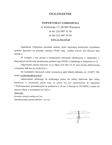 OGLOSZENIE INSPEKTORAT UZBROJENIA ul. Królewska 1/7, 00-909 Warszawa nr tel. (22) 687 33 50 nr fax (22) 687 34 44 www.iu.wp.mil.pl Inspektorat Uzbrojenia prowadzi analize rynku dotyczaçft moliwoci pozyskania systemu 1qçznoci na potrzeby operacji CSAR (ang. Combat Search and Rescue) typu HOOK 2. W zwiaLzku z tym proszç o dostarczenie informacji okrelonych w Zahiczniku 1, dotyczcych mo1iwoci dostarczenia systemu typu HOOK 2 (opisanego w Zalaczniku nr 2). Odpowiedzi proszç kierowaá na nr faksu (22) 687 34 44 oraz poczta e1ektroniczn w formacie MS doc do 30.08.20 12 r. Do kontaktów roboczych zostal wyznaczony pplk Marek Jablonka, tel. 22 6873 186, email: [email protected]; Jednoczenie informujç, ze niniejszego pisma nie naley traktowaá jako oferty handlowej w rozumieniu prawa oraz, ze pismo nie jest zaproszeniem do negocjacji z Wykonawcami, prowadzonymi na podstawie § 18 ust. 6 Decyzj i nr 291 /MON, a take nie stanowi oferty w rozumieniu art. 66 k.c. Zalgczniki: forrnularz danych analizy na 2 str. charakterystyka systemu HOOK 2 na 4 str. 8ZEA ZA SEP .-iL BROJN NSPEKT mgr RFI Zal4cznik I ,,System bcznoci HOOK 2” FORMULARZ DANYCH ANALIZY MOZLIWOSCI WYKONANIA UiSW ITT LU Szacunkowy czas realizacji zamówienia: Termin realizacji dostawy sprzçtu: Termin rozpoczçcia szkolenia instruktorów: Termin zakoñczenia szkolenia instruktorów: Termin instalacji i uruchomienia stacji bazowych: OPIS PRZYJ1TYCH ZALOZEN A. zakup systemu lqcznoci HOOK 2 spe1niajcego wymagania zawarte w RFI, B. 24 miesiçczna gwarancja. OPIS POZYCJI KOSZTOW Wartoé Lp Rodzaj Koszt Uwagi (brutto w I. Koszt pozyskania Integratora Koszt zakupu 60 szt. Radiostacji 1 AN/PRC 112 G, spe1niajacych wymagania zawarte w RFI. Koszt zakupu 2 szt. Stacji 1 2 Bazowych SBS-112, spe1niajacych wymagania zawarte w RFI. Koszt zakupu 2 szt. Interrogatora 1 3 Quickdraw 2, spe1niajacego wymagania zawarte w RFI. Koszt zakupu wyposaenia 1 4 dodatkowego, spelniajacego wymagania zawarte w RFI. Jednostkowy koszt personalizacji 1.5. Jezeli me Jest whczony radiostacji indywidualnej AN/PRC wcenç. 112G. Koszt instalacji stacji bazowych Planowana jest instalacja 1 6 stacji bazowych w 2 lokalizacj ach. Koszt przeszkolenia 3 instruktorów Calkowity koszt razem 1 7 zmaterialami. Jee1i nie jest wliczony w cenç. Koszt dokumentacji technicznej 1.8. Jee1i nie jest wliczony zgodnie z wymaganiami zawartymi w cenç. wRFI. 1.9. Koszt 24 miesiecznej gwarancji. Jee1i nie jest wliczony w cen. IL Koszty eksploatacji i wsparcia Koszt serwisowania i obslug Jee1i nie jest wliczony 2 1 technicznych w okresie gwarancji w cenç gwarancji. . . ________ . . . . . . . .. . . . . RET Zaicznik 1 ,,System L4cznoci HOOK 2” zgodnie z zaleceniami producenta. Koszt rodków materialowych i zestawu czeci niezbçdnych do zabezpieczenia eksploatacji w okresie gwarancji zgodnie z zaleceniami producenta. Koszt serwisowania i obsiug technicznych p0 okresie gwarancji zgodnie z zaleceniami producenta dia za1oonego okresu eksploatacji. 22 . 23 . Koszt rodków materialowych i zestawu czçci niezbednych do zabezpieczenia eksploatacji p0 okresie gwarancji zgodnie z zaleceniami producenta dia zaloonego okresu eksploatacj i. Koszty aktualizacji oprogramowania w calym okresie gwarancji. Koszty aktualizacji oprogramowania po okresie gwarancji dia zaloonego okresu eksploatacji. 24 . 25 . 26 III Koszty wycofania Koszt wycofania systemu z 3 1 eksploatacji. Data wypelmenia Jee1i nie jest wliczony w cenç gwarancji. Dia zaloonego minimalnego okresu eksploatacji 10 lat p0 okresie gwarancji lub propozycja Wykonawcy. Dia zaloonego minimalnego okresu eksploatacji 10 lat 0 okresie gwarancji lub propozycja Wykonawcy. Jee1i nie jest wliczony w cene gwarancji. Dia zaloonego minimalnego okresu eksploatacji 10 lat p0 okresie gwarancji lub propozycja Wykonawcy. . Podpis Wykonawcy UWAGA 1. W poszczególnych wierszach kolumny ,,Wartod” na1ey podaá cenç BRUTTO w poiskich ziotych, która powinna zawieraá podatki, cia, koszty transportu itp. Je1i ceny nie moga byá podane w poiskich ziotych, proszç zaznaczyá symbol waluty jakiej dotycz ceny: EUR dia Euro oraz USD dia dolara amerykañskiego. 2. W przypadku braku ceny prosze o podanie jednego z nastçpuj4cych symboli: W usluga oferowana w cenie wyrobu (oznacza iz koszt danej uslugi zostal uwzglçdniony w ogólnych kosztach wyrobu), N nie dotyczy (dana usluga lub systemu nie wystçpuje w ofercie). 3. W kolumnie ,,Uwagi” wskazane jest uzasadnienie wieIkoci podanych w kolumnie ,,Wartoë (brutto w ...)“. — - - — RFT Zat4cznik 2 ,,System HOOK 2” I. OPTS OGOLNY SYSTEMU System htcznoci ratunkowej HOOK 2 jest przeznaczony dia olnierzy bioracych udzial w operacjach lftdowych, morskich oraz powietrznych. Jest dedykowana do operacji MEDAVAC, QRF oraz CSAR (z ang. Combat Search and Rescue) rozumianych jako ,,bojowe poszukiwanie oraz ratowanie”: pilotów statków powietrznych zestrzelonych, bd zmuszonych do awaryjnego kidowania w przygodnym terenie w wyniku doznanych uszkodzeñ, zolnierzy siT specjalnych dzialajcych poza 1inia wroga lub innego personelu w razie potrzeb. Urzadzenie pozwala na 1edzenie dzialañ poszczególnych o1nierzy jak I calych ugrupowañ z mo1iwoci podawania ich aktualnej pozycji geograficznej (pozyskiwanej z wbudowanego GPS-a) z dodatkowymi informacjami oraz ich graficznego zobrazowania (przy wykorzystaniu dodatkowych urzqdzeñ stacji bazowych, urz4dzeñ Quick Draw, radionamierników ze specjalistycznym oprogramowaniem) MEDAVAC, ORF oraz CSAR. - - II. ELEMENTY SKLADOWE SYSTEMU W skiad 1. 2. 3. 4. III. Systemu HOOK 2 powinny wejé nastepuj4ce elementy: Indywidualna radiostacja ratownicza AN/PRC 112 G; Stacjabazowa SBS-112; Interrogator Quickdraw 2; Wyposaenie dodatkowe. OGOLNE WYMAGANIA. 1. Radiostacja AN/PRC 112 powinna spelniaá nastçpujce wymagania uytkowe: 1.1. Zapewniaá prowadzenie 1acznoci radiowej glosem w okre1onych w pkt II. zakresach czestot1iwoci (nie dotyczy 406 MHz SARSAT), praca w systemie 406 MHz SARSAT; 1.2. Realizowaá