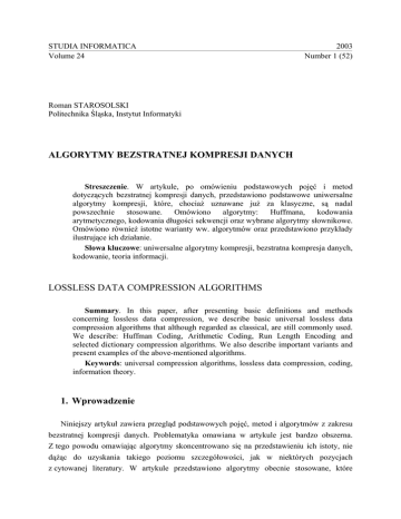 bezstratnej kompresji danych. Problematyka omawiana w artykule jest bardzo obszerna.