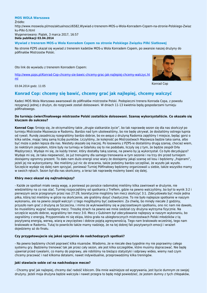 MOS WOLA Warszawa Źródło: http://www.moswola.pl/mos/aktualnosci/6582,Wywiad-z-trenerem-MOS-u-Wola-Konradem-Copem-na-stronie-Polskiego-Zwiaz ku-Pilki-S.html Wygenerowano: Piątek, 3 marca 2017, 16:57 Data publikacji 03.04.2014 Wywiad z trenerem MOS-u Wola Konradem Copem na stronie Polskiego Związku Piłki Siatkowej Na stronie PZPS ukazał się wywiad z trenerem kadetów MOS-u Wola Konradem Copem, po awansie naszej drużyny do półfinałów Mistrzostw Polski. Oto link do wywiadu z trenerem Konradem Copem: http://www.pzps.pl/Konrad-Cop-chcemy-sie-bawic-chcemy-grac-jak-najlepiej-chcemy-walczyc.ht ml 03.04.2014 godz. 11:05 Konrad Cop Konrad Cop: chcemy się bawić, chcemy grać jak najlepiej, chcemy walczyć Kadeci MOS Wola Warszawa awansowali do półfinałów mistrzostw Polski. Podopieczni trenera Konrada Copa, z powodu rezygnacji jednej z drużyn, do rozgrywek zostali dolosowani. W dniach 11-13 kwietnia będą gospodarzami turnieju półfinałowego. Do turnieju ćwierćfinałowego mistrzostw Polski zostaliście dolosowani. Szansę wykorzystaliście. Co okazało się kluczem do sukcesu? Konrad Cop: Śmieję się, że otrzymaliśmy takie „drugie siatkarskie życie”, bo tak naprawdę sezon się dla nas skończył po turnieju Mistrzostw Mazowsza w Radomiu. Bardzo nad tym ubolewaliśmy, bo nie będę ukrywał, że dostaliśmy ostrego łupnia od rywali. Rundę zasadniczą rozegraliśmy bardzo dobrze, bo ex-aequo z drużyną Radomia zajęliśmy I miejsce, będąc gorsi o kilka setów, mając taką samą liczbę punktów. Liczyliśmy, że kolejność po Mistrzostwach Mazowsza będzie taka sama, albo być może o jeden lepsza dla nas. Niestety okazało się inaczej. Po losowaniu z PZPS-ie dostaliśmy drugą szansę, chociaż wiem, że niektórym zespołom, które były na turnieju w Gdańsku się to nie podobało, liczyły się z tym, że będzie zespół Orła Międzyrzecz. Wydaje mi się, że każdy trener, który dostałby taką szansę, na pewno by ją wykorzystał. Co było decydujące? Wydaje mi się, że taka niepewność, że już trenujemy dla samego trenowania w tym sezonie i na trzy dni przed turniejem dostajemy ogromny prezent. To dało nam dużo energii oraz wiary że dostajemy jakąś szansę od losu i będziemy „frajerami”, jeżeli jej nie wykorzystamy. Nie mieliśmy już nic do stracenia, także jesteśmy bardzo szczęśliwi, że wyszło jak wyszło. Szczęście wydaje się dalej nam sprzyjać, ponieważ Turniej Półfinałowy będziemy organizowali u siebie, także wszystko mamy w swoich rękach. Sezon był dla nas skończony, a teraz tak naprawdę możemy bawić się dalej. Który mecz okazał się najtrudniejszy? - Każde ze spotkań miało swoją wagę, a ponieważ po porażce radomskiej mieliśmy kilka zawirowań w drużynie, nie wiedzieliśmy na co nas stać. Turniej rozpoczęliśmy od spotkania z Treflem, gdzie na pewno walczyliśmy, bo był to wynik 3:2 i pierwszym secie przegranym przez nas 27:29, teoretycznie mogliśmy ten mecz skończyć 3:1. Zdecydowała być może jedna piłka, którą też mieliśmy w górze na skończenie, ale graliśmy dosyć chaotycznie. To nie było najlepsze spotkanie w naszym wykonaniu, ale na pewno zespół walczył i z tego moglibyśmy być zadowoleni. Za chwilę, bo minęły niecałe 2 godziny, przyszło nam grać z drużyną ze Szczecina, i mimo że wykrwawiliśmy się w pięciosetowym spotkaniu, ono nic nam nie dawało, bo musieliśmy wygrać następny mecz. Troszkę strach na pewno we mnie siedział czy drużyna wytrzyma fizycznie. Na szczęście wyszło dobrze, wygraliśmy ten mecz 3:0. Mecz z Gubinem był zdecydowanie najlepszy w naszym wykonaniu, bo zagraliśmy z energią. Przypomniała mi się ekipa, która grała na ubiegłorocznych mistrzostwach Polski młodzików z tą pozytywną energią, werwą, wiarą w zwycięstwo i dobrze pojętą agresywnością. Tego nam brakowało wcześniej, tego nam brakowało w Radomiu. Tutaj to powróciło także mamy nadzieję, że na tej dobrej fali pozytywnych emocji i wrażeń dojedziemy aż do finału. Czy przygotowujecie się jakoś specjalnie do nadchodzących spotkań? - Na pewno będziemy chcieli poprawić kilka niuansów. Wiadomo, że w niecałe dwa tygodnie my nie poprawimy całego systemu gry. Będziemy trenować tak jak przez cały sezon, ale jest kilka szczegółów, które musimy dopracować. Nie będę ujawniał przed rywalami, co mamy do poprawy, ale robiliśmy na bieżąco statystyki i odprawy wideo, wiemy nad czym chcemy pracować i nad kilkoma detalami, nawet indywidualnie, przeprowadzimy kilka treningów. Jaki stawiacie sobie cel na nadchodzące mecze? - Chcemy grać jak najlepiej, chcemy dać radość kibicom. Dla mnie ważniejsze od wygrywania, jest bycie dumnym ze swojej drużyny. Jeżeli moja drużyna będzie walczyła i nawet przegra to będę mógł powiedzieć, że jestem dumny z tych chłopaków, że dali z siebie wszystko. To jest sport – raz się wygrywa, raz się przegrywa. Grunt, żeby zawsze na boisko wychodzić z podniesionym czołem i dawać z siebie wszystko. Wydaje mi się, że mamy teraz pozytywnego ducha drużyny po tej fajnej energii, którą dostaliśmy, przy dobrej atmosferze spędziliśmy czas w Gdańsku, fajnie się wracało busem, gdzie był śpiewy i na pewno jest to inna ekipa niż była dwa tygodnie temu. Marzymy o tym, żeby dojść do finału, ale stawiać przed sobą, jakieś cele medalowe to nie jest ten moment. Tym bardziej, że większość składu są to chłopcy z rocznika '98, czyli młodszego młodzika. Nawet mamy w składzie dwóch z rocznika '99, trzech zawodników z rocznika '97, także mieszankę. Chcemy się bawić, chcemy grać jak najlepiej, chcemy walczyć, a co będzie pokaże los. Na pewno się nie poddamy, nie podłożymy przed rywalem. Mam nadzieję, że dojdziemy do finałów, ale teraz będziemy mieli przed sobą zespół Chemika Bydgoszcz, wicemistrza Polski młodzików sprzed dwóch sezonów, gdzie już występuje pl