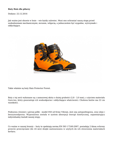 Buty Haix dla pilarzy Dodano: 22.12.2016 Jak ważne jest obuwie w lesie – wie każdy zulowiec. Musi ono ochraniać naszą stopę przed uszkodzeniami mechanicznymi, mrozem, wilgocią, a jednocześnie być wygodne, wytrzymałe i oddychające. Takie właśnie są buty Haix Protector Forest. Buty z tej serii wykonane są z zamszowej skóry o dużej grubości (2,8 - 3,0 mm), z użyciem materiału Gore-tex, który gwarantuje ich wodoodporne i oddychające właściwości. Cholewa butów ma 22 cm wysokości. Podeszwa również z górnej półki - model 050 od firmy Vibram. Jest ona antypoślizgowa, oraz olejo i benzynoodporna. Wyposażona została w system absorpcji energii kinetycznej, zapamiętujący indywidualny kształt naszej stopy. Co ważne w naszej branży – buty te spełniają normę EN ISO 17249:2007, posiadają 2 klasę ochrony przeciw przecięciami (do 24 m/s) dzięki zastosowaniu w użytych do ich stworzenia materiałach kevlaru. Dzięki wysokiej odporności na przetarcia, obuwie świetnie nadaje się do całorocznego użytkowania nawet w ekstremalnych warunkach dużych mrozów, bądź upałów. Buty są wyposażone w anatomicznie uformowaną, wymienną, zmywalną wkładkę, która posiada bardzo dobre właściwości jeśli chodzi o wchłanianie wilgoci, a w dodatku szybko wysycha. Wkładka doskonale amortyzuje i wykazuje właściwości antybakteryjne. Gwarancja producenta to 12 miesięcy. JH Komentarze (2) Michał J... Szkoda że nie podaliście ceny... firmy l... Cena jest dość wysoka - ok. 1000 zł.