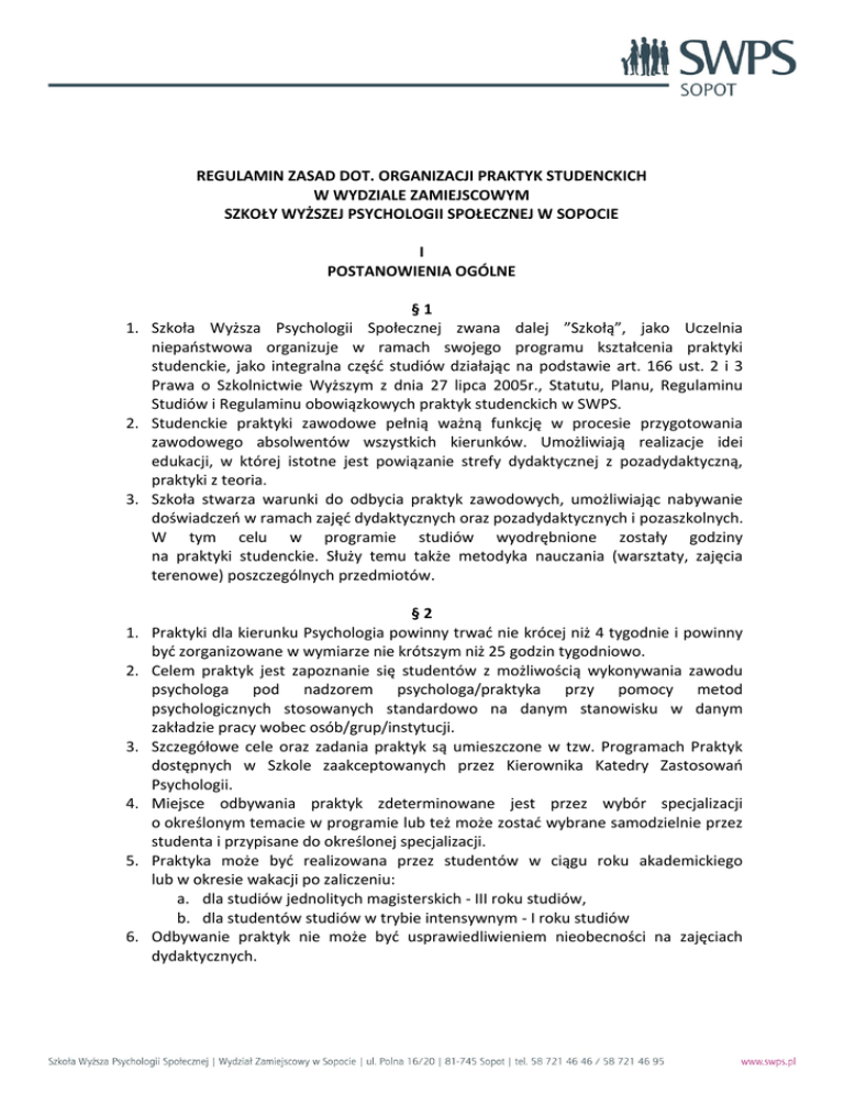 REGULAMIN ZASAD DOT. ORGANIZACJI PRAKTYK STUDENCKICH W WYDZIALE ZAMIEJSCOWYM SZKOŁY WYŻSZEJ PSYCHOLOGII SPOŁECZNEJ W SOPOCIE I POSTANOWIENIA OGÓLNE §1 1. Szkoła Wyższa Psychologii Społecznej zwana dalej ”Szkołą”, jako Uczelnia niepaństwowa organizuje w ramach swojego programu kształcenia praktyki studenckie, jako integralna część studiów działając na podstawie art. 166 ust. 2 i 3 Prawa o Szkolnictwie Wyższym z dnia 27 lipca 2005r., Statutu, Planu, Regulaminu Studiów i Regulaminu obowiązkowych praktyk studenckich w SWPS. 2. Studenckie praktyki zawodowe pełnią ważną funkcję w procesie przygotowania zawodowego absolwentów wszystkich kierunków. Umożliwiają realizacje idei edukacji, w której istotne jest powiązanie strefy dydaktycznej z pozadydaktyczną, praktyki z teoria. 3. Szkoła stwarza warunki do odbycia praktyk zawodowych, umożliwiając nabywanie doświadczeń w ramach zajęć dydaktycznych oraz pozadydaktycznych i pozaszkolnych. W tym celu w programie studiów wyodrębnione zostały godziny na praktyki studenckie. Służy temu także metodyka nauczania (warsztaty, zajęcia terenowe) poszczególnych przedmiotów. §2 1. Praktyki dla kierunku Psychologia powinny trwać nie krócej niż 4 tygodnie i powinny być zorganizowane w wymiarze nie krótszym niż 25 godzin tygodniowo. 2. Celem praktyk jest zapoznanie się studentów z możliwością wykonywania zawodu psychologa pod nadzorem psychologa/praktyka przy pomocy metod psychologicznych stosowanych standardowo na danym stanowisku w danym zakładzie pracy wobec osób/grup/instytucji. 3. Szczegółowe cele oraz zadania praktyk są umieszczone w tzw. Programach Praktyk dostępnych w Szkole zaakceptowanych przez Kierownika Katedry Zastosowań Psychologii. 4. Miejsce odbywania praktyk zdeterminowane jest przez wybór specjalizacji o określonym temacie w programie lub też może zostać wybrane samodzielnie przez studenta i przypisane do określonej specjalizacji. 5. Praktyka może być realizowana przez studentów w ciągu roku akademickiego lub w okresie wakacji po zaliczeniu: a. dla studiów jednolitych magisterskich - III roku studiów, b. dla studentów studiów w trybie intensywnym - I roku studiów 6. Odbywanie praktyk nie może być usprawiedliwieniem nieobecności na zajęciach dydaktycznych. §3 1. Opiekę merytoryczną, nadzór dydaktyczno wychowawczy sprawuje Opiekun praktyk. Opiekunami praktyk są Kierownicy tzw. „modułów/bloków” z danej specjalizacji. 2. Za prawidłową organizację i przebieg praktyk odpowiadają Wydziałowy Koordynator ds. Organizacji Praktyk i Staży Zawodowych oraz Wydziałowy Koordynator ds. Kontaktów z Instytucjami. 3. Kierownik modułu/bloku może wyznaczyć innego współpracownika, jako Opiekuna praktyk. 4. Do zadań Opiekuna praktyk należy w szczególności: a. opracowanie celów i programu praktyki oraz zapoznanie z nimi studentów danego kierunku studiów b. wskazanie instytucji, w których studenci mogą odbyć praktyki studenckie c. skonsultowanie ze studentami miejsc do odbycia praktyk indywidualnie przez nich wybranych pod kątem możliwości zrealizowania programu praktyk d. nadzór merytoryczny nad przebiegiem praktyk i zaliczenie praktyk studentom e. współpraca z Koordynatorem ds. Organizacji Praktyk i Staży Zawodowych przy szacowaniu zapotrzebowania na praktyki na kolejny rok f. współpraca z Koordynatorem ds. Kontaktów z Instytucjami w zakresie przygotowanie baz instytucji i miejsc na praktyki g. współpraca z innymi pracownikami naukowymi prowadzącymi praktyki w ramach danego wydziału. 5. Do zadań Koordynatora ds. Organizacji Praktyk i Staży Zawodowych należy: a. koordynacja przebiegu praktyk b. współpraca z Opiekunami Praktyk przy sporządzaniu sprawozdań z praktyk 6. Do zadań Koordynatora ds. Kontaktów z Instytucjami należy: a. rozliczenie finansowe praktyk b. nawiązywanie kontaktów z instytucjami w celu zorganizowania miejsc do odbycia praktyk studenckich c. przygotowanie porozumień i umów z podmiotami przyjmującymi studentów na praktyki II ORGANIZACJA PRAKTYK §4 1. Studenci jednolitych studiów magisterskich na kierunkach: Psychologia ogólna, Psychologia ze specjalnościami: kliniczna i zdrowia, wspomagania rozwoju, organizacji i zarządzania zobowiązani są do odbycia praktyk w wymiarze 100 godzin podzielonych na: 30 godzin na VII semestrze i 30 godzin na VIII semestrze na IV roku studiów, 40 godzin do końca IX semestru na V roku studiów. Praktyki powinny być zrealizowane do końca IX semestru. Na uzasadniony wniosek studenta Opiekun praktyk może dokonać indywidualnego podziału realizacji praktyk, jednakże praktyka nie może trwać krócej niż 25 godzin tygodniowo. 2. Studenci studiów intensywnych na kierunku Psychologia dla magistrów (3 letnia) zobowiązani są do odbycia praktyk w wymiarze 100 godzin podzielonych na: 30 godzin na III semestrze i 30 godzin na IV semestrze na II roku studiów, 40 godzin na V semestrze na III roku studiów. Praktyki powinny być zrealizowane do końca V semestru. Na uzasadniony wniosek studenta Opiekun praktyk może dokonać indywidualnego podziału realizacji praktyk, jednakże praktyka nie może trwać krócej niż 25 godzin tygodniowo. §5 1. O zaliczenie praktyki bez obowiązku jej odbycia mogą ubiegać się studenci, którzy: a. są zatrudnieni w instytucji gwarantującej uzyskanie odpowiednich umiejętności praktycznych, jeżeli charakter tej pracy spełnia łącznie wymagania programu praktyk oraz wymagania jak w § 2 pkt. 1 i 2 b. są studentami lub absolwentami innych szkół wyższych, którzy odbyli lub odbywają praktykę zawodową spełniającą łącznie wymagania programu praktyk oraz wymagania jak w § 2 pkt. 1 i 2, lub c. uczestniczą lub uczestniczyli w stażach i praktykach (także w ramach wolontariatu) gwarantujących uzyskanie odpowiednich umiejętności praktycznych spełniającą łącznie wymagania programu praktyk oraz wymagania jak w § 2 pkt