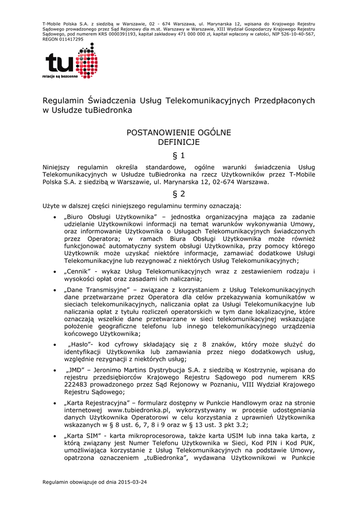 T-Mobile Polska S.A. z siedzibą w Warszawie, 02 - 674 Warszawa, ul. Marynarska 12, wpisana do Krajowego Rejestru Sądowego prowadzonego przez Sąd Rejonowy dla m.st. Warszawy w Warszawie, XIII Wydział Gospodarczy Krajowego Rejestru Sądowego, pod numerem KRS 0000391193, kapitał zakładowy 471 000 000 zł, kapitał wpłacony w całości, NIP 526-10-40-567, REGON 011417295 Regulamin Świadczenia Usług Telekomunikacyjnych Przedpłaconych w Usłudze tuBiedronka POSTANOWIENIE OGÓLNE DEFINICJE §1 Niniejszy regulamin określa standardowe, ogólne warunki świadczenia Usług Telekomunikacyjnych w Usłudze tuBiedronka na rzecz Użytkowników przez T-Mobile Polska S.A. z siedzibą w Warszawie, ul. Marynarska 12, 02-674 Warszawa. §2 Użyte w dalszej części niniejszego regulaminu terminy oznaczają: „Biuro Obsługi Użytkownika” – jednostka organizacyjna mająca za zadanie udzielanie Użytkownikowi informacji na temat warunków wykonywania Umowy, oraz informowanie Użytkownika o Usługach Telekomunikacyjnych świadczonych przez Operatora; w ramach Biura Obsługi Użytkownika może również funkcjonować automatyczny system obsługi Użytkownika, przy pomocy którego Użytkownik może uzyskać niektóre informacje, zamawiać dodatkowe Usługi Telekomunikacyjne lub rezygnować z niektórych Usług Telekomunikacyjnych; „Cennik” - wykaz Usług Telekomunikacyjnych wraz z zestawieniem rodzaju i wysokości opłat oraz zasadami ich naliczania; „Dane Transmisyjne” – związane z korzystaniem z Usług Telekomunikacyjnych dane przetwarzane przez Operatora dla celów przekazywania komunikatów w sieciach telekomunikacyjnych, naliczania opłat za Usługi Telekomunikacyjne lub naliczania opłat z tytułu rozliczeń operatorskich w tym dane lokalizacyjne, które oznaczają wszelkie dane przetwarzane w sieci telekomunikacyjnej wskazujące położenie geograficzne telefonu lub innego telekomunikacyjnego urządzenia końcowego Użytkownika; „Hasło”- kod cyfrowy składający się z 8 znaków, który może służyć do identyfikacji Użytkownika lub zamawiania przez niego dodatkowych usług, względnie rezygnacji z niektórych usług; „JMD” – Jeronimo Martins Dystrybucja S.A. z siedzibą w Kostrzynie, wpisana do rejestru przedsiębiorców Krajowego Rejestru Sądowego pod numerem KRS 222483 prowadzonego przez Sąd Rejonowy w Poznaniu, VIII Wydział Krajowego Rejestru Sądowego; „Karta Rejestracyjna” – formularz dostępny w Punkcie Handlowym oraz na stronie internetowej www.tubiedronka.pl, wykorzystywany w procesie udostępniania danych Użytkownika Operatorowi w celu korzystania z uprawnień Użytkownika wskazanych w § 8 ust. 6, 7, 8 i 9 oraz w § 13 ust. 3 pkt 3.2; „Karta SIM” - karta mikroprocesorowa, także karta USIM lub inna taka karta, z którą związany jest Numer Telefonu Użytkownika w Sieci, Kod PIN i Kod PUK, umożliwiająca korzystanie z Usług Telekomunikacyjnych na podstawie Umowy, opatrzona oznaczeniem „tuBiedronka”, wydawana Użytkownikowi w Punkcie Regulamin obowiązuje od dnia 2015-03-24 Handlowym będąca własnością Operatora do chwili rozwiązania lub wygaśnięcia Umowy; „Kod PIN” - związany z Kartą SIM kod cyfrowy, ustawiony fabrycznie lub zdefiniowany przez Użytkownika, umożliwiający dostęp do Usług Telekomunikacyjnych poprzez Kartę SIM; „Kod PUK” - związany z Kartą SIM kod cyfrowy znoszący blokadę Kodu PIN, zapewniający Użytkownikowi możliwość identyfikowania przy dostępie do Usług Telekomunikacyjnych poprzez Kartę SIM; „Konsument” - osoba fizyczna będąca stroną Umowy lub wnioskująca o jej zawarcie, w celach niezwiązanych bezpośrednio z jej działalnością gospodarczą lub zawodową; „Numer Telefonu” – numer telefonu Użytkownika, identyfikujący Kartę SIM w Sieci, który może służyć do identyfikacji Użytkownika w serwisach umożliwiających zmiany w usługach i dostęp do informacji o koncie przypisanym w systemach informatycznych Operatora do Karty SIM; „Operator” – T-Mobile Polska S.A.; „Osoba” - osoba fizyczna bądź osoba prawna lub inna jednostka organizacyjna posiadająca zdolność do zawierania umów; „Punkt Obsługi” – autoryzowana przez Operatora placówka zajmująca się obsługą Użytkowników, której adres wskazany jest na stronie internetowej www.tubiedronka.pl; „Punkt Handlowy” – jednostka zarządzana przez JMD lub inne podmioty na podstawie umowy z JMD i opatrzona oznaczeniem „Biedronka”, wydająca Karty SIM oraz umożliwiająca uiszczenie przez Użytkownika opłat z tytułu korzystania z Usług Telekomunikacyjnych; „Regulamin” – zbiór dokumentów składających się na regulamin świadczenia Usług Telekomunikacyjnych; na Regulamin składa się zawsze RŚUT, a w przypadku związania się nimi, także Warunki Oferty Promocyjnej lub Regulamin Usługi Dodatkowej lub inne dokumenty, w treści których wyraźnie zaznaczono, że są treścią Regulaminu; Regulamin Usługi Dodatkowej - ustalone przez Operatora szczegółowe warunki korzystania z Usługi Telekomunikacyjnej, której specyfika wymaga odrębnego uregulowania; Regulaminy Usług Dodatkowych dostępne są w Biurze Obsługi Użytkownika, Punktach Sprzedaży oraz na stronie internetowej www.tubiedronka.pl.; „RŚUT” – niniejszy regulamin; „Sieć” lub „Sieć Operatora” – publiczna sieć telekomunikacyjna Operatora służąca do świadczenia Usług Telekomunikacyjnych; „Umowa” – umowa o świadczenie usług telekomunikacyjnych, na podstawie której Operator świadczy na rzecz Użytkownika Usługi Telekomunikacyjne, a Użytkownik zobowiązuje się do zapłaty na rzecz Operatora opłat z tego tytułu oraz do przestrzegania wszelkich postanowień Umowy; na Umowę składa się RŚUT, Cennik, a w przypadku związania się nimi także Warunki Oferty Promocyjnej lub Regulamin Usługi Dodatkowej; „Usługa tuBiedronka” - system, w którym Usługi Telekomunikacyjne są świadcz