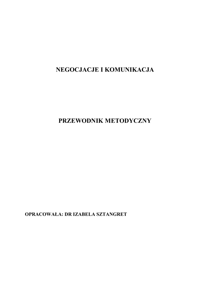 NEGOCJACJE I KOMUNIKACJA PRZEWODNIK METODYCZNY OPRACOWAŁA: DR IZABELA SZTANGRET I. Ogólne informacje o przedmiocie Cel: Przedmiot negocjacje i komunikacja kierowany jest do studentów i praktyków gospodarczych, którzy wchodząc w relacji z podmiotami tzw. otoczenia celowego (klientami, konkurentami, kooperantami), powinni posiadać umiejętność efektywnego komunikowania i targowania. Zajęcia prowadzą do uzyskanie wiedzy teoretycznej dotyczącej negocjacji indywidualnych i zespołowych, wewnętrznych i zewnętrznych oraz nabycie umiejętności praktycznego stosowania metod i technik negocjacyjnych. Ramowy program: 1. Rynek, jego podmioty i relacje 1.Pojęcie rynku. 2.Struktura podmiotowa rynku. 3.Ilościowa i jakościowa charakterystyka rynku. 4.Podmioty procesu komunikacji i negocjacji. 5.Konflikt – przyczyny i rodzaje. 6.Władza i jej źródła w kanałach komunikacji 2. Istota negocjacji - wprowadzenie. 1. Definicja pojęcia negocjacje. 2. Cele, determinanty, wynik negocjacji. 3. Style negocjacji ze względu na nastawienie stron i wynik procesu (negocjacje pozycyjny a kooperacyjne lub rzeczowe). 4. Elementy wyjściowe negocjacji. 3. Warunki i sposoby skutecznej komunikacji. 1. Elementy procesu komunikacji: źródło, przekaz, kanał, odbiorca, sprzęŜenie zwrotne. 2. Wypowiadanie się i jego uwarunkowania. 3. Technika zadawania pytań i argumentacji. 4. Słuchanie a słyszenie. Aktywne słuchanie i jego taktyki. 4. Techniki negocjacji 1. Techniki kształtowania sytuacji. 2. Techniki sterowania przebiegiem negocjacji. 3. Techniki manipulacji psychologicznej. 4. Taktyki rozwiązywania sytuacji trudnych. Technika BATNA. 5. Techniki nawiązywania i utrzymywania harmonijnego kontaktu z rozmówcą. Techniki zdobywania sympatii. 6. Sztuka ustępowania. 7. Postawa wobec obiekcji. 8. Role taktyczne uczestników zespołów negocjacyjnych. 5. Cechy negocjatora 1. Siła, aspiracje i zdolności negocjatora. 2. Kategorie zachowań negocjatora: uległość, asertywność, agresja. 3. Stres a zachowania. 6. Komunikacja niewerbalna 1. Elementy niewerbalnych aktów komunikacji: gestykulacja, mimika, dotyk i kontakt fizyczny, spojrzenie, dystans fizyczny, pozycja ciała, wygląd i ubiór, dźwięki paralingwinistyczne, jakość wypowiedzi, elementy środowiska. 2. Rola komunikacji niewerbalnej w negocjacjach. 7. Metody inwentyczne (heurystyczne) w negocjacjach 1. Burza mózgów 2. Technika 635 3. Phillips 66 4. Synektyka Gordona, 5. Technika morfologiczna. 8. Planowanie prezentacji. 1. Rodzaje prezentacji. 2. Analiza słuchacza. Techniki angaŜowania słuchacza. 3. Cel, sposób, czas, struktura prezentacji. 4. AranŜacja pomieszczeń prezentacyjnych. 5. Media prezentacyjne. 6. Postępowanie w przypadku zakłóceń. 9. Negocjacje transakcji globalnej. 1.Uwarunkowania komunikacji międzynarodowej. 2. Wyzwania negocjacji międzykulturowych. 3. Rola tłumacza w negocjacjach Literatura: Literatura podstawowa: - Błaut R.: Skuteczne negocjacje. Lektury menedŜera, Warszawa - Dąbrowski P.J.: Praktyczna teoria negocjacji. Wyd. Sorbog Warszawa - Jamrozek B., Sobczak J.: Komunikacja interpersonalna. EMPi Warszawa - Nęcki Z.: Negocjacje w biznesie. Wyd. Profesjonalnej Szkoły Biznesu, Kraków - Fisher R., Ury W., Patton B.: Dochodząc do tak. PWE Warszawa - Ury W.: Odchodząc od nie. PWE Warszawa Literatura uzupełniająca: - Bieniok H., Gruszczynska-Malec G., Królik G.: Elementarz twórczego myślenia. AE Katowice - Brdulak H., Brdulak J. : Sztuka i technika negocjacji handlowych. Wyd. Bizant, Warszawa - Christopher E.M.: Umiejętność negocjowania w biznesie. Wyd. Zysk i s-ka, Poznań - Collins: Język ciała, gestów i zachowań. Wyd. Astrum. Wrocław - Eisler-Mertz C.: Mowa rąk. Astrum, Wrocław - Gesteland R.R.: RóŜnice kulturowe a zachowania w biznesie. PWN Warszawa - Hindle T.: Skuteczne negocjacje. Poradnik menedŜera. Wyd. Wiedza i Ŝycie. Warszawa - Lemmermann H.: Komunikacja werbalna. Szkoła dyskutowania. Astrum, Wrocław - Łasiński G.: Sztuka prezentacji. EMPi Warszawa - Martin D.M.: Trudne rozmowy w interesach. ABC Warszawa - Mastenbroek W.: Negocjowanie. PNW Warszawa - Murdoch A.: Prezentacje i wystąpienia w public relations. Poltext Warszawa - Nęcki Z.: Komunikacja międzyludzka. Antykwa Kraków - II. Salacuse J.W.: Negocjacje na rynkach międzynarodowych. PWE Warszawa Sharpe R.: Broń swoich interesów. ABC Warszawa Sobczak-Matysiak J.: Psychologia kontaktu z klientem. Wyd. WSB Poznań Stalmaszczyk M.: Negocjowanie kontraktów handlowych. CDKHZ, Warszawa Stankiewicz J.: Komunikowanie się w organizacji. Astrum, Wrocław Tendera-Właszczuk H.: Negocjacje i komunikacja. Deni-Press. Katowice Wołowik W.: Język ciała w biznesie, polityce i Ŝyciu publicznym. Wyd. Profesjonalnej Szkoły Biznesu. Kraków Problematyka zajęć dydaktycznych (z podziałem na poszczególne jednostki dydaktyczne): 1. Rynek, jego podmioty i relacje Słowa kluczowe: rynek, rynek w ujęciu ogólnym, rynek w ujęciu marketingowym, podmioty rynku, otoczenie ogólne i celowe, ilościowa charakterystyka rynku, jakościowa charakterystyka rynku, komunikacja a negocjacje, konflikt, konflikty poziome, pionowe, między-kanałowe, siła przetargowa, władza, źródła władzy Pytania: 1. Podaj definicję rynku z uwzględnieniem jego funkcji wymiennej i alokacyjnej, w ujęciu podmiotowym 2. Wymień elementy jakościowej i ilościowej analizy rynku 3. Wymień podmioty otoczenia celowego przedsiębiorstwa 4. Podaj i omów rodzaje konfliktów 5. Omów źródła władzy podmiotu 2. Istota negocjacji - wprowadzenie. Słowa kluczowe: negocjacje, wynik negocjacji, poraŜka, kompromis, konsensus, styl miękki, styl twardy, styl rzeczowy, negocjacje kooperacyjne, negocjacje rywalizacyjne, „koncert Ŝyczeń”, płaszczyzna porozumienia Pytania: 1. Podaj definicję negocjacji 2. Podaj definicję płaszczyzny porozumienia 3. Omów style negocjacyjne miękki i twardy 4. Podaj i omów zasady stylu negocjacyjnego rzeczowego 3.