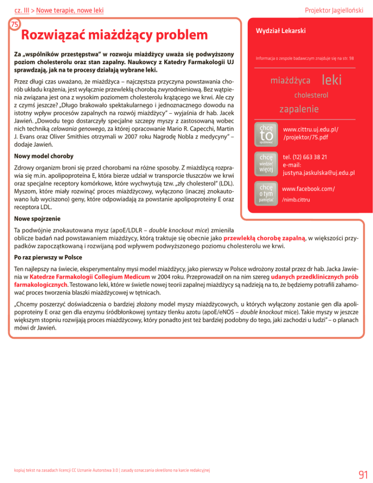 cz. III > Nowe terapie, nowe leki Rozwiązać miażdżący problem Za „wspólników przestępstwa” w rozwoju miażdżycy uważa się podwyższony poziom cholesterolu oraz stan zapalny. Naukowcy z Katedry Farmakologii UJ sprawdzają, jak na te procesy działają wybrane leki. Przez długi czas uważano, że miażdżyca – najczęstsza przyczyna powstawania chorób układu krążenia, jest wyłącznie przewlekłą chorobą zwyrodnieniową. Bez wątpienia związana jest ona z wysokim poziomem cholesterolu krążącego we krwi. Ale czy z czymś jeszcze? „Długo brakowało spektakularnego i jednoznacznego dowodu na istotny wpływ procesów zapalnych na rozwój miażdżycy” – wyjaśnia dr hab. Jacek Jawień. „Dowodu tego dostarczyły specjalne szczepy myszy z zastosowaną wobec nich techniką celowania genowego, za której opracowanie Mario R. Capecchi, Martin J. Evans oraz Oliver Smithies otrzymali w 2007 roku Nagrodę Nobla z medycyny” – dodaje Jawień. Nowy model choroby Zdrowy organizm broni się przed chorobami na różne sposoby. Z miażdżycą rozprawia się m.in. apolipoproteina E, która bierze udział w transporcie tłuszczów we krwi oraz specjalne receptory komórkowe, które wychwytują tzw. „zły cholesterol” (LDL). Myszom, które miały rozwinąć proces miażdżycowy, wyłączono (inaczej znokautowano lub wyciszono) geny, które odpowiadają za powstanie apolipoproteiny E oraz receptora LDL. Projektor Jagielloński Wydział Lekarski Informacja o zespole badawczym znajduje się na str. 98 www.cittru.uj.edu.pl/ /projektor/75.pdf tel. (12) 663 38 21 e-mail: [email protected] www.facebook.com/ /nimb.cittru Nowe spojrzenie Ta podwójnie znokautowana mysz (apoE/LDLR – double knockout mice) zmieniła oblicze badań nad powstawaniem miażdżycy, którą traktuje się obecnie jako przewlekłą chorobę zapalną, w większości przypadków zapoczątkowaną i rozwijaną pod wpływem podwyższonego poziomu cholesterolu we krwi. Po raz pierwszy w Polsce Ten najlepszy na świecie, eksperymentalny mysi model miażdżycy, jako pierwszy w Polsce wdrożony został przez dr hab. Jacka Jawienia w Katedrze Farmakologii Collegium Medicum w 2004 roku. Przeprowadził on na nim szereg udanych przedklinicznych prób farmakologicznych. Testowano leki, które w świetle nowej teorii zapalnej miażdżycy są nadzieją na to, że będziemy potrafili zahamować proces tworzenia blaszki miażdżycowej w tętnicach. „Chcemy poszerzyć doświadczenia o bardziej złożony model myszy miażdżycowych, u których wyłączony zostanie gen dla apolipoproteiny E oraz gen dla enzymu śródbłonkowej syntazy tlenku azotu (apoE/eNOS – double knockout mice). Takie myszy w jeszcze większym stopniu rozwijają proces miażdżycowy, który ponadto jest też bardziej podobny do tego, jaki zachodzi u ludzi” – o planach mówi dr Jawień. kopiuj tekst na zasadach licencji CC Uznanie Autorstwa 3.0 | zasady oznaczania określono na karcie redakcyjnej 91