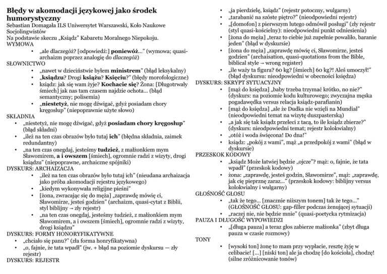 Błędy w akomodacji językowej jako środek humorystyczny „ja pierdzielę, ksiądz” (rejestr potoczny, wulgarny) „tarabanić na szóste piętro?” (nieodpowiedni rejestr) „[domofon] z pierwszym lutego odmówił posługi” (zły rejestr Sebastian Domagała ILS Uniwersytet Warszawski, Koło Naukowe (styl quasi-kościelny): nieodpowiedni punkt odniesienia) Socjolingwistów • [żona do męża] „teraz to ciebie już zupełnie powaliło, baranie Na podstawie skeczu „Ksiądz” Kabaretu Moralnego Niepokoju. jeden” (błąd w dyskursie) WYMOWA • [żona do męża] „zaprawdę mówię ci, Sławomirze, jesteś • „ale dlaczegóż? [odpowiedź:] poniewóż...” (wymowa; quasigodzien” (archaisation, quasi-quotations from the Bible, archaizm poprzez analogię do dlaczegóż) biblical style → wrong register) SŁOWNICTWO • „ile waży ta figura? 60 kg? [śmiech] 60 kg?! Aleś umoczył!” • „nawet w dzieciństwie byłem ministrem” (błąd leksykalny) (błąd dyskursu: nieodpowiedni w obecności księdza) • „ksiądzu? Drogi książu? Księciu?” (błędy morofologiczne) DYSKURS: SKRYPT SYTUACYJNY • ksiądz: jak się wam żyje? Kochacie się? Żona: [Długotrwały • [mąż do księdza] „baby trzeba trzymać krótko, no nie?” śmiech] jak nas tam czasem najdzie ochota... (błąd (dyskurs: na poziomie kodu kulturowego; zwyczajna męska semantyczny; polisemia) pogadawędka versus relacja ksiądz-parafianin) • „niestetyż, nie mogę dźwigać, gdyż posiadam chory • [mąż do księdza] „ale że Dudka nie wzięli na Mundial” kręgosłup” (niepoprawnie użyte słowo) (nieodpowiedni temat na wizytę duszpasterską) SKŁADNIA • „a jak się tak ksiądz przeleci z tacą, to ile ksiądz zbierze?” • „niestetyż, nie mogę dźwigać, gdyż posiadam chory kręgosłup” (dyskurs: nieodpowiedni temat; rejestr kolokwialny) (błąd składni) • „otóż i woda święcona! Do dna!” • „ileż na ten czas obrazów było tutaj ich” (błędna składnia, zaimek • ksiądz: „pokój z wami”, mąż „a przedpokój z wami” (błąd w redundantny) dyskursie) • „na ten czas onegdaj, jesteśmy tudzież, z małżonkiem mym PRZESKOK KODOWY Sławomirem, a i owszem [śmiech], ogromnie radzi z wizyty, drogi • „ksiądz Może łatwiej będzie „ojcze”? mąż: o, fajnie, że tata ksiądzu” (niepoprawne, archaiczne spójniki) wpadł” (przeskok kodowy) DYSKURS: ARCHAIZACJA • żona: „zaprawdę, jesteś godzin, Sławomirze”, mąż: „zaprawdę, • „ileż na ten czas obrazów było tutaj ich” (nieudana archaizacja jak cię pieprznę zaraz...” (przeskok kodowy: biblijny versus jako próba akomodacji rejestru językowego) kolokwialny i wulgarny) • „kiedym wykonywała religijne pieśni” GŁOŚNOŚĆ GŁOSU • [żona, zwracając się do męża] „zaprawdę mówię ci, • „tak że tego... [znacznie niższym tonem] tak że tego...” Sławomirze, jesteś godzien” (archaizm, quasi-cytat z Biblii, (GŁOŚNOŚĆ GŁOSU: gap-filler podczas żenującej sytuacji) styl biblijny → zły rejestr) • „raczej nie, nie będzie mnie” (quasi-poetycka rytmizacja) • „na ten czas onegdaj, jesteśmy tudzież, z małżonkiem mym PAUZA I DŁUGOŚĆ WYPOWIEDZI Sławomirem, a i owszem [śmiech], ogromnie radzi z wizyty, • „[długa pauza] a teraz głos zabierze małżonka” (zbyt długa drogi ksiądzu” pauza w czasie rozmowy) DYSKURS: FORMY HONORYFIKATYWNE TONY • „chciało się panu?” (zła forma honryfikatywna) • [wysoki ton] żonę to mam przy wypłacie, resztę żyję w • „o, fajnie, że tata wpadł” (jw. + błąd na poziomie dyskursu — zły celibacie! […] [niski ton] ale ja chodzę [do kościoła], chodzę! rejestr) (silne zróżnicowanie tonów) DYSKURS: REJESTR • • •