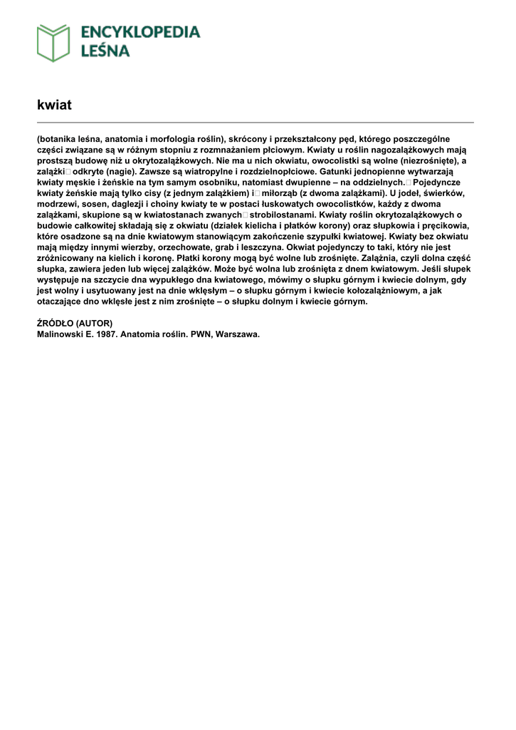 kwiat (botanika leśna, anatomia i morfologia roślin), skrócony i przekształcony pęd, którego poszczególne części związane są w różnym stopniu z rozmnażaniem płciowym. Kwiaty u roślin nagozalążkowych mają prostszą budowę niż u okrytozalążkowych. Nie ma u nich okwiatu, owocolistki są wolne (niezrośnięte), a zalążki odkryte (nagie). Zawsze są wiatropylne i rozdzielnopłciowe. Gatunki jednopienne wytwarzają kwiaty męskie i żeńskie na tym samym osobniku, natomiast dwupienne – na oddzielnych. Pojedyncze kwiaty żeńskie mają tylko cisy (z jednym zalążkiem) i miłorząb (z dwoma zalążkami). U jodeł, świerków, modrzewi, sosen, daglezji i choiny kwiaty te w postaci łuskowatych owocolistków, każdy z dwoma zalążkami, skupione są w kwiatostanach zwanych strobilostanami. Kwiaty roślin okrytozalążkowych o budowie całkowitej składają się z okwiatu (działek kielicha i płatków korony) oraz słupkowia i pręcikowia, które osadzone są na dnie kwiatowym stanowiącym zakończenie szypułki kwiatowej. Kwiaty bez okwiatu mają między innymi wierzby, orzechowate, grab i leszczyna. Okwiat pojedynczy to taki, który nie jest zróżnicowany na kielich i koronę. Płatki korony mogą być wolne lub zrośnięte. Zalążnia, czyli dolna część słupka, zawiera jeden lub więcej zalążków. Może być wolna lub zrośnięta z dnem kwiatowym. Jeśli słupek występuje na szczycie dna wypukłego dna kwiatowego, mówimy o słupku górnym i kwiecie dolnym, gdy jest wolny i usytuowany jest na dnie wklęsłym – o słupku górnym i kwiecie kołozalążniowym, a jak otaczające dno wklęsłe jest z nim zrośnięte – o słupku dolnym i kwiecie górnym. ŹRÓDŁO (AUTOR) Malinowski E. 1987. Anatomia roślin. PWN, Warszawa.