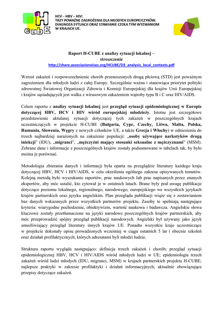 Raport H-CUBE z analizy sytuacji lokalnej – streszczenie http://share.associazioneises.org/HCUBE/D3_analysis_local_contexts.pdf Wzrost zakażeń i rozpowszechnienie chorób przenoszonych drogą płciową (STD) jest poważnym zagrożeniem dla młodych ludzi z całej Europy. Szczególnie ważna i stanowiąca priorytet polityki zdrowotnej Światowej Organizacji Zdrowia i Komisji Europejskiej dla krajów Unii Europejskiej i krajów sąsiadujących jest walka z wirusowym zakażeniem wątroby typu B i C oraz HIV/AIDS. Celem raportu z analizy sytuacji lokalnej jest przegląd sytuacji epidemiologicznej w Europie dotyczącej HBV, HCV i HIV wśród europejskiej młodzieży. Istotne jest szczegółowe przedstawienie aktulanej sytuacji dotyczącej tych zakażeń w poszczególnych krajach uczestniczących w projekcie H-CUBE (Bułgaria, Cypr, Czechy, Litwa, Malta, Polska, Rumunia, Słowenia, Węgry z nowych członków UE, a także Grecja i Włochy) w odniesieniu do trzech najbardziej narażonych na zakażenie populacji: „osoby używające narkotyków drogą iniekcji” (IDU), „migranci”, „mężczyźni mający stosunki seksualne z mężczyznami” (MSM). Zebrane dane i informacje z poszczególnych krajów zostały podsumowane w tabelach tak, by było można je porównać. Metodologia zbierania danych i informacji była oparta na przeglądzie literatury każdego kraju dotyczącej HBV, HCV i HIV/AIDS, w celu określenia ogólnego zakresu opisywanych tematów. Kolejną metodą było wyszukanie raportów, prac naukowych lub prac napisanych przez znanych ekspertów, aby móc ustalić, kto cytował je w ostatnich latach. Brane były pod uwagę publikacje dotyczące poziomu lokalnego, regionalnego, narodowego, europejskiego we wszystkich językach krajów partnerskich oraz języku angielskim. Plan przeglądu publikacji wiąże się z zestawianiem baz danych wskazanych przez wszystkich partnerów projektu. Zasoby te spełniają następujące kryteria: wiarygodne pochodzenie, obiektywizm, wartość naukowa i badawcza. Angielskie słowa kluczowe zostały przetłumaczone na języki narodowe poszczególnych krajów partnerskich, aby móc przeprowadzić spójny przegląd publikacji narodowych. Angielski był używany jako język umożliwiający przegląd literatury innych krajów UE. Ponadto wszystkie kraje uczestniczące w projekcie dokonały opisu prowadzonych wcześniej w ciągu ostatnich 5 lat i obecnie szkoleń oraz działań profilaktycznych, których adresatami byli młodzi ludzie. Struktura raportu wygląda następująco: definicja trzech zakażeń i chorób; przegląd sytuacji epidemiologicznej HBV, HCV i HIV/AIDS wśród młodych ludzi w UE; epidemiologia trzech zakażeń wśród ludzi młodych (IDU, migranci, MSM) w krajach partnerskich projektu H-CUBE; najlepsze praktyki w zakresie profilaktyki i działań informacyjnych; aktualnie obowiązujące przepisy dotyczące zakażeń.