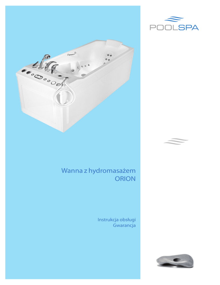 Wanna z hydromasażem ORION Instrukcja obsługi Gwarancja Szanowni Państwo Dziękujemy za Państwa zaufanie, które wyraziliście kupując wyrób naszej firmy. Firma POOL- SPA, jeden z europejskich liderów rynku w dziedzinie sanitarnych wyrobów z hydromasażem, od lat oferuje swoim Klientom produkty o najwyższej światowej jakości. Szczególną uwagę przywiązujemy do trwałości, niezawodności i bezpieczeństwa naszych produktów. Dlatego do ich produkcji używamy wyłącznie materiałów i urządzeń od renomowanych dostawców. Niniejsza instrukcja pozwoli Państwu zapoznać się z zasadami montażu i użytkowania, które gwarantują długoletnie bezproblemowe funkcjonowanie zakupionego produktu. Życzymy Państwu zadowolenia z użytkowania naszych wyrobów. Zaleca się korzystanie z hydromasażu w wodzie o średniej temperaturze 37 stopni przez około 20 minut. Zaleca się, aby dzieciom korzystającym z urządzenia zawsze towarzyszyła osoba dorosła. Niniejszą instrukcję należy zachować do użytku w przyszłości. SPIS TREŚCI CZĘŚĆ 1 - INSTRUKCJA MONTAŻU 1. Transport .............................................................................................................................. 3 2. Przygotowanie miejsca ........................................................................................................ 3 3. Wstępne ustawienie wanny ................................................................................................. 3 4. Podłączenie do sieci elektrycznej ........................................................................................ 3 5. Testowanie szczelności wanny ............................................................................................ 3 6. Montaż właściwy .................................................................................................................. 3 7. Zasilanie wanny wodą.......................................................................................................... 3 8. Obudowanie wanny glazurą................................................................................................. 3 CZĘŚĆ 2 - INSTRUKCJA OBSŁUGI 1. Dane techniczne .................................................................................................................. 4 2. Przeznaczenie wyrobu ......................................................................................................... 4 3. Eksploatacja wanny ............................................................................................................. 4 4. Opis sterowników i przyrządów kontrolnych ........................................................................ 4 4.1. Opis głównego pulpitu sterowniczego .......................................................................... 5 4.2. Opis dezynfekcji (niedostępny w wersji na zaworach).................................................. 6 4.3. Opis sterowania biczem wodnym ................................................................................. 7 4.4. Podgrzewacz wody (niedostępny w wersji na zaworach) ............................................. 7 5. Konserwacja ........................................................................................................................ 7 6. Zakłócenia w funkcjonowaniu wanny ................................................................................... 8 7. Rozmieszczenie przyłączy wodnych, elektrycznych i kanalizacyjnych wanny Orion........... 8 8. Schemat elektryczny wanny Orion....................................................................................... 9 WARUNKI GWARANCJI ........................................................................................................ 10 KARTA GWARANCYJNA WYROBU .......................................................................................11 2 CZĘŚĆ 1 - INSTRUKCJA MONTAŻU 1. TRANSPORT Przewożenie wanny powinno odbywać się w oryginalnym opakowaniu producenta! W czasie montażu wannę należy przenosić, trzymając za aluminiową ramę ewentualnie za elementy z akrylu. Zabronione jest używanie w charakterze uchwytów rur i przewodów stanowiących elementy systemów masażu. Zabrania się przewożenia i składowania wanny w pozycji pionowej. 2. PRZYGOTOWANIE MIEJSCA Przygotowując miejsce w którym będzie zainstalowana wanna, należy zwrócić uwagę na to, aby pomieszczenie spełniało następujące warunki: a) odpowiednia wielkość, b) doprowadzone napięcie 230V~, c) odpływ i dopływ wody, d) wypoziomowane podłoże, e) odpowiednia wentylacja, 3. WSTĘPNE USTAWIENIE WANNY Po rozpakowaniu wanny natychmiast wkręcamy nóżki znajdujące się w komplecie (stawianie wanny bez nóżek grozi uszkodzeniem przelewu). Stawiamy wannę w ustalonym miejscu i wstępnie poziomujemy. 4. PODŁĄCZENIE DO SIECI ELEKTRYCZNEJ Połączenie instalacji elektrycznej z układem elektrycznym wanny znajdującym się na ramie, powinien dokonać uprawniony elektryk. Min. przekrój przewodu zasilającego wynosi 3x4 mm2. Kabel zasilający należy zawsze podłączać poprzez wyłącznik różnicowo-prądowy o znamionowej wartości prądu wyłączenia 30mA. 5. TESTOWANIE SZCZELNOŚCI WANNY Po wstępnym wypoziomowaniu wanny, podłączeniu do sieci elektrycznej i kanalizacyjnej, napełniamy wannę wodą do poziomu przelewu. Jeżeli nie stwierdzimy przecieków, uruchamiamy system masażu na 15 min. Po wyłączeniu masażu, zostawiamy napełnioną wannę na okres 1 godz. Następnie spuszczamy wodę i przystępujemy do montażu właściwego. 6. MONTAŻ WŁAŚCIWY Po wstępnym ustawieniu należy: - wypoziomować wannę w taki sposób, aby zapewnić niewielki spadek w kierunku odpływu, - zablokować przeciwnakrętkami nóżki, - zachować szczelinę (ok. 3 mm) pomiędzy ścianą a wanną. Szczelinę po montażu maskujemy taśmą uszczelniającą, - w przypadku zabudowy wanny glazurą należy zachować również szczelinę pomiędzy zabud
