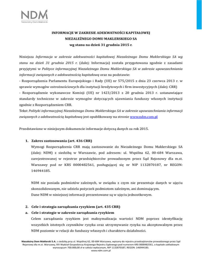 INFORMACJE W ZAKRESIE ADEKWATNOŚCI KAPITAŁOWEJ NIEZALEŻNEGO DOMU MAKLERSKIEGO SA wg stanu na dzień 31 grudnia 2015 r. Niniejsza Informacja w zakresie adekwatności kapitałowej Niezależnego Domu Maklerskiego SA wg stanu na dzień 31 grudnia 2015 r. (dalej: Informacja) została przygotowana zgodnie z zasadami przyjętymi w Polityce informacyjnej Niezależnego Domu Maklerskiego SA w zakresie upowszechniania informacji związanych z adekwatnością kapitałową oraz na podstawie: - Rozporządzenia Parlamentu Europejskiego i Rady (UE) nr 575/2015 z dnia 23 czerwca 2013 r. w sprawie wymogów ostrożnościowych dla instytucji kredytowych i firm inwestycyjnych (dalej: CRR) - Rozporządzenie wykonawcze Komisji (UE) nr 1423/2013 z 20 grudnia 2013 r. ustanawiające standardy techniczne w zakresie wymogów dotyczących ujawniania funduszy własnych instytucji zgodnie z Rozporządzeniem CRR. Tekst Polityki informacyjnej Niezależnego Domu Maklerskiego SA w zakresie upowszechniania informacji związanych z adekwatnością kapitałową jest opublikowany na stronie www.ndm.com.pl Przedstawione w niniejszym dokumencie informacje dotyczą danych za rok 2015. 1. Zakres zastosowania (art. 436 CRR) Wymogi Rozporządzenia CRR mają zastosowanie do Niezależnego Domu Maklerskiego SA (dalej: NDM) z siedzibą w Warszawie, pod adresem: ul. Wspólna 62, 00-684 Warszawa, zarejestrowanej w rejestrze przedsiębiorców prowadzonym przez Sąd Rejonowy dla m.st. Warszawy pod nr KRS 0000482561, posługującej się nr NIP 1132870187, nr REGON: 146944185. NDM nie posiada podmiotów zależnych, w związku z czym nie prezentuje danych w ujęciu skonsolidowanym, nie udziela pożyczek podmiotom zależnym, ani dominującym. Dane NDM w niniejszej informacji prezentowane są w ujęciu jednostkowym. 2. Cele i strategia zarządzania ryzykiem (art. 435 CRR) a. Cele i strategie w zakresie zarządzania ryzykiem Celem zarządzania ryzykiem jest maksymalizacja wartości NDM poprzez identyfikację wszystkich istotnych czynników ryzyka oraz utrzymywanie ryzyka na akceptowalnym przez NDM poziomie w relacji do funduszy własnych i charakteru działalności. Niezależny Dom Maklerski S.A. z siedzibą przy ul. Wspólnej 62, 00-684 Warszawa, wpisany do rejestru przedsiębiorców prowadzonego przez Sąd Rejonowy dla m.st. Warszawy, XIII Wydział Gospodarczy Krajowego Rejestru Sądowego pod numerem KRS 0000482561, o kapitale zakładowym wynoszącym 700.000,00 zł w całości wpłaconym, NIP 1132870187, REGON: 146944185. www.ndm.com.pl Strategia zarządzania ryzykiem obejmuje identyfikację ryzyka, jego ocenę i pomiar oraz monitorowanie, kontrolę i raportowanie, jak również podejmowanie decyzji i działań prowadzących do zmiany poziomu i profilu ryzyka oraz monitorowanie skutków tych decyzji i działań. Zidentyfikowane w NDM rodzaje ryzyka: 1) ryzyko operacyjne - ryzyko straty wynikającej z niedostosowania lub zawodności procesów wewnętrznych, ludzi i systemów technicznych lub zdarzeń zewnętrznych. Ryzyko operacyjne jest ryzykiem podstawowym, wpisanym w działalność NDM. W zakres ryzyka operacyjnego wchodzi w szczególności również ryzyko prawne i ryzyko braku zgodności: a) ryzyko prawne - ryzyko poniesienia strat finansowych, których przyczyną są wady prawne lub wewnętrznych niezgodności z powszechnie regulacji prawnych, obowiązującym dokumentacji; których prawem: umów, konsekwencją jest zasądzenie roszczenia od NDM. Spór prawny może obejmować proces sądowy, postępowanie arbitrażowe lub obsługę roszczeń, b) ryzyko braku zgodności - ryzyko wynikające z braku dostosowania lub niewłaściwego dostosowania wewnętrznych regulacji, do regulacji powszechnie obowiązującego prawa, wytycznych i rekomendacji tworzonych przez KNF, standardów etycznych i rynkowych. Konsekwencje braku zgodności mogą mieć charakter finansowy i niefinansowy (m.in. sankcje administracyjne, sankcje karne, szkody, ograniczenie zezwolenia na prowadzenie działalności maklerskiej z jego cofnięciem włącznie), jak również mogą prowadzić do ryzyka utraty reputacji NDM wynikającej z ww. zdarzeń. 2) ryzyko płynności - to ryzyko poniesienia straty z tytułu wymuszonej wymiany posiadanych aktywów na gotówkę lub odpowiedniki gotówki w sytuacji ograniczenia/utraty zdolności do finansowania aktywów i terminowego wykonywania zobowiązań. 3) ryzyko kredytowe - jest to niebezpieczeństwo poniesienia przez NDM straty w wyniku niespłacenia zobowiązań przez dłużnika lub kontrahenta. NDM zakłada, że poziom strat kredytowych może ulegać znaczącym fluktuacjom w następstwie zmian zewnętrznych i krajowych warunków makroekonomicznych. 4) ryzyko strategiczne - ryzyko negatywnych konsekwencji finansowych spowodowanych Niezależny Dom Maklerski S.A. z siedzibą przy ul. Wspólnej 62, 00-684 Warszawa, wpisany do rejestru przedsiębiorców prowadzonego przez Sąd Rejonowy dla m.st. Warszawy, XIII Wydział Gospodarczy Krajowego Rejestru Sądowego pod numerem KRS 0000482561, o kapitale zakładowym wynoszącym 700.000,00 zł w całości wpłaconym, NIP 1132870187, REGON: 146944185. www.ndm.com.pl podjęciem przez kadrę zarządzającą błędnych decyzji dotyczących zarówno wyboru strategii biznesowych, jak również metody ich realizacji, z uwzględnieniem umiejętności efektywnego reagowania na czynniki zewnętrzne. Ryzyko to wpływa na siłę konkurencyjną NDM w długim okresie i związane jest ze: a) strukturą akcjonariatu i powiązaniami kapitałowymi, b) profilem działalności, c) systemem zarządzania, d) strukturą organizacyjną. 5) ryzyko biznesowe - ryzyko zmiany wartości NDM, która nie jest wynikiem ryzyka kredytowego lub operacyjnego. Materializacja ryzyka biznesowego ma istotny wpływ na wynik oraz wartość NDM. Ryzyko wynika ze znaczącego pogorszenia się warunków makroekonomicznych, zmian w otoczeniu konkurencyjnym i/lub w zachowaniu klientów, a także w regulacjach prawnych dotyczących NDM. 6) r
