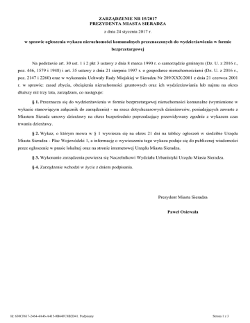 ZARZĄDZENIE NR 15/2017 PREZYDENTA MIASTA SIERADZA z dnia 24 stycznia 2017 r. w sprawie ogłoszenia wykazu nieruchomości komunalnych przeznaczonych do wydzierżawienia w formie bezprzetargowej Na podstawie art. 30 ust. 1 i 2 pkt 3 ustawy z dnia 8 marca 1990 r. o samorządzie gminnym (Dz. U. z 2016 r., poz. 446, 1579 i 1948) i art. 35 ustawy z dnia 21 sierpnia 1997 r. o gospodarce nieruchomościami (Dz. U. z 2016 r., poz. 2147 i 2260) oraz w wykonaniu Uchwały Rady Miejskiej w Sieradzu Nr 289/XXX/2001 z dnia 21 czerwca 2001 r. w sprawie: zasad zbycia, obciążenia nieruchomości gruntowych oraz ich wydzierżawiania lub najmu na okres dłuższy niż trzy lata, zarządzam, co następuje: § 1. Przeznacza się do wydzierżawienia w formie bezprzetargowej nieruchomości komunalne (wymienione w wykazie stanowiącym załącznik do zarządzenia) - na rzecz dotychczasowych dzierżawców, posiadających zawarte z Miastem Sieradz umowy dzierżawy na okres bezpośrednio poprzedzający przewidywany zgodnie z wykazem czas trwania dzierżawy. § 2. Wykaz, o którym mowa w § 1 wywiesza się na okres 21 dni na tablicy ogłoszeń w siedzibie Urzędu Miasta Sieradza - Plac Wojewódzki 1, a informację o wywieszeniu tego wykazu podaje się do publicznej wiadomości przez ogłoszenie w prasie lokalnej oraz na stronie internetowej Urzędu Miasta Sieradza. § 3. Wykonanie zarządzenia powierza się Naczelnikowi Wydziału Urbanistyki Urzędu Miasta Sieradza. § 4. Zarządzenie wchodzi w życie z dniem podpisania. Prezydent Miasta Sieradza Paweł Osiewała Id: 630CF617-2464-4A46-A415-0B64FC8B2D41. Podpisany Strona 1 z 3 Załącznik do Zarządzenia Nr 15/2017 Prezydenta Miasta Sieradza z dnia 24 stycznia 2017 r. WYKAZ nieruchomości komunalnych przeznaczonych do wydzierżawienia w formie bezprzetargowej Lp. Położenie, nazwa ulicy Numer działki 1. Jana Pawła II część działki 195/329 Pow. działki w m2 1) 8,75 2) 8,75 3) 8,75 4) 10,80 5) 26,25 6) 35 7) 22,50 8) 2,50 9) 8 Obręb geodezyjny Numer księgi wieczystej Przeznaczenie nieruchomości Sposób zagospodarowania Wysokość opłat Terminy wnoszenia opłat: miesięczne 16 SR1S/00004532/0 brak miejscowego planu zagospodarowania przestrzennego – przeznaczenie działki zgodnie z faktycznym użytkowaniem 1) wyłącznie pod stoisko handlowe nr 1 2) wyłącznie pod stoisko handlowe nr 2 3) wyłącznie pod stoisko handlowe nr 3 4) wyłącznie pod stoisko handlowe nr 3a 5) wyłącznie pod stoisko handlowe nr 4 6) wyłącznie pod stoisko handlowe nr 5 7) wyłącznie pod stoisko handlowe nr 6 8) wyłącznie pod stoisko handlowe nr 7 9) wyłącznie pod stoisko handlowe nr 8 Czynsz miesięczny wg. stawki 16,00 zł za 1 m2 + VAT 23% do 15 każdego miesiąca Nieruchomości przeznaczone zostają do oddania w dzierżawę na rzecz dotychczasowych dzierżawców, posiadających umowy dzierżawy zawarte z Miastem Sieradz na okres bezpośrednio poprzedzający przewidywany czas trwania dzierżawy, o którym mowa poniżej. Warunki umowy: 1. Przewidywany czas trwania umowy dzierżawy – od 01.03.2017 r. do 30.11.2018 r. 2. Dzierżawca zobowiązany jest do: a) utrzymania wydzierżawionej nieruchomości oraz jej bezpośredniego otoczenia w należytym stanie, a w szczególności do utrzymywania porządku i czystości we własnym zakresie, Id: 630CF617-2464-4A46-A415-0B64FC8B2D41. Podpisany Strona 2 z 3 b) posiadania ubezpieczenia OC wydzierżawionej nieruchomości przez cały okres obowiązywania umowy, c) złożenia deklaracji o wysokości opłaty za gospodarowanie odpadami komunalnymi oraz ponoszenia z tego tytułu opłat, d) ponoszenia całości kosztów naniesień, utrzymania i eksploatacji przedmiotu dzierżawy oraz innych ciężarów związanych z wydzierżawioną nieruchomością zgodnie z zasadami gospodarności i jego przeznaczeniem, e) ponoszenia wszelkich podatków i opłat związanych z przedmiotem dzierżawy. 3. Jeżeli Dzierżawca pozostaje w zwłoce z wydaniem nieruchomości, za każdy dzień zwłoki Dzierżawca zobowiązuje się płacić wynagrodzenie za bezumowne korzystanie z nieruchomości w wysokości 1/30 (jednej trzydziestej) trzykrotnej wysokości czynszu dzierżawnego obowiązującego w dacie rozwiązania lub wygaśnięcia umowy. 4. Jeżeli zwłoka w usunięciu stoisk handlowych przekracza 30 dni, Wydzierżawiający może usunąć stoiska handlowe bez ponownego wzywania na koszt Dzierżawcy. 5. Stawki czynszu dzierżawnego ustalone są na podstawie Zarządzenia Nr 108/2011 Prezydenta Miasta Sieradza z dnia 30 czerwca 2011 r. w sprawie wytycznych do ustalenia opłat za dzierżawę nieruchomości gruntowych i lokalowych oraz za reklamy, tablice informacyjne, banery reklamowe, billboardy na gruntach i obiektach stanowiących własność Gminy Miasto Sieradz. Każdorazowa zmiana Zarządzenia powoduje zmianę stawki czynszu. O zmianie stawki czynszu Wydzierżawiający zawiadamia Dzierżawcę na piśmie. Zmiana stawki czynszu wynikająca ze zmiany Zarządzenia nie wymaga zawarcia aneksu do niniejszej umowy. 6. Zmiana czynszu spowodowana zmianą stawki VAT nastąpi automatycznie z datą wejścia w życie przepisów zmieniających stawkę tego podatku, bez potrzeby zawierania aneksu do niniejszej umowy. 7. Wykaz wywieszono na tablicy ogłoszeń Urzędu Miasta Sieradza na okres 21 dni tj. od dnia 24.01.2017 r. do dnia 13.02.2017 r. Prezydent Miasta Sieradza Paweł Osiewała Id: 630CF617-2464-4A46-A415-0B64FC8B2D41. Podpisany Strona 3 z 3