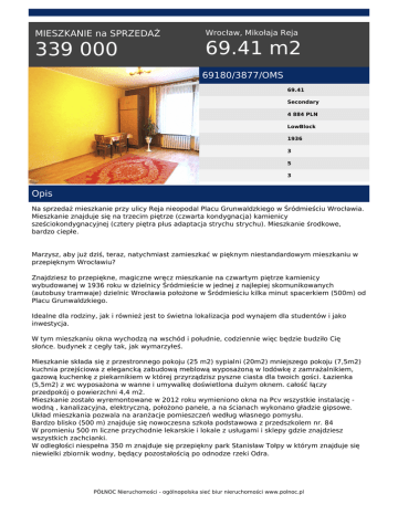 MIESZKANIE na SPRZEDAŻ 339 000 Wrocław, Mikołaja Reja 69.41 m2 69180/3877/OMS 69.41 Secondary 4 884 PLN LowBlock 1936 3 5 3 Opis Na sprzedaż mieszkanie przy ulicy Reja nieopodal Placu Grunwaldzkiego w Śródmieściu Wrocławia. Mieszkanie znajduje się na trzecim piętrze (czwarta kondygnacja) kamienicy sześciokondygnacyjnej (cztery piętra plus adaptacja strychu strychu). Mieszkanie środkowe, bardzo ciepłe. Marzysz, aby już dziś, teraz, natychmiast zamieszkać w pięknym niestandardowym mieszkaniu w przepięknym Wrocławiu? Znajdziesz to przepiękne, magiczne wręcz mieszkanie na czwartym piętrze kamienicy wybudowanej w 1936 roku w dzielnicy Śródmieście w jednej z najlepiej skomunikowanych (autobusy tramwaje) dzielnic Wrocławia położone w Śródmieściu kilka minut spacerkiem (500m) od Placu Grunwaldzkiego. Idealne dla rodziny, jak i również jest to świetna lokalizacja pod wynajem dla studentów i jako inwestycja. W tym mieszkaniu okna wychodzą na wschód i południe, codziennie więc będzie budziło Cię słońce. budynek z cegły tak, jak wymarzyłeś. Mieszkanie składa się z przestronnego pokoju (25 m2) sypialni (20m2) mniejszego pokoju (7,5m2) kuchnia przejściowa z elegancką zabudową meblową wyposażoną w lodówkę z zamrażalnikiem, gazową kuchenkę z piekarnikiem w której przyrządzisz pyszne ciasta dla twoich gości. Łazienka (5,5m2) z wc wyposażona w wanne i umywalkę doświetlona dużym oknem. całość łączy przedpokój o powierzchni 4,4 m2. Mieszkanie zostało wyremontowane w 2012 roku wymieniono okna na Pcv wszystkie instalację wodną , kanalizacyjna, elektryczną, położono panele, a na ścianach wykonano gładzie gipsowe. Układ mieszkania pozwala na aranżacje pomieszczeń według własnego pomysłu. Bardzo blisko (500 m) znajduje się nowoczesna szkoła podstawowa z przedszkolem nr. 84 W promieniu 500 m liczne przychodnie lekarskie i lokale z usługami i sklepy gdzie znajdziesz wszystkich zachcianki. W odległości niespełna 350 m znajduje się przepiękny park Stanisław Tołpy w którym znajduje się niewielki zbiornik wodny, będący pozostałością po odnodze rzeki Odra. PÓŁNOC Nieruchomości - ogólnopolska sieć biur nieruchomości www.polnoc.pl Dla inwestorów to mieszkanie jest idealną propozycją pod wynajem dla studentów istnieje możliwość wykonania do 6 pokojów (bardzo dobry zwrot z inwestycji), a lokalizacja która jest idealna pod względem odległości do uczelni przekona każdego przyszłego studenta do zamieszkania w tym urokliwym mieszkaniu. Lokalizacja mieszkania: - Niepubliczna Wyższa Szkoła Medyczna, ul. Nowowiejska 250 m - Plac Grunwaldzki 900 m - Pasaż Grunwaldzki 600 m - Politechnika Wrocławska Wybrzeże Wyspiańskiego 27 1,3 km - SWPS Uniwersytet Humanistycznospołeczny 1 km - Uniwersytet Medyczny Wybrzeże L. Pasteura 1,6 km - Akademia Wychowania Fizycznego ul. Paderewskiego 2,5 km - Akademia Sztuk Pięknych pl. Polski 1,8 km - Uniwersytet Wrocławski pl. Uniwersytecki 2,2 km - Akademia Muzyczna im. K. Lipińskiego pl. Jana Pawła 3,4 km - Papieski Wydział Teologiczny ul. Katedralna 1,4 km - Skwer Obrońców Westerplatte, 300 m - Park Stanisława Tołpy 350 m - Wyspa słodowa 1,9 km Dokładna lokalizacja Wrocław dzielnica Wrocław Śródmieście Plac Grunwaldzki ul. Reja (nie daleko ul. Plac Grunwaldzki ul Sienkiewicza ul. Nowowiejska ul. Wyszyńskiego ) Mieszkanie jest warte zainteresowania ze względu na swoją lokalizacje i stosunku ceny do metrażu . Nie pozwól aby aby Cię ktoś wyprzedził. Zapraszam na prezentację oraz po więcej informacji. Kontakt: Grześkowiak Iwona PÓŁNOC Nieruchomości Wrocław tel: 502325417 nr licencji osoby odpowiedzialnej zawodowo: 20737 e-mail: [email protected] Więcej ofert na www.polnoc.pl/wroclaw/ * UWAGA! Zamieszczone na naszych stronach oferty nie stanowią oferty w rozumieniu Kodeksu Cywilnego, a dane w nich zawarte mają jedynie charakter informacyjny. Copyright © by Nieruchomości Północ Wrocław 1 2016 Wszelkie prawa zastrzeżone. Kopiowanie, rozpowszechnianie oraz korzystanie z niniejszych materiałów w jakikolwiek inny sposób wykraczający poza dozwolony użytek określony przepisami ustawy z 4 lutego 1994 r. o prawie autorskim i prawach pokrewnych (Dz. U. 1994, nr 24 poz. 83 z późn. zm.) bez pisemnej zgody Nieruchomości Północ Wrocław 1 jest zabronione i może stanowić podstawę odpowiedzialności cywilnej oraz karnej. Ponadto niniejsze materiały stanowią tajemnicę przedsiębiorstwa Nieruchomości północ Wrocław 1. w rozumieniu ustawy z dnia 16 kwietnia 1993 r. o zwalczaniu nieuczciwej konkurencji (Dz. U. z 2003 r., Nr 153, poz. 1503 z późn. zm.). Niniejsze ogłoszenie nie stanowi oferty w rozumieniu Kodeksu Cywilnego, lecz ma charakter informacyjny. Więcej ofert znajdziesz na naszej stronie www.polnoc.pl * UWAGA! Zamieszczone na naszych stronach oferty nie stanowią oferty w rozumieniu Kodeksu Cywilnego, a dane w nich zawarte mają jedynie charakter informacyjny. PÓŁNOC Nieruchomości - ogólnopolska sieć biur nieruchomości www.polnoc.pl Iwona Grześkowiak tel. 502-325-417 email: [email protected] PÓŁNOC Nieruchomości - ogólnopolska sieć biur nieruchomości www.polnoc.pl Powered by TCPDF (www.tcpdf.org)