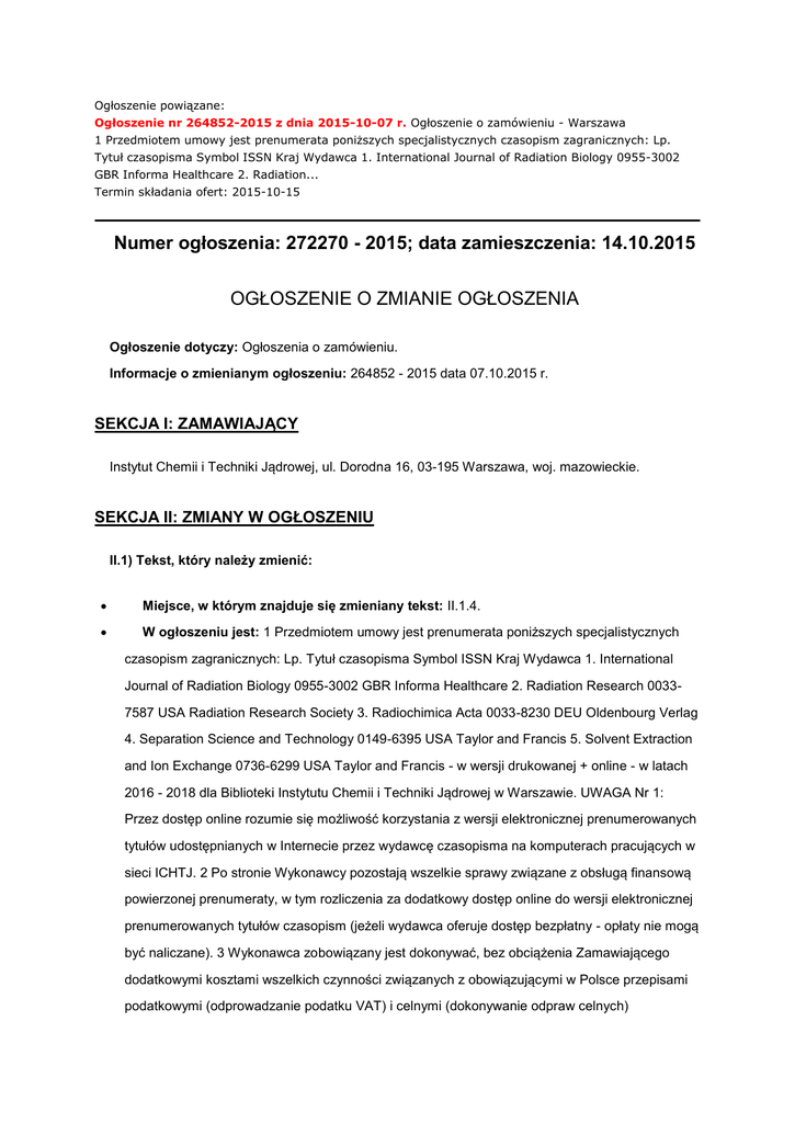 Ogłoszenie powiązane: Ogłoszenie nr 264852-2015 z dnia 2015-10-07 r. Ogłoszenie o zamówieniu - Warszawa 1 Przedmiotem umowy jest prenumerata poniższych specjalistycznych czasopism zagranicznych: Lp. Tytuł czasopisma Symbol ISSN Kraj Wydawca 1. International Journal of Radiation Biology 0955-3002 GBR Informa Healthcare 2. Radiation... Termin składania ofert: 2015-10-15 Numer ogłoszenia: 272270 - 2015; data zamieszczenia: 14.10.2015 OGŁOSZENIE O ZMIANIE OGŁOSZENIA Ogłoszenie dotyczy: Ogłoszenia o zamówieniu. Informacje o zmienianym ogłoszeniu: 264852 - 2015 data 07.10.2015 r. SEKCJA I: ZAMAWIAJĄCY Instytut Chemii i Techniki Jądrowej, ul. Dorodna 16, 03-195 Warszawa, woj. mazowieckie. SEKCJA II: ZMIANY W OGŁOSZENIU II.1) Tekst, który należy zmienić: Miejsce, w którym znajduje się zmieniany tekst: II.1.4. W ogłoszeniu jest: 1 Przedmiotem umowy jest prenumerata poniższych specjalistycznych czasopism zagranicznych: Lp. Tytuł czasopisma Symbol ISSN Kraj Wydawca 1. International Journal of Radiation Biology 0955-3002 GBR Informa Healthcare 2. Radiation Research 00337587 USA Radiation Research Society 3. Radiochimica Acta 0033-8230 DEU Oldenbourg Verlag 4. Separation Science and Technology 0149-6395 USA Taylor and Francis 5. Solvent Extraction and Ion Exchange 0736-6299 USA Taylor and Francis - w wersji drukowanej + online - w latach 2016 - 2018 dla Biblioteki Instytutu Chemii i Techniki Jądrowej w Warszawie. UWAGA Nr 1: Przez dostęp online rozumie się możliwość korzystania z wersji elektronicznej prenumerowanych tytułów udostępnianych w Internecie przez wydawcę czasopisma na komputerach pracujących w sieci ICHTJ. 2 Po stronie Wykonawcy pozostają wszelkie sprawy związane z obsługą finansową powierzonej prenumeraty, w tym rozliczenia za dodatkowy dostęp online do wersji elektronicznej prenumerowanych tytułów czasopism (jeżeli wydawca oferuje dostęp bezpłatny - opłaty nie mogą być naliczane). 3 Wykonawca zobowiązany jest dokonywać, bez obciążenia Zamawiającego dodatkowymi kosztami wszelkich czynności związanych z obowiązującymi w Polsce przepisami podatkowymi (odprowadzanie podatku VAT) i celnymi (dokonywanie odpraw celnych) dotyczącymi dostarczania prenumeraty do siedziby Zamawiającego zgodnie ze stanem prawnym obowiązującym w okresie trwania umowy. 4 Wysokość wszelkich marż i bonifikat naliczonych przez Wykonawcę dla prenumeraty dotyczącej 2016 roku nie może ulec zmianie i musi obowiązywać dla prenumeraty dotyczącej roku 2017 i 2018. 5 Wykonawca musi zapewnić Zamawiającemu elektroniczny dostęp do informacji, związanych z realizacją zamówienia. 6 Wykonawca powinien informować o wszelkich zmianach wydawniczych. 7 Rozliczenia miedzy Zamawiającym a Wykonawcą będą prowadzone wyłącznie w walucie krajowej PLN. 8 Zasady i warunki płatności są zawarte we wzorze umowy stanowiącym Załącznik Nr 3 do SIWZ.. W ogłoszeniu powinno być: 1 Przedmiotem umowy jest prenumerata poniższych specjalistycznych czasopism zagranicznych: Lp. Tytuł czasopisma Symbol ISSN Kraj Wydawca 1. International Journal of Radiation Biology 0955-3002 GBR Informa Healthcare 2. Radiation Research 0033-7587 USA Radiation Research Society 3. Radiochimica Acta 0033-8230 DEU Oldenbourg Verlag 4. Separation Science and Technology 0149-6395 USA Taylor and Francis 5. Solvent Extraction and Ion Exchange 0736-6299 USA Taylor and Francis (w wersji drukowanej + online) w latach 2016 - 2018 dla Biblioteki Instytutu Chemii i Techniki Jądrowej w Warszawie. UWAGA Nr 1: Przez dostęp online rozumie się możliwość korzystania z wersji elektronicznej prenumerowanych tytułów udostępnianych w Internecie przez wydawcę czasopisma na komputerach pracujących w sieci ICHTJ. 2 Po stronie Wykonawcy pozostają wszelkie sprawy związane z obsługą finansową powierzonej prenumeraty, w tym rozliczenia za dodatkowy dostęp online do wersji elektronicznej prenumerowanych tytułów czasopism (jeżeli wydawca oferuje dostęp bezpłatny - opłaty nie mogą być naliczane). 3 Wykonawca zobowiązany jest dokonywać, bez obciążenia Zamawiającego dodatkowymi kosztami wszelkich czynności związanych z obowiązującymi w Polsce przepisami podatkowymi (odprowadzanie podatku VAT) i celnymi (dokonywanie odpraw celnych) dotyczącymi dostarczania prenumeraty do siedziby Zamawiającego zgodnie ze stanem prawnym obowiązującym w okresie trwania umowy. 4 Wysokość wszelkich marż i bonifikat naliczonych przez Wykonawcę dla prenumeraty dotyczącej 2016 roku nie może ulec zmianie i musi obowiązywać dla prenumeraty dotyczącej roku 2017 i 2018. Zamawiający dopuszcza możliwość zmiany ceny prenumeraty w latach 2017 i 2018 na wniosek i po przedstawieniu przez Wykonawcę uzasadnionych i udokumentowanych kosztów wynikających ze wzrostu cen czasopism podanych przez wydawców i wskazanych wartości przeliczników walut (wg średniego kursu sprzedaży walut podanych przez NBP). 5 Wykonawca musi zapewnić Zamawiającemu elektroniczny dostęp do informacji, związanych z realizacją zamówienia. 6 Wykonawca powinien informować o wszelkich zmianach wydawniczych. 7 Rozliczenia miedzy Zamawiającym a Wykonawcą będą prowadzone wyłącznie w walucie krajowej (PLN). 8 Zasady i warunki płatności są zawarte we wzorze umowy stanowiącym Załącznik Nr 3 do SIWZ. Miejsce, w którym znajduje się zmieniany tekst: IV.3. W ogłoszeniu jest: Zamawiający przewiduje zmiany w treści zawartej umowy w stosunku do treści oferty dotyczące: 1) skreślenia z prenumeraty na rok 2017 i 2018 niektórych tytułów czasopism, w przypadku dysponowania niedostateczną ilością środków finansowych; 2) terminu płatności i terminu realizacji umowy w przypadkach określanych we wzorze umowy stanowiącym Załącznik Nr 3 do SIWZ; 3) zmiany obowiązującej stawki VAT potwierdzonej odpowiednimi ustawami i/lub stosownymi aktami wykonawczymi do tych ustaw obowiązujących na terenie Polski. W ogłoszeni