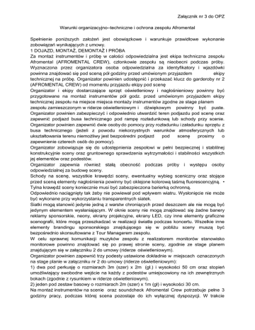 Załącznik nr 3 do OPZ Warunki organizacyjno–techniczne i ochrona zespołu Afromental Spełnienie poniższych założeń jest obowiązkowe i warunkuje prawidłowe wykonanie zobowiązań wynikających z umowy. 1 DOJAZD, MONTAŻ, DEMONTAŻ I PRÓBA Za montaż instrumentów i próbę w całości odpowiedzialna jest ekipa techniczna zespołu Afromental (AFROMENTAL CREW), członkowie zespołu są nieobecni podczas próby. Wyznaczona przez organizatora osoba odpowiedzialna za identyfikatory i wjazdówki powinna znajdować się pod sceną pół godziny przed umówionym przyjazdem ekipy technicznej na próbę. Organizator powinien udostępnić i przekazać klucz do garderoby nr 2 (AFROMENTAL CREW) od momentu przyjazdu ekipy pod scenę Organizator i ekipy dostarczające sprzęt oświetleniowy i nagłośnieniowy powinny być przygotowane na montaż instrumentów pół godz. przed umówionym przyjazdem ekipy technicznej zespołu na miejsce miejsca montaży instrumentów zgodne ze stage planem zespołu zamieszczonym w riderze oświetleniowym i dźwiękowym powinny być puste. Organizator powinien zabezpieczyć i odpowiednio utwardzić teren podjazdu pod scenę oraz zapewnić podjazd busa technicznego pod rampę rozładunkową lub schody przy scenie. Organizator powinien zapewnić dwie osoby do pomocy przy rozładunku i załadunku sprzętu z busa technicznego (jeżeli z powodu niekorzystnych warunków atmosferycznych lub ukształtowania terenu niemożliwy jest bezpośredni podjazd pod scenę prosimy o zapewnienie czterech osób do pomocy). Organizator zobowiązuje się do udostępnienia zespołowi w pełni bezpiecznej i stablilnej konstrukcyjnie sceny oraz gruntownego sprawdzenia wytrzymałości i stabilności wszystkich jej elementów oraz podestów. Organizator zapewnia również stałą obecność podczas próby i występu osoby odpowiedzialnej za budowę sceny. Schody na scenę, wszystkie krawędzi sceny, ewentualny wybieg sceniczny oraz stojące przed sceną elementy nagłośnienia powinny być oklejone kolorową taśmą fluorescencyjną. • Tylna krawędź sceny koniecznie musi być zabezpieczona barierką ochronną. Odpowiednio naciągnięty tak żeby nie powiewał pod wpływem wiatru. Wysłonięcie nie może być wykonane przy wykorzystaniu transparentnych siatek. Siatki mogą stanowić jedynie jedną z warstw chroniących przed deszczem ale nie mogą być jedynym elementem wysłaniającym. W oknie sceny nie mogą znajdować się żadne banery reklamy sponsorskie, neony, ekrany projekcyjne, ekrany LED, czy inne elementy graficzne scenografii, które mogą przeszkadzać w realizacji światła podczas koncertu. Wszelkie inne elementy brandingu sponsorskiego znajdującego się w pobliżu sceny muszą być bezpośrednio skonsultowane z Tour Managerem zespołu. W celu sprawnej komunikacji muzyków zespołu z realizatorem monitorów stanowisko monitorowe powinno znajdować się po prawej stronie sceny, zgodnie ze stage planem znajdującym się w załączniku 2 do umowy (riderze oświetleniowym). Organizator powinien zapewnić trzy podesty ustawione dokładnie w miejscach oznaczonych na stage planie w załączniku nr 2 do umowy (riderze oświetleniowym): 1) dwa pod perkusję o rozmiarach 3m (szer) x 2m (gł.) i wysokości 50 cm oraz stopień umożliwiający swobodne wejście na każdy z podestów umiejscowiony na ich zewnętrznych bokach (zgodnie z rysunkiem w riderze oświetleniowym). 2) jeden pod zestaw basowy o rozmiarach 2m (szer) x 1m (gł) i wysokości 30 cm. Na montaż instrumentów na scenie oraz soundcheck Afromental Crew potrzebuje pełne 3 godziny pracy, podczas której scena pozostaje do ich wyłącznej dyspozycji. W trakcie trwania próby na scenie mogą przebywać tylko i wyłącznie osoby z ekipy technicznej zespołu Afromental oraz ekip odpowiedzialnych za budowę sceny, nagłośnienie i oświetlenie sceny. W trakcie trwania próby na scenie nie mogą odbywać się żadne przemowy, konkursy czy inne formy występów artystycznych. Po przeprowadzeniu próby wszystkie instrumenty i inne elementy backlinu powinny zostać w tych samych miejscach w których zostały pozostawione przez Afromental Crew. Ewentualne ich przesunięcia powinny być konsultowane bezpośrednio po próbie tylko i wyłącznie ekipa Afromental Crew może podejmować decyzje w tym zakresie. Ilość okablowania na scenie powinna być zredukowana do niezbędnego minimum, wszystkie kable powinny być odpowiednio oklejone i zabezpieczone. W przypadku zalania sceny deszczem przed, w trakcie lub po próbie, organizator zobowiązują się do jej wyszyszczenia i osuszenia oraz przywrócenia do stanu umożliwiającego bezpieczną kontynuację pracy i realizację koncertu. W przypadku potrzeby szybkiego demontażu instrumentów ze sceny po koncercie konieczne jest zorganizowanie odpowiednio utwardzonej (oraz w przypadku deszczu zadaszonej) przestrzeni przy scenie w celu sprawnego zniesienia instrumentów i backlinu. Droga prowadząca do schodów na scene powinna być odpowiednio i trwale utwardzona na wypadek deszczu. Organizator powinien zabezpieczyć na backstage’u miejsca parkingowe dla 2 busów zespołowych. Miejsca te powinny znajdować się w najbliższej odległości od garderób. W razie pytań dotyczących powyższych warunków oraz w razie potrzeby skontaktowania się zAfromental Crew: Hubert Puchta 663 443 888 [email protected] Dariusz Lubiński 660 442 399 [email protected] 2.OCHRONA I BEZPIECZEŃSTWO: Osobą odpowiedzialną w zakresie warunków dotyczących bezpieczeństwa i ochrony ze strony zespołu jest Paweł Buncler tel. 608 282 910 Organizator powinien zapewnić podczas koncertu co najmniej 13 agentów ochrony na terenie bezpośrednio otaczającym scenę (przestrzeń przed sceną, schody po bokach sceny, gardreroby zespołu, korytarz oraz FOH) Barierki ochronne powinny znajdować się w odległości min 3 m przed sceną. FOH musi być odpowiednio zabezpieczony z każdej strony barierkami ochronnymi a p