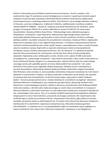 Kohnert, internowany przez Polaków uczestnik marszu do Łowicza, stracił w związku z tym wydarzeniem nogę. Po uwolnieniu wracał do Bydgoszczy na rowerze i wpadł pod niemiecki pojazd wojskowy. Konieczna była amputacja w berlińskiej klinice profesora Sauerbrucha, dokąd został przetransportowany z osobistego polecenia Hitlera. Hans Kohnert, syn pruskiego kolonisty urodzony w Poznaniu, uczył się w Bydgoszczy, studiował w Gdańsku, zadeklarowany narodowy socjalista, członek NSDAP Nr 7848301 , członek SS. Sztabowy pracownik Reichsführera SS Himmlera. Został przyjęty 13 listopada 1939 do SS w stopniu Oberführera. Numer SS 356 871.W czasie wojny Gauamtsleiter i Gaubauernführer Kraju Warty – hitlerowskiego tworu administracyjnego w Wielkopolce, na Kujawach i części Mazowsza. Administracja tego Okręgu Rzeszy skutecznie realizowała politykę Holocaustu i germanizacji na tych terenach wcielonych do Rzeszy realizując politykę osiedleń i wysiedleń stosownie do przynależności narodowej. Gaubauernführer odpowiadał politycznie za politykę rolną, w tym reglamentację żywności. Ta dziedzina wykorzystywana była do realizacji narodowosocjalistycznych celów czystki rasowej i uporządkowania miejsc w społeczeństwie zależnie od jakości rasowej. Stąd kartki na żywność zróżnicowane zależnie od przynależności narodowej i pozycji rasowej, lokale gastronomiczne „Nur für Deutsche” no i głodowe przydziały żywności dla przeznaczonych do unicestwienia. Na terenie Kraju Warty funkcjonowały getta żydowskie. Najbardziej znane wielkie getto w Łodzi. Zmarło w nim z głodu 45 000 osób zanim przystąpiono do „ostatecznego rozwiązania”. Hans Kohnert pod koniec wojny uciekł z Kraju Warty na tereny rdzennych Niemiec (pojęcie mu z pewnością obce rdzenne Niemcy były też tutaj) unikając surowego wyroku jaki spotkałby pewnie ze strony władz polskich lub sowieckich. Tam został ponownie internowany przez angielskie władze okupacyjne. Poddany ocenie i sprawdzeniu w procesie denazyfikacji. Wybroniła go Niemka Walburg Lehfeldt, właścicielka majątku Powodowo koło Wolsztyna, która zeznała, że „byli przywódcy niemieckiej mniejszości narodowej nie mieli dużych wpływów w nazistowskich urzędach, nie byli już potrzebni, próbowano się ich pozbyć, dla nazistów ich postawa była zbyt chrześcijańska, nie byli też wystarczająco rygorystyczni wobec Polaków i Żydów.” Zeznania jej były jednostronne i niezbyt obiektywne w kontekście szczególnej” aktywności lokalnych Niemców w Wielkopolsce oraz znajomości jej męża Dietza, aktywnego działacza DtV z Kohnertem i innymi ideologami tej partii. Jednak w okresie po norymberskim pani Walburg Lehfeldt miała duże wpływy u aliantów jako osoba pozostająca w czasie wojny w kontaktach ze znaczącymi oficerami Abwehry z admirałem Canarisem na czele (zaliczonymi wtedy przez zachodnich aliantów do tzw. niemieckiego ruchu oporu). Tym, że to właśnie Lehfeldt świadczyła przed angielskimi władzami okupacyjnymi na rzecz Hansa Kohnerta, przyczyniła się do jego uwolnienia. Nie rozpatrywano zbyt wnikliwie tego co działo się wcześniej w Polsce i okupacyjnym Kraju Warty, gdyż polityczna kurtyna zamykała się właśnie wtedy na wiele kolejnych lat. Po wojnie Hans Kohnert był aktywnym działaczem Ziomkowstwa Prus Zachodnich, organizacji rewizjonistycznej, której idee kultywuje gorliwie Erika Steinbach, co wskazuje na to, że prawdopodobnie nigdy nie zrewidował swych poglądów na temat niemieckości ziem swych stron rodzinnych związanych z młodością, w tym Bydgoszczy.