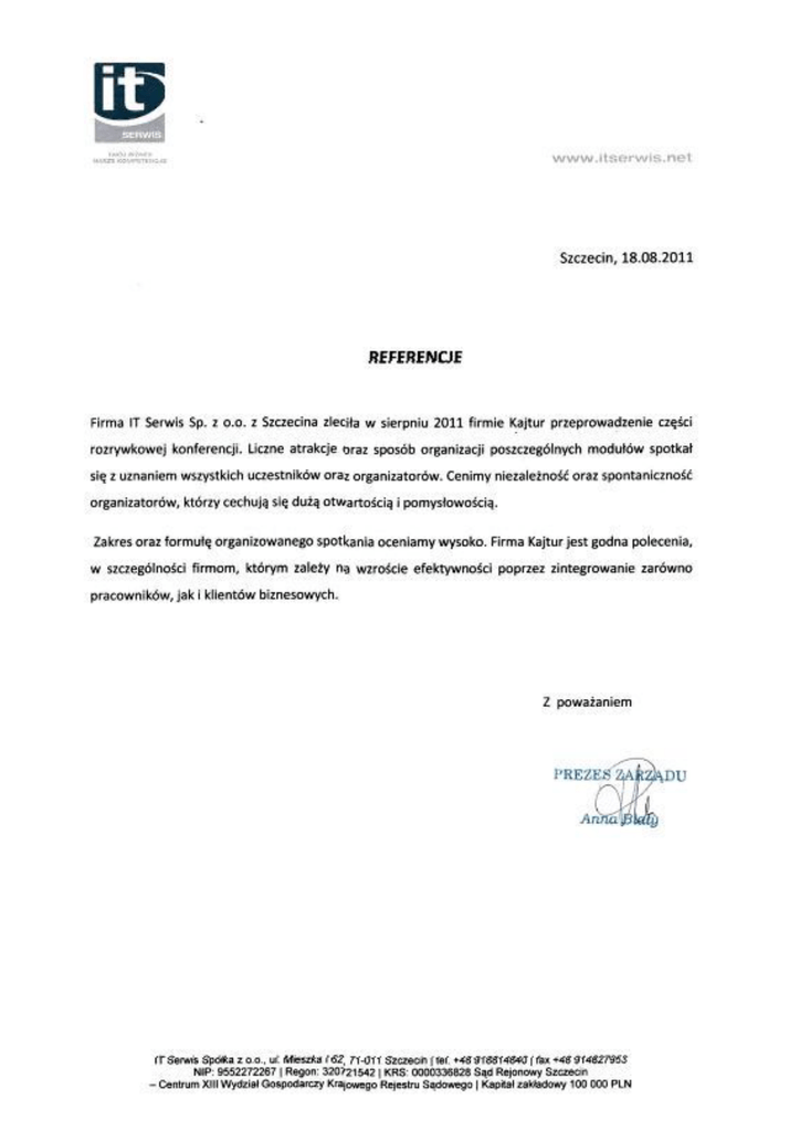 it serwis www.itserwis.net Szczecin, 18.08.2011 REFERENCJE Firma IT Serwis Sp. z o.o. z Szczecina zleciła w sierpniu 2011 firmie Kajtur przeprowadzenie części rozrywkowej konferencji. Liczne atrakcje oraz sposób organizacji poszczególnych m o d u ł ó w spotkał się z uznaniem wszystkich uczestników oraz organizatorów. Cenimy niezależność oraz spontaniczność organizatorów, którzy cechują się dużą otwartością i pomysłowością. Zakres oraz formułę organizowanego spotkania oceniamy wysoko. Firma Kajtur jest godna polecenia, w szczególności f i r m o m , k t ó r y m zalety na wzroście efektywności poprzez zintegrowanie zarówno p r a c o w n i k ó w , jakik l i e n t ó w biznesowych. IT Serwis Spółka z o.o., ul Mieszka I 62, 71-011 Szczecin / tel. +48 918814840 / fax +48 914827953