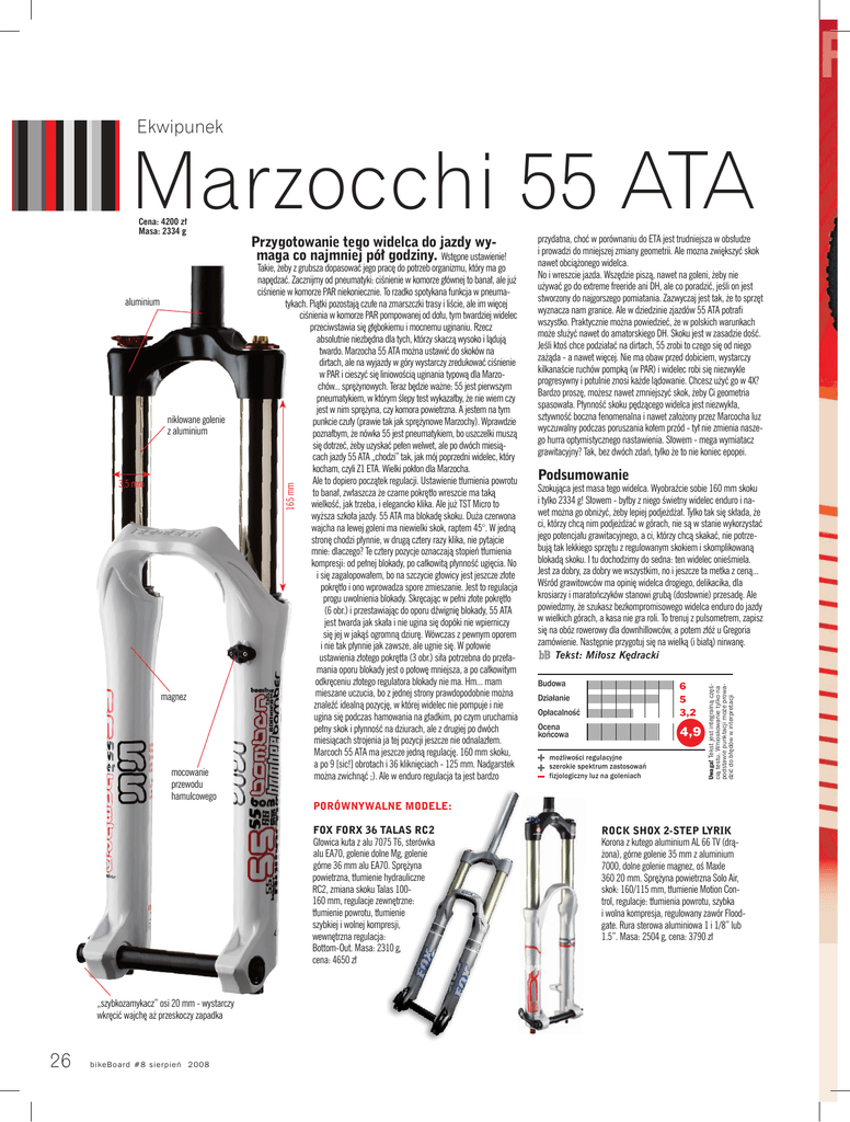 Ekwipunek Marzocchi 55 ATA aluminium niklowane golenie z aluminium Takie, żeby z grubsza dopasować jego pracę do potrzeb organizmu, który ma go napędzać. Zacznijmy od pneumatyki: ciśnienie w komorze głównej to banał, ale już ciśnienie w komorze PAR niekoniecznie. To rzadko spotykana funkcja w pneumatykach. Piątki pozostają czułe na zmarszczki trasy i liście, ale im więcej ciśnienia w komorze PAR pompowanej od dołu, tym twardziej widelec przeciwstawia się głębokiemu i mocnemu uginaniu. Rzecz absolutnie niezbędna dla tych, którzy skaczą wysoko i lądują twardo. Marzocha 55 ATA można ustawić do skoków na dirtach, ale na wyjazdy w góry wystarczy zredukować ciśnienie w PAR i cieszyć się liniowością uginania typową dla Marzochów... sprężynowych. Teraz będzie ważne: 55 jest pierwszym pneumatykiem, w którym ślepy test wykazałby, że nie wiem czy jest w nim sprężyna, czy komora powietrzna. A jestem na tym punkcie czuły (prawie tak jak sprężynowe Marzochy). Wprawdzie poznałbym, że nówka 55 jest pneumatykiem, bo uszczelki muszą się dotrzeć, żeby uzyskać pełen welwet, ale po dwóch miesiącach jazdy 55 ATA „chodzi” tak, jak mój poprzedni widelec, który kocham, czyli Z1 ETA. Wielki pokłon dla Marzocha. Ale to dopiero początek regulacji. Ustawienie tłumienia powrotu to banał, zwłaszcza że czarne pokrętło wreszcie ma taką wielkość, jak trzeba, i elegancko klika. Ale już TST Micro to wyższa szkoła jazdy. 55 ATA ma blokadę skoku. Duża czerwona wajcha na lewej goleni ma niewielki skok, raptem 45°. W jedną stronę chodzi płynnie, w drugą cztery razy klika, nie pytajcie mnie: dlaczego? Te cztery pozycje oznaczają stopień tłumienia kompresji: od pełnej blokady, po całkowitą płynność ugięcia. No i się zagalopowałem, bo na szczycie głowicy jest jeszcze złote pokrętło i ono wprowadza spore zmieszanie. Jest to regulacja progu uwolnienia blokady. Skręcając w pełni złote pokrętło (6 obr.) i przestawiając do oporu dźwignię blokady, 55 ATA jest twarda jak skała i nie ugina się dopóki nie wpierniczy się jej w jakąś ogromną dziurę. Wówczas z pewnym oporem i nie tak płynnie jak zawsze, ale ugnie się. W połowie ustawienia złotego pokrętła (3 obr.) siła potrzebna do przełamania oporu blokady jest o połowę mniejsza, a po całkowitym odkręceniu złotego regulatora blokady nie ma. Hm... mam mieszane uczucia, bo z jednej strony prawdopodobnie można znaleźć idealną pozycję, w której widelec nie pompuje i nie ugina się podczas hamowania na gładkim, po czym uruchamia pełny skok i płynność na dziurach, ale z drugiej po dwóch miesiącach strojenia ja tej pozycji jeszcze nie odnalazłem. Marcoch 55 ATA ma jeszcze jedną regulację. 160 mm skoku, a po 9 [sic!] obrotach i 36 kliknięciach - 125 mm. Nadgarstek można zwichnąć ;). Ale w enduro regulacja ta jest bardzo 165 mm 3,5 mm Przygotowanie tego widelca do jazdy wymaga co najmniej pół godziny. Wstępne ustawienie! magnez mocowanie przewodu hamulcowego 26 bi k eB oar d #8 si erpień 2008 Podsumowanie Szokująca jest masa tego widelca. Wyobraźcie sobie 160 mm skoku i tylko 2334 g! Słowem - byłby z niego świetny widelec enduro i nawet można go obniżyć, żeby lepiej podjeżdżał. Tylko tak się składa, że ci, którzy chcą nim podjeżdżać w górach, nie są w stanie wykorzystać jego potencjału grawitacyjnego, a ci, którzy chcą skakać, nie potrzebują tak lekkiego sprzętu z regulowanym skokiem i skomplikowaną blokadą skoku. I tu dochodzimy do sedna: ten widelec onieśmiela. Jest za dobry, za dobry we wszystkim, no i jeszcze ta metka z ceną... Wśród grawitowców ma opinię widelca drogiego, delikacika, dla krosiarzy i maratończyków stanowi grubą (dosłownie) przesadę. Ale powiedzmy, że szukasz bezkompromisowego widelca enduro do jazdy w wielkich górach, a kasa nie gra roli. To trenuj z pulsometrem, zapisz się na obóz rowerowy dla downhillowców, a potem złóż u Gregoria zamówienie. Następnie przygotuj się na wielką (i białą) nirwanę. Tekst: Miłosz Kędracki Budowa Opłacalność 6 5 3,2 Ocena końcowa 4,9 Działanie możliwości regulacyjne szerokie spektrum zastosowań fizjologiczny luz na goleniach PORÓWNYWALNE MODELE: FOX FORX 36 TALAS RC2 Głowica kuta z alu 7075 T6, sterówka alu EA70, golenie dolne Mg, golenie górne 36 mm alu EA70. Sprężyna powietrzna, tłumienie hydrauliczne RC2, zmiana skoku Talas 100160 mm, regulacje zewnętrzne: tłumienie powrotu, tłumienie szybkiej i wolnej kompresji, wewnętrzna regulacja: Bottom-Out. Masa: 2310 g, cena: 4650 zł „szybkozamykacz” osi 20 mm - wystarczy wkręcić wajchę aż przeskoczy zapadka przydatna, choć w porównaniu do ETA jest trudniejsza w obsłudze i prowadzi do mniejszej zmiany geometrii. Ale mozna zwiększyć skok nawet obciążonego widelca. No i wreszcie jazda. Wszędzie piszą, nawet na goleni, żeby nie używać go do extreme freeride ani DH, ale co poradzić, jeśli on jest stworzony do najgorszego pomiatania. Zazwyczaj jest tak, że to sprzęt wyznacza nam granice. Ale w dziedzinie zjazdów 55 ATA potrafi wszystko. Praktycznie można powiedzieć, że w polskich warunkach może służyć nawet do amatorskiego DH. Skoku jest w zasadzie dość. Jeśli ktoś chce podziałać na dirtach, 55 zrobi to czego się od niego zażąda - a nawet więcej. Nie ma obaw przed dobiciem, wystarczy kilkanaście ruchów pompką (w PAR) i widelec robi się niezwykle progresywny i potulnie znosi każde lądowanie. Chcesz użyć go w 4X? Bardzo proszę, możesz nawet zmniejszyć skok, żeby Ci geometria spasowała. Płynność skoku pędzącego widelca jest niezwykła, sztywność boczna fenomenalna i nawet założony przez Marcocha luz wyczuwalny podczas poruszania kołem przód - tył nie zmienia naszego hurra optymistycznego nastawienia. Słowem - mega wymiatacz grawitacyjny? Tak, bez dwóch zdań, tylko że to nie koniec epopei. Uwaga! Tekst jest in