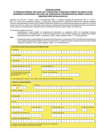 OŚWIADCZENIE O PRZEKAZYWANIU SKŁADKI DO OTWARTEGO FUNDUSZU EMERYTALNEGO ALBO ZEWIDENCJONOWANIU SKŁADKI NA SUBKONCIE PROWADZONYM PRZEZ ZAKŁAD UBEZPIECZEŃ SPOŁECZNYCH Zgodnie z art. 39a ust. 1 ustawy z dnia 13 października 1998 r. o systemie ubezpieczeń społecznych (Dz. U. z 2015 r. poz. 121, z późn. zm.) począwszy od 2016 r., co cztery lata, w okresie od dnia 1 kwietnia do dnia 31 lipca, członek otwartego funduszu emerytalnego lub osoba, której Zakład Ubezpieczeń Społecznych ewidencjonuje składkę na subkoncie, o którym mowa w art. 40a ww. ustawy, ma możliwość zmiany decyzji w zakresie przekazywania do otwartego funduszu emerytalnego części składki na ubezpieczenie emerytalne albo zewidencjonowania tej części składki na subkoncie. W przypadku podjęcia decyzji o: – przekazywaniu części składki na ubezpieczenie emerytalne, w wysokości 2,92%, do otwartego funduszu emerytalnego (w konsekwencji na subkoncie prowadzonym przez Zakład Ubezpieczeń Społecznych będzie ewidencjonowana część składki w wysokości 4,38%), należy wypełnić część I, II i III oświadczenia, albo – zewidencjonowaniu części składki na ubezpieczenie emerytalne, w wysokości 2,92%, na subkoncie prowadzonym przez Zakład Ubezpieczeń Społecznych (w konsekwencji na subkoncie będzie ewidencjonowana część składki w łącznej wysokości 7,3%), należy wypełnić część I, II i IV oświadczenia. I. dane identyfikacyjne składającego oświadczenie 01. Nazwisko 02. Imię pierwsze 03. Imię drugie 04. Data urodzenia (dd / mm / rrrr) 05. Numer PESEL (1) 06. Rodzaj dokumentu tożsamości: jeśli dowód osobisty, wpisać 1, jeśli paszport – 2 07. Seria i numer dokumentu (1) W przypadku gdy nie nadano numeru PESEL, należy wpisać serię i numer dowodu osobistego lub paszportu. II. ADRES DO KORESPONDENCJI 01. Kod pocztowy 02. Poczta – 03. Gmina / Dzielnica 04. Miejscowość 05. Ulica 06. Numer domu 10. Zagraniczny kod pocztowy (2) 07. Numer lokalu 08. Numer telefonu (1) 11. Nazwa państwa (2) 12. Adres poczty elektronicznej (1) (1) Podanie numeru telefonu oraz adresu poczty elektronicznej nie jest obowiązkowe. (2) Wypełnić w przypadku gdy adres jest inny niż polski. 09. Symbol państwa (2) III. OŚWIADCZENIE O PRZEKAZYWANIU CZĘŚCI SKŁADKI DO OTWARTEGO FUNDUSZU EMERYTALNEGO Na podstawie art. 39a ust. 1 pkt 1 ustawy z dnia 13 października 1998 r. o systemie ubezpieczeń społecznych oświadczam, że chcę, aby część składki na ubezpieczenie emerytalne, o której mowa w art. 22 ust. 3 pkt 1 lit. a ww. ustawy, począwszy od składki opłaconej za lipiec, była przekazywana do: – otwartego funduszu emerytalnego, którego jestem członkiem albo – otwartego funduszu emerytalnego wskazanego poniżej (należy wypełnić w przypadku zamiaru zawarcia pierwszej umowy z otwartym funduszem emerytalnym albo zamiaru zmiany otwartego funduszu emerytalnego): AEGON OFE Allianz Polska OFE Aviva OFE Aviva BZ WBK AXA OFE Generali OFE MetLife OFE NationaleNederlanden OFE Nordea OFE Pekao OFE PKO BP Bankowy OFE OFE Pocztylion OFE PZU „Złota Jesień” Należy wpisać X w polu z prawej strony ........................................................ podpis składającego oświadczenie W przypadku złożenia oświadczenia o zamiarze zawarcia pierwszej umowy z otwartym funduszem emerytalnym albo zamiarze zmiany otwartego funduszu emerytalnego przepisy rozdziału 7 ustawy z dnia 28 sierpnia 1997 r. o organizacji i funkcjonowaniu funduszy emerytalnych (Dz. U. z 2013 r. poz. 989, z późn. zm) stosuje się odpowiednio. W przypadku gdy oświadczenie składa ubezpieczony, którego składka była ewidencjonowana na subkoncie i który nie był członkiem otwartego funduszu emerytalnego, stosuje się odpowiednio art. 39 ust. 1 i 1a ustawy z dnia 13 października 1998 r. o systemie ubezpieczeń społecznych, z tym, że termin 4 miesięcy na zawarcie umowy z otwartym funduszem emerytalnym liczy się od dnia złożenia oświadczenia. Jeżeli ubezpieczony w tym terminie nie zawrze umowy z otwartym funduszem emerytalnym składka, o której mowa w art. 22 ust. 3 pkt 2 ustawy z dnia 13 października 1998 r. o systemie ubezpieczeń społecznych, jest ewidencjonowana na subkoncie. W przypadku gdy ubezpieczony wskaże nazwę innego otwartego funduszu emerytalnego, niż ten, którego jest członkiem, i nie zawrze umowy ze wskazanym otwartym funduszem emerytalnym składka, o której mowa w art. 22 ust. 3 pkt 1 lit. a ustawy z dnia 13 października 1998 r. o systemie ubezpieczeń społecznych, jest przekazywana do otwartego funduszu emerytalnego, którego ubezpieczony jest członkiem. IV. OŚWIADCZENIE O ZEWIDENCJONOWANIU CZĘŚCI SKŁADKI NA SUBKONCIE PROWADZONYM PRZEZ ZAKŁAD UBEZPIECZEŃ SPOŁECZNYCH Na podstawie art. 39a ust. 1 pkt 2 ustawy z dnia 13 października 1998 r. o systemie ubezpieczeń społecznych oświadczam, że chcę, aby część składki na ubezpieczenie emerytalne, o której mowa w art. 22 ust. 3 pkt 2 ww. ustawy, była zewidencjonowana na subkoncie, o którym mowa w art. 40a tej ustawy, począwszy od składki opłaconej za miesiąc, w którym składam oświadczenie. ........................................................ podpis składającego oświadczenie