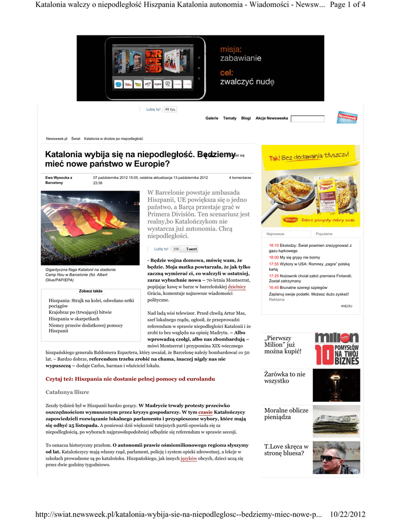 Katalonia walczy o niepodległość Hiszpania Katalonia autonomia - Wiadomości - Newsw... Page 1 of 4 Lubię to! 49 tys. Galerie Newsweek.pl Świat Tematy Blogi Akcje Newsweeka Katalonia w drodze po niepodległość Podziel się A A A Katalonia wybija się na niepodległość. Będziemy mieć nowe państwo w Europie? Ewa Wysocka z Barcelony 07 października 2012 15:05, ostatnia aktualizacja 13 października 2012 23:36 4 komentarze W Barcelonie powstaje ambasada Hiszpanii, UE powiększa się o jedno państwo, a Barça przestaje grać w Primera División. Ten scenariusz jest realny,bo Katalończykom nie wystarcza już autonomia. Chcą niepodległości. Lubię to! Gigantyczna flaga Katalonii na stadionie Camp Nou w Barcelonie (fot. Albert Olive/PAP/EPA) Zobacz także Hiszpania: Strajk na kolei, odwołano setki pociągów Krajobraz po (trwającej) bitwie Hiszpania w skarpetkach Niemcy przeciw dodatkowej pomocy Hiszpanii 106 - Będzie wojna domowa, mówię wam, że będzie. Moja matka powtarzała, że jak tylko zaczną wymierać ci, co walczyli w ostatniej, zaraz wybuchnie nowa – 70-letnia Montserrat, popijając kawę w barze w barcelońskiej dzielnicy Gràcia, komentuje najnowsze wiadomości polityczne. Nad ladą wisi telewizor. Przed chwilą Artur Mas, szef lokalnego rządu, ogłosił, że przeprowadzi referendum w sprawie niepodległości Katalonii i że zrobi to bez względu na opinię Madrytu. – Albo wprowadzą czołgi, albo nas zbombardują – mówi Montserrat i przypomina XIX-wiecznego hiszpańskiego generała Baldomera Espartera, który uważał, że Barcelonę należy bombardować co 50 lat. – Bardzo dobrze, referendum trzeba zrobić na chama, inaczej nigdy nas nie wypuszczą – dodaje Carlos, barman i właściciel lokalu. Czytaj też: Hiszpania nie dostanie pełnej pomocy od eurolandu Najnowsze Popularne 18:10 Ekolodzy: Świat powinien zrezygnować z gazu łupkowego 18:00 My się grypy nie boimy 17:55 Wybory w USA: Romney „zagra” polską kartą 17:25 Nożownik chciał zabić premiera Finlandii. Został zatrzymany 16:40 Brunatne szeregi szpiegów Zaplanuj swoje podatki. Możesz dużo zyskać! Reklama WIĘCEJ „Pierwszy Milion” już można kupić! Żarówka to nie wszystko Catalunya lliure Zeszły tydzień był w Hiszpanii bardzo gorący. W Madrycie trwały protesty przeciwko oszczędnościom wymuszonym przez kryzys gospodarczy. W tym czasie Katalończycy zapowiedzieli rozwiązanie lokalnego parlamentu i przyspieszone wybory, które mają się odbyć 25 listopada. A ponieważ dziś większość tutejszych partii opowiada się za niepodległością, po wyborach najprawdopodobniej odbędzie się referendum w sprawie secesji. To oznacza historyczny przełom. O autonomii prawie ośmiomilionowego regionu słyszymy od lat. Katalończycy mają własny rząd, parlament, policję i system opieki zdrowotnej, a lekcje w szkołach prowadzone są po katalońsku. Hiszpańskiego, jak innych języków obcych, dzieci uczą się przez dwie godziny tygodniowo. Moralne oblicze pieniądza T.Love skręca w stronę bluesa? http://swiat.newsweek.pl/katalonia-wybija-sie-na-niepodleglosc--bedziemy-miec-nowe-p... 10/22/2012 Katalonia walczy o niepodległość Hiszpania Katalonia autonomia - Wiadomości - Newsw... Page 2 of 4 – Autonomia tak, niepodległość nie – mówili przez dziesięciolecia przywódcy katalońskich partii. Teraz są nastawieni bardziej bojowo. – Czas podążyć śladem Słowacji, republik bałtyckich czy Kosowa. Kiedy się uwolnimy od reszty Hiszpanii, będziemy w czwórce najbogatszych krajów Europy – mówi Alfons López Tena, lider partii Solidarność. Popularne hasło „Catalunya lliure”, czyli wolna Katalonia, wreszcie ma szansę stać się faktem. Twórca potęgi Biedronki odchodzi na emeryturę Kłótnia o pieniądze Newsweek: nieznana Historia Kryzysu Kubańskiego „Hiszpania tylko na wakacje”, „Wysłuchaj nas, Hiszpanio”, „I want to be free”. 11 września takie hasła skandował na ulicach Barcelony ponadmilionowy tłum świętujący tzw. Diadę, czyli Dzień Katalonii. Ludzie domagali się niepodległości prowincji. Na drzwiach mijanej przez manifestantów kamienicy ktoś zawiesił wielki napis „Ambasada Hiszpanii”. Wszędzie powiewały senyeras esteladas, czyli flagi niepodległej Katalonii z charakterystycznym niebieskim trójkątem i białą gwiazdą. 1 2 3 4 61.3K followers Reklamy Business Click Szukasz pracowników? Rachunek kosztów Rozpocznij współpracę z Randstad! Rachunek kosztów - Podstawowe aspekty sprawozdawcze i decyzyjne Ewa Wysocka z Barcelony Tagi polityka Europa Drukuj Madryt Newsweek Hiszpania niepodległość Lubię to! autonomia 106 Katalonia Podziel się Ewa Wysocka Kibice kontratakują. Pozew zbiorowy przeciwko PZPN Najcześciej: Czytane Newsweek: nieznana Historia Kryzysu Kubańskiego "Sunday Times": Agenci Mosadu opanowali Mińsk Zobacz również Książęcy ślub w Luksemburu Barcelona: Adéu, Espanya! "NYT": Rozmowy USA z Iranem o atomie Komentarze (4) obserwator 08.10.2012 01:05 eugeniusz 08.10.2012 18:30 Nickita 07.10.2012 20:43 Zyggi 13.10.2012 23:36 El Clásico na remis, Messi i Ronaldo na remis Florentino Perez. Spec od galacticos Janosik z Marinaledy Komentuj Komentowane Niemcy: Brunatne podziemie hmm jakby rozmowa o slasku... Odpowiedz Zgłoś do moderacji Po czym wnosisz Pragnę przypomnieć że Ślązacy rdzenni mieszkańcy Grn. Śląska sami dokonali swojej polonizacji i zdecydowali o przyłączeniu Śląska do Polski gł. dlatego że byli prześladowani od czasów Bismarcka, który nienawidził katolików i Słowian, dzisiaj Grn. Śląsk jest w większości zamieszkany przez przyjezdnych z poza Śląska, co zmieniło jego charakter na bardziej kosmopolityczny i zwyczajnie polski, Ślązacy od czasów jeszcze niemieckich nie byli w stanie sami zagospodarować bogactw regionu i zapewnić wystarczającej liczby rąk do pracy, stąd pojawili się przyjezdni, dzięki którym w dużej mierze Śląsk za
