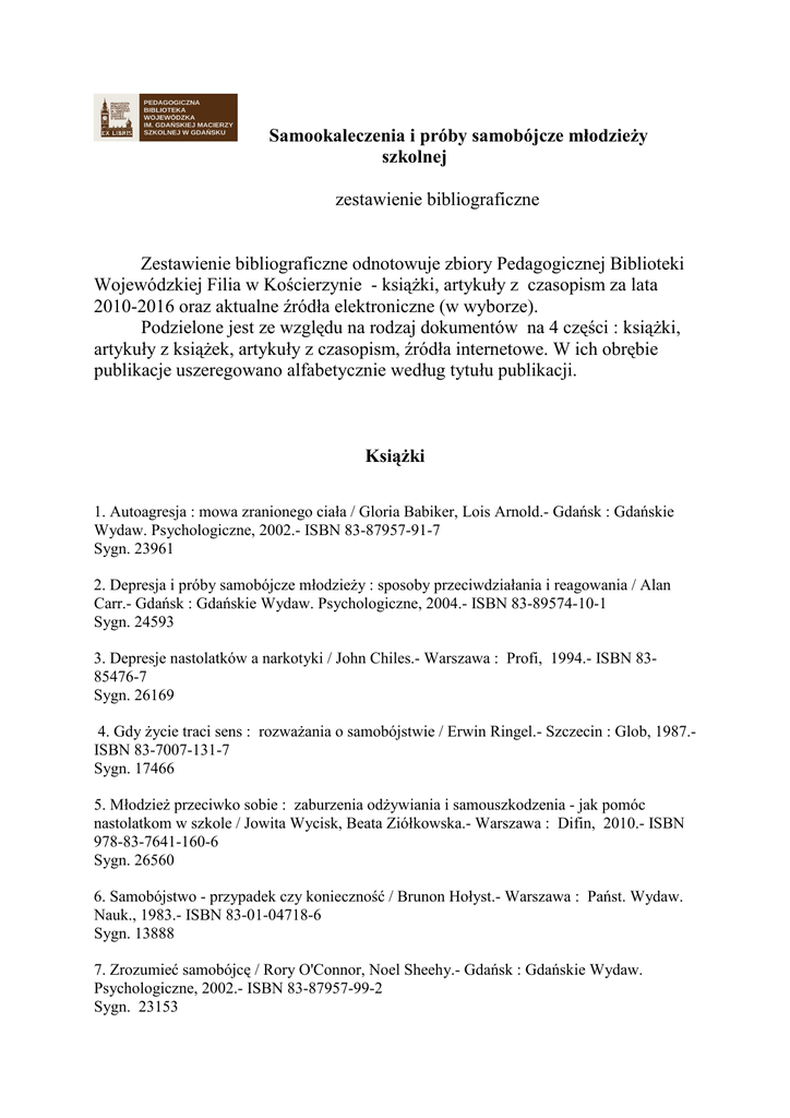 Samookaleczenia i próby samobójcze młodzieży szkolnej zestawienie bibliograficzne Zestawienie bibliograficzne odnotowuje zbiory Pedagogicznej Biblioteki Wojewódzkiej Filia w Kościerzynie - książki, artykuły z czasopism za lata 2010-2016 oraz aktualne źródła elektroniczne (w wyborze). Podzielone jest ze względu na rodzaj dokumentów na 4 części : książki, artykuły z książek, artykuły z czasopism, źródła internetowe. W ich obrębie publikacje uszeregowano alfabetycznie według tytułu publikacji. Książki 1. Autoagresja : mowa zranionego ciała / Gloria Babiker, Lois Arnold.- Gdańsk : Gdańskie Wydaw. Psychologiczne, 2002.- ISBN 83-87957-91-7 Sygn. 23961 2. Depresja i próby samobójcze młodzieży : sposoby przeciwdziałania i reagowania / Alan Carr.- Gdańsk : Gdańskie Wydaw. Psychologiczne, 2004.- ISBN 83-89574-10-1 Sygn. 24593 3. Depresje nastolatków a narkotyki / John Chiles.- Warszawa : Profi, 1994.- ISBN 8385476-7 Sygn. 26169 4. Gdy życie traci sens : rozważania o samobójstwie / Erwin Ringel.- Szczecin : Glob, 1987.ISBN 83-7007-131-7 Sygn. 17466 5. Młodzież przeciwko sobie : zaburzenia odżywiania i samouszkodzenia - jak pomóc nastolatkom w szkole / Jowita Wycisk, Beata Ziółkowska.- Warszawa : Difin, 2010.- ISBN 978-83-7641-160-6 Sygn. 26560 6. Samobójstwo - przypadek czy konieczność / Brunon Hołyst.- Warszawa : Państ. Wydaw. Nauk., 1983.- ISBN 83-01-04718-6 Sygn. 13888 7. Zrozumieć samobójcę / Rory O'Connor, Noel Sheehy.- Gdańsk : Gdańskie Wydaw. Psychologiczne, 2002.- ISBN 83-87957-99-2 Sygn. 23153 Artykuły z książek 1. Dzieci samobójcze / Andrzej Zwoliński // W : Krzywdzone dzieci : zagrożenia współczesnego dzieciństwa / Andrzej Zwoliński.- Kraków : Wydawnictwo WAM, 2012, s. 177-194 Sygn. 27785 2. Dewiacja samotnicza - samobójstwo / Irena Pospiszyl // W : Patologie społeczne / Irena Pospiszyl.- Warszawa : Wydaw. Nauk. PWN, 2008, s. 94 – 106 Sygn. 25871 3. Kryzys zagrożenia życia / Richard K. James, Burl E. Gilliland // W : Strategie interwencji kryzysowej : pomoc psychologiczna poprzedzająca terapię / Richard K. James, Burl E. Gilliland.- Warszawa : Państ. Ag. Rozwiązywania Problemów Alkoholowych, 2005, s. 175250 Sygn. 25152 4. Motywacje samobójstw w okresie dzieciństwa, dorastania i wczesnej młodości / Brunon Hołyst // W : Suicydologia / Brunon Hołyst.- Wyd. 2 zm. i rozsz.- Warszawa : LexisNexis, 2012, s. 561-590 Sygn. 26772 5. Pomoc psychologiczna po samobójczej śmierci uczniów / Brunon Hołyst // W : Suicydologia / Brunon Hołyst.- Wyd. 2 zm. i rozsz.- Warszawa : LexisNexis, 2012, s. 11541158 Sygn. 26772 6. Postępowanie zapobiegawczo-lecznicze wobec dzieci i młodzieży przejawiających tendencje samobójcze lub podejmujących próby samobójcze / Brunon Hołyst // W : Suicydologia / Brunon Hołyst.- Wyd. 2 zm. i rozsz.- Warszawa : LexisNexis, 2012, s. 11261136 7. Próby samobójcze dzieci i młodzieży / Maria Jarosz // W : Samobójstwa / Maria Jarosz.Warszawa : Wydawnictwo Naukowe PWN, 1997, s. 102-116 Sygn. 21288 8. Przemoc i autoagresja / Hanna Rylke// W : Pokolenie zmian : czego boją się dorośli? / Hanna Rylke.- Warszawa : Wydawnictwo Szkolne i Pedagogiczne, 1999s. 39-74 Sygn. 22640 9. Programy zapobiegania samobójstwom stosowane w amerykańskich szkołach / Brunon Hołyst.- Wyd. 2 zm. i rozsz.- Warszawa : LexisNexis, 2012, s. 1332-1338 Sygn. 26772 10. Rola rodziny w genezie samobójstw /Brunon Hołyst // W: Suicydologia / Brunon Hołyst.Wyd. 2 zm. i rozsz.- Warszawa : LexisNexis, 2012, s. 654-664 11. Samobójstwa / Alina Krzeszowska // W : Teoretyczno-metodyczne aspekty korekcji zachowań : programy profilaktyczne / Artur Doliński, Grażyna Gajewska, Elżbieta Rewińska. Zielona Góra : "Gaja", 2004, s. 150-172 Sygn. 24756/7 12. Samobójstwo / Robert C. Carson, James N. Butcher, Susan Mineka // W: Psychologia zaburzeń: [człowiek we współczesnym świecie]. Vol. 1.- Gdańsk : Gdańskie Wydawnictwo Psychologiczne, 2005, s. 385-402 Sygn. 25076/1 Czytelnia 13. Samobójstwo – świadomy wybór czy konieczność powodowana utratą innych możliwości istnienia / Ewa Wysocka // W : Wybrane zjawiska powodujące zagrożenia społeczne : (rozpoznawanie i przeciwdziałanie) : praca zbiorowa / pod red. Anny Nowak.- Kraków : "Impuls", 2000, s. 101-112 Sygn. 22390 14. Samobójstwo i umyślne samookaleczenie / red. nauk. Colin Feltham, Ian Horton // W : Psychoterapia i poradnictwo : podręcznik akademicki / red. nauk. Colin Feltham, Ian Horton. T. 2.- Sopot : Gdańskie Wydawnictwo Psychologiczne, 2013, s. 251-258 Sygn. 27006 Artykuły z czasopism 1. Anoreksja, anime, iluminaci - czyli zabawy naszych dzieci w internetowej sieci / Eliza Bilicka // Dziennik Bałtycki. - 2015, nr 130, s. 14-15.- ISSN 2353-6160 2. Autoagresja – poznawcza teoria Ja Roya Baumeistera / Karolina Morawska // Remedium, 2012, nr 5, s. 10-11.- ISSN 1230-7769 3. Działania i sposoby wsparcia otoczenia po śmierci samobójczej ucznia / Małgorzata Łuba // Świat Problemów.- 2016, nr 3, s. 43 – [47].- ISSN 1230-6592 4. Im brzydziej, tym ładniej / Agnieszka Boisse // Wychowawca. - 2016, nr 6, s. 10-11.- ISSN 1230-3720 5. Gdy ciało krzyczy ranami…zamierzone samookaleczenia / Magdalena Pałasz // Katecheta.2015, nr 7/8, s.100-107.- ISSN 0209-1291 6. Gdy życie traci sens / Maria Dubiel // Wychowawca.- 2014, nr 2, s. 23-25.- ISSN 12303720 7. Interwencja kryzysowa wobec młodzieży o skłonnościach samobójczych / Aneta Sylwia Baranowska // Problemy Opiekuńczo – Wychowawcze.-2015, nr 5, s. 24-29.- ISSN 0552-2188 8. Krzyk rozpaczy / Łukasz Chrzanowski // Wychowawca.- 2014, nr 2, s. 22.- ISSN 12303720 9. Niekiedy nikt nie puka do drzwi / Jacek Kurzypa // Wychowawca.- 2015, nr 1, s. 18-21.ISSN 1230-3720 10. Obalając mity na temat samobójstw / Aleksandra Tłuściał Deliowska // Remedium.2012,nr2, s. 12.- ISDN 1230-7769 11. Pod ścianą / Kinga Rusin // Głos Pedagogiczny.- 2014, nr 57, s. 51-53.- ISSN 1899-6760 12. Postawm