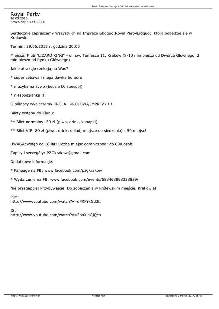Polski Związek Głuchych Oddział Małopolski w Krakowie Royal Party 20.05.2013. Zmieniony 13.11.2013. Serdecznie zapraszamy Wszystkich na Imprezę „Royal Party”, która odbędzie się w Krakowie. Termin: 29.06.2013 r. godzina 20:00 Miejsce: Klub "LIZARD KING" - ul. św. Tomasza 11, Kraków (8-10 min pieszo od Dworca Głównego, 2 min pieszo od Rynku Głównego) Jakie atrakcje czekają na Was? * super zabawa i mega dawka humoru * muzyka na żywo (będzie DJ i zespół) * niespodzianka !!! O północy wybierzemy KRÓLA i KRÓLOWĄ IMPREZY !!! Bilety wstępu do Klubu: ** Bilet normalny: 50 zł (piwo, drink, kanapki) ** Bilet VIP: 80 zł (piwo, drink, obiad, miejsce do siedzenia) - 50 miejsc! UWAGA:Wstęp od 18 lat! Liczba miejsc ograniczona: do 800 osób! Zapisy i szczegóły: [email protected] Dodatkowe informacje: * Fanpage na FB: www.facebook.com/pzgkrakow * Wydarzenie na FB: www.facebook.com/events/583463898338839/ Nie przegapcie! Przybywajcie! Do zobaczenia w królewskim mieście, Krakowie! PJM: http://www.youtube.com/watch?v=dPRFYxGd3iI IS: http://www.youtube.com/watch?v=2poXioGjQco http://www.pzg.krakow.pl Kreator PDF Utworzono 3 March, 2017, 15:54