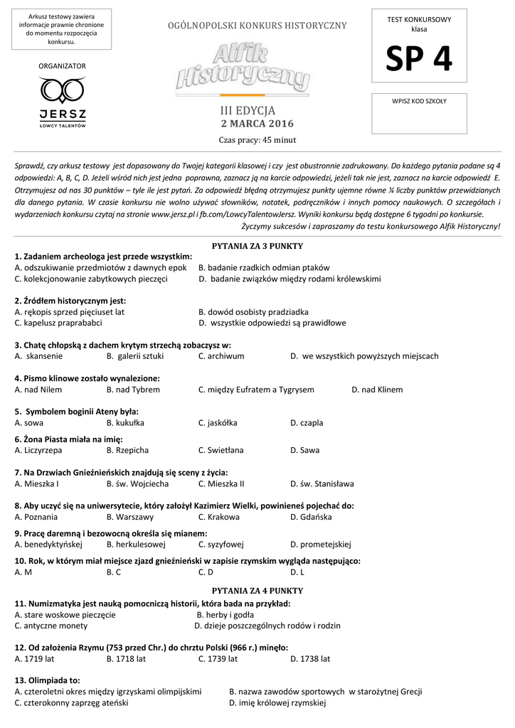 Arkusz testowy zawiera informacje prawnie chronione do momentu rozpoczęcia konkursu. TEST KONKURSOWY klasa OGÓLNOPOLSKI KONKURS HISTORYCZNY SP 4 ORGANIZATOR WPISZ KOD SZKOŁY III EDYCJA 2 MARCA 2016 Czas pracy: 45 minut Sprawdź, czy arkusz testowy jest dopasowany do Twojej kategorii klasowej i czy jest obustronnie zadrukowany. Do każdego pytania podane są 4 odpowiedzi: A, B, C, D. Jeżeli wśród nich jest jedna poprawna, zaznacz ją na karcie odpowiedzi, jeżeli tak nie jest, zaznacz na karcie odpowiedź E. Otrzymujesz od nas 30 punktów – tyle ile jest pytań. Za odpowiedź błędną otrzymujesz punkty ujemne równe ¼ liczby punktów przewidzianych dla danego pytania. W czasie konkursu nie wolno używać słowników, notatek, podręczników i innych pomocy naukowych. O szczegółach i wydarzeniach konkursu czytaj na stronie www.jersz.pl i fb.com/LowcyTalentowJersz. Wyniki konkursu będą dostępne 6 tygodni po konkursie. Życzymy sukcesów i zapraszamy do testu konkursowego Alfik Historyczny! PYTANIA ZA 3 PUNKTY 1. Zadaniem archeologa jest przede wszystkim: A. odszukiwanie przedmiotów z dawnych epok B. badanie rzadkich odmian ptaków C. kolekcjonowanie zabytkowych pieczęci D. badanie związków między rodami królewskimi 2. Źródłem historycznym jest: A. rękopis sprzed pięciuset lat C. kapelusz praprababci B. dowód osobisty pradziadka D. wszystkie odpowiedzi są prawidłowe 3. Chatę chłopską z dachem krytym strzechą zobaczysz w: A. skansenie B. galerii sztuki C. archiwum D. we wszystkich powyższych miejscach 4. Pismo klinowe zostało wynalezione: A. nad Nilem B. nad Tybrem C. między Eufratem a Tygrysem 5. Symbolem boginii Ateny była: A. sowa B. kukułka C. jaskółka D. czapla 6. Żona Piasta miała na imię: A. Liczyrzepa B. Rzepicha C. Swietłana D. Sawa 7. Na Drzwiach Gnieźnieńskich znajdują się sceny z życia: A. Mieszka I B. św. Wojciecha C. Mieszka II D. nad Klinem D. św. Stanisława 8. Aby uczyć się na uniwersytecie, który założył Kazimierz Wielki, powinieneś pojechać do: A. Poznania B. Warszawy C. Krakowa D. Gdańska 9. Pracę daremną i bezowocną określa się mianem: A. benedyktyńskej B. herkulesowej C. syzyfowej D. prometejskiej 10. Rok, w którym miał miejsce zjazd gnieźnieński w zapisie rzymskim wygląda następująco: A. M B. C C. D D. L PYTANIA ZA 4 PUNKTY 11. Numizmatyka jest nauką pomocniczą historii, która bada na przykład: A. stare woskowe pieczęcie B. herby i godła C. antyczne monety D. dzieje poszczególnych rodów i rodzin 12. Od założenia Rzymu (753 przed Chr.) do chrztu Polski (966 r.) minęło: A. 1719 lat B. 1718 lat C. 1739 lat D. 1738 lat 13. Olimpiada to: A. czteroletni okres między igrzyskami olimpijskimi C. czterokonny zaprzęg ateński B. nazwa zawodów sportowych w starożytnej Grecji D. imię królowej rzymskiej 14. Na agorze zbierali się: A. Ateńczycy B. Rzymianie C. Egipcjanie D. barbarzyńcy 15. Gladiatorzy walczyli między innymi w: A. Panteonie B. Forum Romanum C. bazylikach D. senacie 16. Chrześcijaństwo powstało na terytorium państwa: A. ateńskiego B. mezopotamskiego C. egipskiego 17. W średniowieczu miniaturę mógłbyś znaleźć: A. w koszarach rycerskich C. w chłopskiej zagrodzie D. libijskiego B. w jednej z książek w klasztornej bibliotece D. w warsztacie bednarza 18. Akwedukt wynaleziony został: A. nad Morzem Śródziemnym B. w północnej Europie C. w kraju faraonów D. przed powstaniem pisma 19. Za autora „Odysei” uznaje się: A. Sokratesa B. Williama Szekspira C. Galla Anonima D. Juliusza Cezara 20. Cechy średniowieczne zrzeszały: A. rzemieślników B. duchownych C. chłopów D. podróżników PYTANIA ZA 5 PUNKTÓW 21. Na pomysł zbudowania konia trojańskiego wpadł : A. Dedal B. Ikar C. Achilles D. Odyseusz 22. Wśród dwunastu prac Heraklesa nie było: A. oczyszczenia stajni Augiasza B. zabicia hydry lernejskiej C. porwania Cerbera D. uwolnienia Prometeusza 23. Słowianie oddawali cześć między innymi: A. Światowidowi B. Hestii C. Odynowi D. Jowiszowi 24. Wskaż poprawną kolejność wydarzeń historycznych: A. zjazd gnieźnieński – chrzest Polski – koronacja Bolesława Chrobrego B. chrzest Polski – koronacja Bolesława Chrobrego – zjazd gnieźnieński C. zjazd gnieźnieński – koronacja Bolesława Chrobrego – chrzest Polski D. koronacja Bolesława Chrobrego – chrzest Polski – zjazd gnieźnieński 25. Uczta, na którą Kazimierz Wielki zaprosił m.in. cesarza, króla Węgier oraz króla Cypru, odbyła się: A. w XIV w. B. w XV w. C. w XIII w. D. w XVI w. 26. Spośród poniższych zakonów średniowiecznych do dzisiaj działa: A. zakon krzyżacki B. zakon franciszkanów C. zakon dominikanów D. wszystkie powyższe 27. W budowli romańskiej na próżno będziesz szukać: A. wysokich, smukłych okien B. grubych, kamiennych murów C. wąskich, niewielkich drzwi D. małych okien o łagodnych łukach 28. W bitwie pod Cedynią Mieszko I pokonał: A. cesarza Ottona III B. Mieszka II C. margrabiego Hodona D. mistrza krzyżackiego Ulricha 29. Według mitologii greckiej sztuką i nauką opiekowały się muzy, których było: A. osiem B. siedem C. sześć D. dziewięć 30. Spośród poniższych starożytnych cywilizacji religię monoteistyczną wyznawali: A. Rzymianie B. Grecy C. Żydzi D. żaden z wymienionych ludów