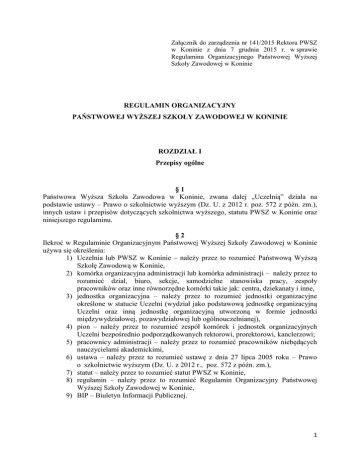Załącznik do zarządzenia nr 141/2015 Rektora PWSZ w Koninie z dnia 7 grudnia 2015 r. w sprawie Regulaminu Organizacyjnego Państwowej Wyższej Szkoły Zawodowej w Koninie REGULAMIN ORGANIZACYJNY PAŃSTWOWEJ WYŻSZEJ SZKOŁY ZAWODOWEJ W KONINIE ROZDZIAŁ I Przepisy ogólne §1 Państwowa Wyższa Szkoła Zawodowa w Koninie, zwana dalej „Uczelnią” działa na podstawie ustawy – Prawo o szkolnictwie wyższym (Dz. U. z 2012 r. poz. 572 z późn. zm.), innych ustaw i przepisów dotyczących szkolnictwa wyższego, statutu PWSZ w Koninie oraz niniejszego regulaminu. §2 Ilekroć w Regulaminie Organizacyjnym Państwowej Wyższej Szkoły Zawodowej w Koninie używa się określenia: 1) Uczelnia lub PWSZ w Koninie – należy przez to rozumieć Państwową Wyższą Szkołę Zawodową w Koninie, 2) komórka organizacyjna administracji lub komórka administracji – należy przez to rozumieć dział, biuro, sekcje, samodzielne stanowiska pracy, zespoły pracowników oraz inne równorzędne komórki takie jak: centra, dziekanaty i inne, 3) jednostka organizacyjna – należy przez to rozumieć jednostki organizacyjne określone w statucie Uczelni (wydział jako podstawową jednostkę organizacyjną Uczelni oraz inną jednostkę organizacyjną utworzoną w formie jednostki międzywydziałowej, pozawydziałowej lub ogólnouczelnianej), 4) pion – należy przez to rozumieć zespół komórek i jednostek organizacyjnych Uczelni bezpośrednio podporządkowanych rektorowi, prorektorowi, kanclerzowi; 5) pracownicy administracji – należy przez to rozumieć pracowników niebędących nauczycielami akademickimi, 6) ustawa – należy przez to rozumieć ustawę z dnia 27 lipca 2005 roku – Prawo o szkolnictwie wyższym (Dz. U. z 2012 r., poz. 572 z późn. zm.), 7) statut – należy przez to rozumieć statut PWSZ w Koninie, 8) regulamin – należy przez to rozumieć Regulamin Organizacyjny Państwowej Wyższej Szkoły Zawodowej w Koninie, 9) BIP – Biuletyn Informacji Publicznej. 1 §3 Regulamin określa: 1) zasady działania administracji i organizacji pracy w Uczelni, 2) strukturę organizacyjną administracji Uczelni, 3) zakres uprawnień i obowiązków kanclerza, 4) ramowe zakresy działania komórek administracji i jednostek organizacyjnych Uczelni. ROZDZIAŁ II Zasady działania administracji i organizacji pracy w Uczelni §4 Administracja zapewnia realizację ustawowych i statutowych zadań Uczelni, a w szczególności jej zadaniem jest wykonywanie obowiązków administracyjnych, finansowych, gospodarczych, technicznych i usługowych związanych z funkcjonowaniem i realizacją podstawowych zadań Uczelni. §5 1. Rektor jest pracodawcą dla wszystkich pracowników Uczelni w rozumieniu Kodeksu pracy. 2. W zarządzaniu Uczelnią obowiązują zasady: 1) podległości funkcjonalnej, co oznacza bezpośrednią podległość pracownika kierownikowi komórki, jednostki organizacyjnej Uczelni; 2) podległości organizacyjnej, co oznacza podległość pracowników administracji Uczelni Kanclerzowi, z wyjątkiem pracowników bezpośrednio podległych rektorowi. 3. Kanclerz kieruje administracją i gospodarką Uczelni w zakresie pełnomocnictwa udzielonego przez rektora. §6 1. Komórki organizacyjne administracji tworzy, przekształca i likwiduje rektor z własnej inicjatywy lub na wniosek kanclerza. 2. Poszczególne komórki administracji realizują zadania określone w swych zakresach działania. 3. W przypadku likwidacji komórki administracji Uczelni zlikwidowane są wszystkie stanowiska pracy wchodzące w jej skład. Decyzje dotyczące stosunku pracy pracowników likwidowanej komórki podejmuje rektor. §7 1. Podstawową jednostką organizacyjną Uczelni jest wydział. Zasady tworzenia i funkcjonowania jednostek organizacyjnych określa ustawa i statut. 2. Podstawową komórką organizacyjną administracji, liczącą co najmniej 5 osób jest dział. Dział tworzy się dla wyodrębnienia istotnych zagadnień dotyczących działalności Uczelni i realizowania zadań w sposób kompleksowy. 3. Biuro jest komórką organizacyjną administracji, liczącą co najmniej 3 osoby. Biuro tworzy się dla realizacji jednolitych zadań merytorycznych. 4. W ramach działu lub biura mogą być tworzone sekcje, samodzielne stanowiska pracy, zespoły pracowników, centra oraz inne komórki o nazwach odzwierciedlających zakres ich działania. 2 5. Komórki, o których mowa w ust. 4 tworzy się dla realizacji wyodrębnionych zadań wynikających z funkcji przypisanych dla działu lub biura. 6. W przypadkach uzasadnionych potrzebami pracodawcy komórki organizacyjne wymienione w ust. 2 i 3 mogą zostać utworzone mimo niespełniania określonych wymogów ilościowych. 7. Dziekanat jest komórką organizacyjną utworzoną dla realizacji zadań administracyjnych i spraw studenckich w podstawowej jednostce organizacyjnej Uczelni. §8 1. Pracownicy wszystkich komórek administracji i jednostek organizacyjnych są zobowiązani do ścisłej współpracy w celu prawidłowego funkcjonowania Uczelni. 2.Szczegółowy zakres obowiązków i uprawnień pracowników zatrudnionych na poszczególnych stanowiskach pracy określają indywidualne zakresy obowiązków i uprawnień ustalone przez bezpośrednich przełożonych pracowników, a zatwierdzone przez rektora lub osobę przez niego upoważnioną. 3. Za właściwe wykonanie czynności przewidzianych dla poszczególnych stanowisk pracy odpowiedzialność ponoszą pracownicy zatrudnieni na tych stanowiskach. 4. Każdego pracownika, bez względu na zajmowane stanowisko, rodzaj pracy i charakter stosunku pracy obowiązuje znajomość i przestrzeganie przepisów zawartych w wewnętrznych i zewnętrznych aktach normatywnych. 5. Kanclerz oraz kierownicy komórek administracji ustalają sposób zastępstwa pracowników nieobecnych w przypadkach delegacji, urlopu lub choroby pracowników. §9 Rektor lub kanclerz w celu realizacji określonych zadań lub ich koordynacji mogą powoływać: 