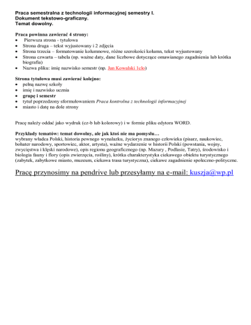 Praca semestralna z technologii informacyjnej semestry I. Dokument tekstowo-graficzny. Temat dowolny. Praca powinna zawierać 4 strony: Pierwsza strona - tytułowa Strona druga – tekst wyjustowany i 2 zdjęcia Strona trzecia – formatowanie kolumnowe, różne szerokości kolumn, tekst wyjustowany Strona czwarta – tabela (np. ważne daty, dane liczbowe dotyczące omawianego zagadnienia lub krótka biografia) Nazwa pliku: imię nazwisko semestr (np. Jan Kowalski 1clo) Strona tytułowa musi zawierać kolejno: pełną nazwę szkoły imię i nazwisko ucznia grupę i semestr tytuł poprzedzony sformułowaniem Praca kontrolna z technologii informacyjnej miasto i datę na dole strony Pracę należy oddać jako wydruk (cz-b lub kolorowy) i w formie pliku edytora WORD. Przykłady tematów: temat dowolny, ale jak ktoś nie ma pomysłu… wybrany władca Polski, historia pewnego wynalazku, życiorys znanego człowieka (pisarz, naukowiec, bohater narodowy, sportowiec, aktor, artysta), ważne wydarzenie w historii Polski (powstania, wojny, zwycięstwa i klęski narodowe), opis regionu geograficznego (np. Mazury , Podlasie, Tatry), środowisko i biologia fauny i flory (opis zwierzęcia, rośliny), krótka charakterystyka ciekawego obiektu turystycznego (zabytek, zabytkowe miasto, muzeum, ciekawa trasa turystyczna), ciekawe zagadnienie społeczno-polityczne. Pracę przynosimy na pendrive lub przesyłamy na e-mail: [email protected]