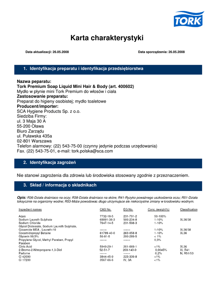 Karta charakterystyki Data aktualizacji: 26.05.2008 Data sporządzenia: 26.05.2008 1. Identyfikacja preparatu i identyfikacja przedsiębiorstwa Nazwa peparatu: Tork Premium Soap Liquid Mini Hair & Body (art. 400602) Mydło w płynie mini Tork Premium do włosów i ciała Zastosowanie preparatu: Preparat do higieny osobistej; mydło toaletowe Producent/importer: SCA Hygiene Products Sp. z o.o. Siedziba Firmy: ul. 3 Maja 30 A 55-200 Oława Biuro Zarządu ul. Puławska 435a 02-801 Warszawa Telefon alarmowy: (22) 543-75-00 (czynny jedynie podczas urzędowania) Fax. (22) 543-75-01, e-mail: [email protected] 2. Identyfikacja zagrożeń Nie stanowi zagrożenia dla zdrowia lub środowiska stosowany zgodnie z przeznaczeniem. 3. Skład / informacja o składnikach Opis: R36-Działa drażniaco na oczy; R38-Działa drażniaco na skóre; R41-Ryzyko poważnego uszkodzenia oczu; R51-Działa toksycznie na organizmy wodne; R53-Może powodowac długo utrzymujace sie niekorzystne zmiany w środowisku wodnym. Tork Premium Soap Liquid Mini Hair & Body (art. 400602) 4. Pierwsza pomoc Kontakt z oczami: Płukać pod bieżącą wodą. W przypadku nieustępujących dolegliwości zwrócić się o pomoc lekarską. Połknięcie: Pić dużo wody. W przypadku nieustępujących dolegliwości zwrócić się o pomoc lekarską. 5. Postępowanie w przypadku pożaru Zalecane środki gaśnicze: Proszek gaśniczy lub woda. 6. Postępowanie w przypadku niezamierzonego uwolnienia do środowiska Środki ostrożności dotyczące ochrony środowiska: Zapobiec przenikaniu do ścieków, wód powierzchniowych i wód gruntowych. Metody oczyszczania: Zanieczyszczone powierzchnie spłukać wodą. Duże ilości usunąć zgodnie z lokalnymi przepisami dotyczącymi utylizacji. 7. Postępowananie z preparatem i magazynowanie Magazynowanie: Przechowywać w temperaturze od 0 do 40 ºC. 8. Kontrola narażenia i środki ochrony indywidualnej Nie dotyczy. 9.. Właściwości fizyczne i chemiczne Informacje ogólne: Postać: Ciecz Kolor: Błękitny Zapach: Przyjemny Rozpuszczalność w wodzie: Bez ograniczeń Właściwości fizyczne i chemiczne: Odczyn pH: ~ 5,5 Gęstość: ~ 1,04 g/cm3 Lepkość: ~ 2500 cP Tork Premium Soap Liquid Mini Hair & Body (art. 400602) 10. Stabilność i reaktywność Stabilność: Przechowywać trzy lata w normalnych warunkach. 11. Informacje toksykologiczne Nie odnotowano przypadków zatrucia / ubytku zdrowia w normalnym stosowaniu. 12. Informacje ekologiczne Nie odnotowano przypadków naruszenia / uszkodzenia środowiska. 13. Postępowanie z odpadami Zalecenia: Utylizacja odpadów musi odbywać się zgodnie z lokalnymi regulacjami lub poprzez licencjonowane przedsiębiorstwo utylizacyjne. 14. Informacje o transporcie Produkt nie został zakwalifikowany jako niebezpieczny. 15. Informacje dotyczące przepisów prawnych Oznaczenie EC: Nie posiada. Produkt podlega regulacjom dyrektywy Rady 76/768/EEC dotyczącej produktów kosmetycznych. 16. Inne informacje Dodatkowe informacje o preparacie można uzyskać pod adresem: SCA Hygiene Products Sp. z o.o. ul. Puławska 435a 02-801 Warszawa Tel. (22) 543-75-00 Fax. (22) 543-75-01 Osoba kontaktowa: Julia Wareliś