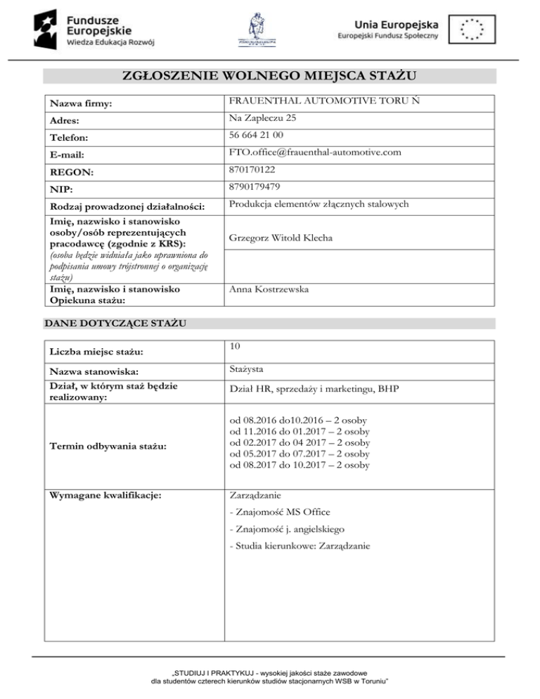 ZGŁOSZENIE WOLNEGO MIEJSCA STAŻU Nazwa firmy: FRAUENTHAL AUTOMOTIVE TORU Ń Adres: Na Zapleczu 25 Telefon: 56 664 21 00 E-mail: [email protected] REGON: 870170122 NIP: 8790179479 Rodzaj prowadzonej działalności: Imię, nazwisko i stanowisko osoby/osób reprezentujących pracodawcę (zgodnie z KRS): (osoba będzie widniała jako uprawniona do podpisania umowy trójstronnej o organizację stażu) Imię, nazwisko i stanowisko Opiekuna stażu: Produkcja elementów złącznych stalowych Grzegorz Witold Klecha Anna Kostrzewska DANE DOTYCZĄCE STAŻU 10 Liczba miejsc stażu: Nazwa stanowiska: Dział, w którym staż będzie realizowany: Stażysta Dział HR, sprzedaży i marketingu, BHP Termin odbywania stażu: od 08.2016 do10.2016 – 2 osoby od 11.2016 do 01.2017 – 2 osoby od 02.2017 do 04 2017 – 2 osoby od 05.2017 do 07.2017 – 2 osoby od 08.2017 do 10.2017 – 2 osoby Wymagane kwalifikacje: Zarządzanie - Znajomość MS Office - Znajomość j. angielskiego - Studia kierunkowe: Zarządzanie „STUDIUJ I PRAKTYKUJ - wysokiej jakości staże zawodowe dla studentów czterech kierunków studiów stacjonarnych WSB w Toruniu” Oświadczam, że: - zakład nie jest w stanie upadłości, likwidacji; - organizacja stażu dla skierowanego studenta nie będzie przyczyną zwolnień pracowników zatrudnionych w przedsiębiorstwie. SZCZEGÓŁOWY PROGRAM STAŻU Zakres obowiązków Stażysty Główne zadania w dziale HR: Zapoznanie studenta z polityką zatrudnienia prowadzoną przez organizację (np. należy przedstawić studentowi i zaangażować studenta w kwestie dotyczące: metod doboru pracowników, wymagań stawianych nowym pracownikom, możliwości awansowania w organizacji). Udział w procesie planowania i analizowania potrzeb organizacji (np. kwestie dotyczące: sposobów zbierania informacji stanowiących podstawę planowania przyszłych i bieżących działań firmy). Poznanie podstaw psychologii funkcjonowania grup pracowniczych (np. kwestie dotyczące: zasad organizowania pracy w grupie i kierowania grupami pracowniczymi, analizy wpływu warunków środowiskowych na zachowania społeczne Poznanie zagadnień psychologicznych i społecznych w miejscu pracy (np. należy przedstawić studentowi i zaangażować studenta w kwestie dotyczące: analizy cech człowieka, kompetencji i kwalifikacji jako podstawy polityki personalnej uwzględniającej mechanizmy psychologiczne w zarządzaniu i kierowaniu zespołami pracowniczymi, kryzysów i traum w miejscu pracy oraz sposobów ich rozwiązywania, wpływu jakości życia i równowagi między pracą i życiem na funkcjonowanie zawodowe pracownika). Główne zadania w dziale marketingu i sprzedaży: Zapoznanie się z organizacją działu marketingu i sprzedaży w organizacji (np. kwestie dotyczące: struktury organizacyjnej działu marketingu, obiegu dokumentacji, zadań realizowanych przez poszczególne stanowiska w dziale marketingu, procesu planowania działalności marketingowej). Udział w działaniach związanych z prowadzeniem badań marketingowych (np. kwestie dotyczące: opracowania harmonogramu i kosztorysu badań, wyboru metod i narzędzi badawczych, specyfiki realizacji badań marketingowych, przygotowania raportu z badań). Uczestnictwo w pracach nad projektowaniem działań reklamowych (np. kwestie dotyczące: czynników wpływających na formę, planowania programu marketingowego, wyboru form i narzędzi działań marketingowych, procesu tworzenia materiałów promocyjnych). Przedstawienie studentowi zagadnień z zakresu nowoczesnych koncepcji marketingu i procesów wspomagających te koncepcje (np. marketingu globalnego, marketingu elektronicznego i mobilnego, brandingu, marketingu wspomaganego mediami społecznościowymi, kreatywności w reklamie, czy też zarządzania innowacyjnymi projektami marketingowymi). Poznanie struktury organizacyjnej działu marketingu. Zapoznanie się z obiegiem dokumentacji sprzedażowej. Wykonywanie przez studenta zadań realizowanych w zakresie sprzedaży. Poznanie czynników wpływających na formę kampanii sprzedażowej. Udział studenta w pracach nad materiałami promocyjnymi. „STUDIUJ I PRAKTYKUJ - wysokiej jakości staże zawodowe dla studentów czterech kierunków studiów stacjonarnych WSB w Toruniu” Główne zadania w dziale BHP: Poznanie funkcjonowania służby bhp w organizacji (np. kwestie dotyczące: organizacja służby, zadań i kompetencji, roli służby bhp w zarządzaniu podmiotem). Poznanie najważniejszych procedur w zakresie bhp (np. kwestie dotyczące: identyfikacji zagrożeń i procesu oceny ryzyka zawodowego, sposobów dokumentowania zagrożeń i ryzyka, wypadków przy pracy i chorób zawodowych w tym dokumentacji powypadkowej, monitorowania stanu bhp, sposobów dokumentowania przeglądów i podejmowania decyzji o realizacji zaleceń wynikających z przeglądów, zasad przydziału środków ochrony indywidualnej, odzieży i obuwia roboczego, zapewnienia oznakowania miejsc niebezpiecznych oraz dróg ewakuacyjnych i miejsc środków gaśniczych, niebezpiecznych substancji i preparatów chemicznych oraz substancji i technologii o działaniu rakotwórczym i mutagennym, maszyny i urządzenia szczególnie niebezpiecznych, pomiaru szkodliwych dla zdrowia czynników środowiska pracy, sposobów dokumentowania wyników pomiarów i zapoznawania się z nimi przez pracowników, sprawozdawczości w zakresie bhp, planowania przedsięwzięć w zakresie poprawy bezpieczeństwa i warunków pracy, zasad ochrony ppoż., organizacji i przebiegu procesu konsultacyjnego w zakresie bhp, współpracy ze służbami personalnymi w zakresie prowadzenia profilaktycznych badań lekarskich oraz organizacji i realizacji szkoleń z zakresu bhp). Dokonywanie koniecznych analiz bieżących i historycznych. Udział w szkoleniach wstępnych dla pracowników przyjmowanych do pracy. Wymiar godzinowy Liczba godzin dziennie: 7 lub 8 Godziny pracy: od 8.00 lub 9.00 do 15.00 Praca przy monitorze ekranowym co najmniej