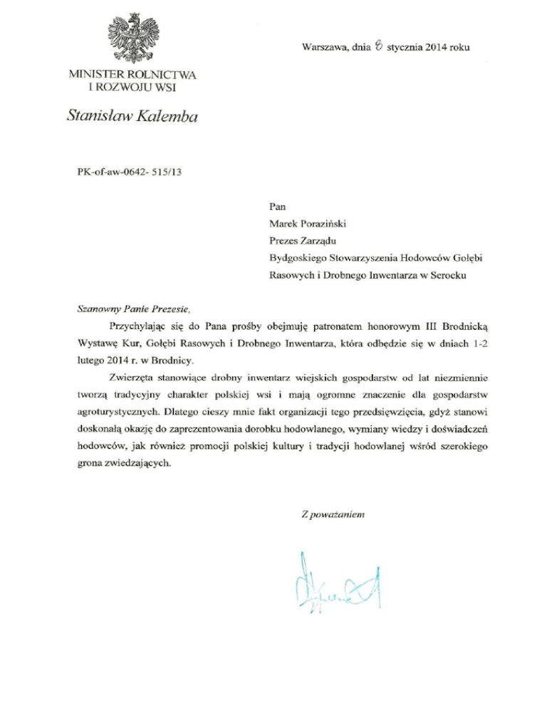 Szanowni Państwo hodowcy i miłośnicy skrzydlatych witamy na III Brodnickiej Wystawie Drobnego Inwentarza, witamy w Brodnicy. Cieszymy się bardzo, że trzecia już w naszym mieście wystawa wzbudza tak wielkie zainteresowanie. Świadczy o tym ilość wystawców oraz wystawionych do oceny ptaków. Radość wielka, że tylu z Was postanowiło ponownie nas odwiedzić i pokazać swoje ulubione i cenne okazy drobiu ozdobnego , gołębi i innych zwierząt hobbistycznych, które będą rywalizowały o miano zwycięzców i wyróżnionych. Jak zwykle zapraszamy Was do spotka ń, dyskusji i wymiany doświadczeń hodowlanych. Pragniemy by nasza Wystawa miała taki właśnie charakter. Niech te dni będą dla Was pogodne, bo przecież owszem, rywalizujemy ze sobą jako hodowcy, ale przede wszystkim jesteśmy wielką wspólną rodziną miłośników skrzydlatych i nie tylko. Wyrażamy też nadzieję, że Nasza Wystawa wpisze się na stałe w harmonogram pokazów ptasich piękności i spotkamy się w Brodnicy tak jak teraz w przyszłym roku, a potem znowu za rok, i za rok........ Serdecznie Pozdrawiam Przewodnicząca Komitetu Organizacyjnego Anna Roszewska Brodnica dn. 1-2 lutego 2014r. ORGANIZATOR WYSTAWY Bydgoskie Stowarzyszenie Hodowców Gołębi Rasowych i Drobnego Inwentarza Komitet organizacyjny: Przewodnicząca – Anna Roszewska Vice przewodniczący – Marek Poraziński Skarbnik – Ewa Trojak Sekretarz – Leszek Trojak Członkowie Komitetu Organizacyjnego: Kamil Mączkowski Mariusz Kuich Kazimierz Nisgorski Jacek Grobelniak Filip Migasiewicz Tomasz Lauter Wojciech Sikora Sławomir Górka Andrzej Kłopot Zenon Kaźmierczak Jacek Świerczyński Komisja przydziału nagród: Bogusław Miśkurka Małgorzata Górka Małgorzata Świerczyńska Nadzór Weterynaryjny: lek. wet. Krzysztof Markiewicz Opracowanie katalogu Leszek Trojak Komisja Sędziowska: Przewodniczący - Kanicki Krzysztof Członkowie komisji: Halicki Jan Jędrzejewski Jan Lilliana Beszczyńska Agnieszka Brzezińska Heinz Marquardt Hertmut Petrick Matthias Schutza Siegfried Kӧnig Thomas Müller Manfred Hartmann Asystenci: Anna Roszewska Ewa Trojak Jacek Grobelniak Kamil Mączkowski Filip Migasiewicz Tomasz Grygiel Karol Sarnecki Sędzia obserwator: Ryszard Suski Wykaz ras wystawianych zwierząt Lp. 1. 2. 3. 4. 5. 6. 7. 8. 9. 10. 11. 12. 13. 14. 15. 16. 17. 18. 19. 20. 21. 22. 23. 24. 25. 26. 27. Rasa Liczba eksponatów Ayam Cemani Bantamka Barbe de Grubbe Bojowiec araukana Bojowiec araukana miniaturowa Bojowiec asil Bojowiec indyjski Bojowiec indyjski miniaturowy Bojowiec ko shamo Bojowiec nowoangielski Bojowiec nowoangielski miniaturowy Bojowiec staroangielski Bojowiec yamato Brahma Brahma miniaturowa Brakel Brodacz antwerpski Czubatka brodnicka Czubatka polska bezbroda Czubatka polska bezbroda miniaturowa Czubatka polska brodata miniaturowa Feniks miniaturowy Forwerk Forwerk miniaturowy Galijska Hamburska Hiszpańska 11 9 2 28 5 9 2 1 6 7 14 2 2 43 5 2 13 15 1 28 6 3 3 3 2 8 6 28. 29. 30. 31. 32. 33. 34. 35. 36. 37. 38. 39. 40. 41. 42. 43. 44. 45. 46. 47. 48. 49. 50. 51. 52. 53. 54. 55. 56. 57. 58. 59. Hiszpańska miniaturowa Jedwabista Jedwabista miniaturowa Jokohama Karzełek kochin Karzełek łapciasty Karzełek polski Kochin La Fleche (Lafleszka) Lakenfelder miniaturowy Leghorn Marans Marans miniaturowy Minorka Niemiecka jastrzębiata Ohiki Onagadori Orpington Plymutrok Rodajlend (Karmazyn) Saseks Satsumadori Sebrytka Serama Shoukoku Sumatra Szabo Tęczanka Wajandota Wajandota miniaturowa Welsumska Welsumska miniaturowa 4 16 2 11 117 70 5 32 2 5 9 10 2 1 1 25 2 2 8 8 4 2 6 44 6 8 3 4 9 23 4 2 60. 61. 62. 63. 64. 65. 66. 67. 68. 69. 70. 71. 72. 73. 74. 75. 76. 77. 78. 79. 80. 81. 82. 83. 84. 85. 86. 87. 88. 89. 90. 91. Włoszka Włoszka miniaturowa Zagrodowa lokowana Zielononóżka polska Bażant diamentowy Bażant kaukaski Bażant złocisty Gęś Egipska Gęś Kapodziób Gęś Kubańska Indyk domowy Kaczka Biegus indyjski Kaczka Czubata Kaczka Gągoł Kaczka Karolinka Kaczka Krzyżówka miniaturowa Kaczka Mandarynka Kaczka Podgorzałka Kaczka Rożeniec Kaczka Staropolska Paw indyjski Perlica Przepiórka brojler Przepiórka japońska Barwnoogoniasty krakowski Białogłówka Elbląska Chiński Gołąb Czystooki Dragon Felegyhazer Garłacz Górnośląski Koroniaty Garłacz Pomorski 9 1 10 19 2 2 2 2 2 10 4 8 4 1 2 3 11 1 2 3 2 13 5 35 10 5 6 3 7 24 14 76 Garłacz Siodłaty Łapciaty 92. 93. Gdański Wysokolotny / Sokół Gdański Giant Homer 94. Gil 95. Kapucyn Staroholenderski 96. Karier 97. King 98. Koszua 99. Krymka Polska 100. Loczek 101. Mewka Orientalna - Bluet 102. Modena Niemiecka 103. Mondain 104. Montoban 105. Motyl Polski 106. Motyl Warszawski 107. Niemiecki Długodzioby Lotny 108. 6 47 20 20 10 6 73 6 16 22 4 6 18 6 10 2 109. 110. 111. 112. 113. 114. 115. 116. 117. 118. 119. 120. 121. 122. 6 6 6 6 6 8 18 8 20 20 16 4 8 6 Podbródek Niemiecki Wystawowy Olbrzym Rzymski Olbrzym Węgierski Pawik Pawik Indyjski Perukarz Polski Pocztowy Wystawowy Południowoniemiecki Mnich Łapciaty Ryś Polski Sroczka Marchijska Strasser Sztralzundzki Śląski Murzynek Turkot Arabski 12 123. 124. 125. 126. 127. 128. 129. 130. 131. 132. 133. Turkot Bucharski Turkot Niemiecki Dwuczuby Turyński z Czółkiem Wiedeński Lotny Belgijski olbrzym Francuski baran Holenderski Kalifornijski Miniaturowy Nowozelandzki biały Nowozelandzki czerwony Razem: 6 6 4 5 6 11 6 6 3 4 5 1465 Sędzia: Lilliana Beszczyńska Sędzia: Agnieszka Brzezińska Nr klatki 1 2 3 4 5 6 Nr klatki 7 8 9 10 11 12 13 14 15 16 17 Nr klatki 18 Wystawca Kolor Niedziałkowski Artur Niedziałkowski Artur Szczepański Grzegorz Szczepański Grzegorz Szczepański Grzegorz Szczepański Grzegorz biały biały biały biały biały biały Wystawca Kolor Numer obrączki Otrzymał punktów 95 94 Zwycięzca Uwagi M82 M82 Pokaz 91 95 92 Sędzia: Lilliana Beszczyńska Sędzia: Agnieszka Brzezińska Numer Otrzymał Zwyobrączki punktów cięzca Uwagi Jasielski Dariusz Jasielski Dariusz Jasiel