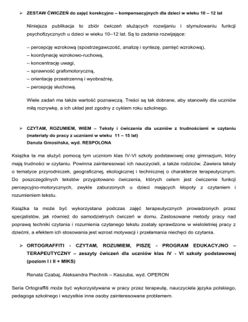 ZESTAW ĆWICZEŃ do zajęć korekcyjno – kompensacyjnych dla dzieci w wieku 10 – 12 lat Niniejsza publikacja to zbiór ćwiczeń służących rozwijaniu i stymulowaniu funkcji psychofizycznych u dzieci w wieku 10–12 lat. Są to zadania rozwijające: – percepcję wzrokową (spostrzegawczość, analizę i syntezę, pamięć wzrokową), – koordynację wzrokowo-ruchową, – koncentrację uwagi, – sprawność grafomotoryczną, – orientację przestrzenną i wyobraźnię, – percepcję słuchową. Wiele zadań ma także wartość poznawczą. Treści są tak dobrane, aby stanowiły dla uczniów miłą rozrywkę, a ich układ jest zgodny z cyklem roku szkolnego. CZYTAM, ROZUMIEM, WIEM – Teksty i ćwiczenia dla uczniów z trudnościami w czytaniu (materiały do pracy z uczniami w wieku 11 – 15 lat) Danuta Gmosińska, wyd. RESPOLONA Książka ta ma służyć pomocą tym uczniom klas IV-VI szkoły podstawowej oraz gimnazjum, który mają trudności w czytaniu. Powinna zainteresować ich nauczycieli, a także rodziców. Zawiera teksty o tematyce przyrodniczek, geograficznej, ekologicznej i technicznej o charakterze terapeutycznym. Do poszczególnych tekstów przygotowano ćwiczenia, których celem jest ćwiczenie funkcji percepcyjno-motorycznych, zwykle zaburzonych u dzieci mających kłopoty z czytaniem i rozumieniem tekstu. Książka ta może być wykorzystana podczas zajęć terapeutycznych prowadzonych przez specjalistów, jak również do samodzielnych ćwiczeń w domu. Zastosowane metody pracy nad poprawą techniki czytania i rozumienia czytanego tekstu zostały sprawdzone w wieloletniej pracy z dziećmi, a efektem ich stosowania jest wzrost motywacji i przełamania niechęci do czytania. ORTOGRAFFITI - CZYTAM, ROZUMIEM, PISZĘ - PROGRAM EDUKACYJNO – TERAPEUTYCZNY – zeszyty ćwiczeń dla uczniów klas IV - VI szkoły podstawowej (poziom I i II + MIKS) Renata Czabaj, Aleksandra Piechnik – Kaszuba, wyd. OPERON Seria Ortograffiti może być wykorzystywana w pracy przez terapeutę, nauczyciela języka polskiego, pedagoga szkolnego i wszystkie inne osoby zainteresowane problemem. Zajęcia można prowadzić indywidualnie lub grupowo. Mogą one przybierać różny charakter w zależności od tego, kto podejmuje się pracy z uczniami. Dla terapeutów cykl może stać się podstawą do organizowania własnych zajęć terapii pedagogicznej. Nauczyciele języka polskiego mogą wykorzystywać zeszyty do prowadzenia zajęć wyrównawczych lub do pracy indywidualnej. Pedagodzy szkolni, psychologowie i logopedzi mogą pracować z serią, prowadząc zajęcia grupowe lub pracując indywidualnie z uczniem. Zeszyty ćwiczeń z serii Ortograffiti przeznaczone są dla uczniów szkól podstawowych, gimnazjalistów i uczniów szkół ponadgimnazjalnych mających trudności w nauce ortografii lub specyficzne trudności w uczeniu się, objawiające się dysleksją, dysortografią i dysgrafią. Z serią mogą pracować wszyscy uczniowie, u których stwierdzono wymienione wyżej trudności, bez względu na to, czy posiadają opinię poradni psychologiczno-pedagogicznej stwierdzającą trudności o charakterze dyslektycznym, czy też nie. Rodzaj ćwiczeń zawartych w poszczególnych zeszytach umożliwia prowadzenie efektywnych zajęć zarówno z uczniami ze stwierdzoną dysleksją, jak również z tymi, którzy mają wyłącznie trudności z poprawnym pisaniem. Celem pracy z serią Ortograffiti jest: a) wszechstronny rozwój funkcji poznawczych b) utrwalenie znajomości reguł ortograficznych oraz rozwijanie umiejętności poprawnego pisania c) rozwijanie sprawności językowej. CHODZĄ SŁUCHY – czyli ćwiczenia usprawniające percepcję słuchową dla uczniów klas IV – VI szkoły podstawowej oraz uczniów gimnazjum Anna Tońska – Szyfelbein, wyd. Harmonia Prezentowany zestaw ćwiczeń usprawniających percepcję słuchową przeznaczony jest dla uczniów klas IV–VI szkoły podstawowej oraz uczniów gimnazjum. Książkę polecamy wszystkim, którzy borykają się z błędami w czytaniu i pisaniu oraz mają problemy z nauką wynikające z zaburzonych funkcji słuchowych. Ćwiczenia tu zebrane to na przykład: skojarzenia słuchowe, wyszukiwanie ukrytych słów, porównywanie wyrazów różniących się jedną głoską lub mających jedną wspólną głoskę. Każde zadanie zostało tak ułożone, by można było do niego wrócić i na innym materiale słownym powtórzyć daną umiejętność. Ćwiczenia mają zróżnicowany poziom trudności, dzięki czemu sprawdzą się w terapii młodszych i starszych uczniów. TRENUJ WZROK - Ćwiczenia dla uczniów starszych klas szkoły podstawowej, gimnazjalistów i licealistów z zaburzoną percepcją wzrokową Małasiewicz Alicja, wyd. Harmonia Publikacja składa się z ośmiu kategorii ćwiczeń (np. dobieranie w pary, znajdowanie różnic, odbijanie wzoru, śledzenie labiryntu), które zawierają po dziesięć kart praktycznego treningu wzroku dziecka. W zależności od poziomu percepcji wzroku podopiecznego terapeuta może dobrać na zajęcia karty z poszczególnych kategorii. Przygotowane ćwiczenia poprawiają, usprawniają i ćwiczą małą grafomotorykę, koordynację wzrokowo-ruchową, analizę i syntezę wzrokową, koncentrację uwagi, spostrzeganie i różnicowanie, wyróżnianie i wyodrębnianie znaków, kształtów i całych układów, pamięć wzrokową i logiczne myślenie. POLUBIĆ MATEMATYKĘ – ćwiczenia rozwijające umiejętności matematyczne uczniów w wieku 10 – 15 lat Dorota Miązek, Joanna Wójcicka, wyd. Akademii Humanistyczno – Ekonomicznej w Łodzi Ćwiczenia przeznaczone są dla dzieci z trudnościami w uczeniu się matematyki, ale jest to również doskonały materiał do stymulowania rozwoju umiejętności matematycznych. Wykonywanie ich spowoduje, iż dziecko zacznie lepiej radzić sobie z matematyką, przestanie się jej bać, a tym samym poprawi się jego funkcjonowanie, będzie szczęśliwsze. Bardzo chcemy, a