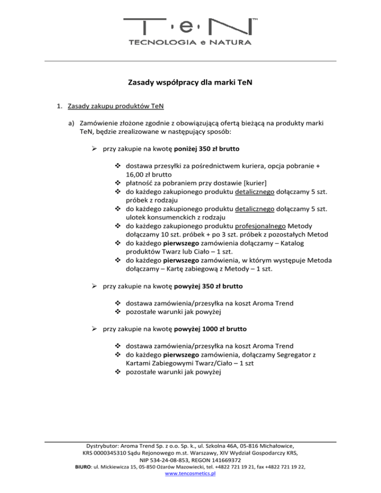 Zasady współpracy dla marki TeN 1. Zasady zakupu produktów TeN a) Zamówienie złożone zgodnie z obowiązującą ofertą bieżącą na produkty marki TeN, będzie zrealizowane w następujący sposób: przy zakupie na kwotę poniżej 350 zł brutto dostawa przesyłki za pośrednictwem kuriera, opcja pobranie + 16,00 zł brutto płatność za pobraniem przy dostawie [kurier] do każdego zakupionego produktu detalicznego dołączamy 5 szt. próbek z rodzaju do każdego zakupionego produktu detalicznego dołączamy 5 szt. ulotek konsumenckich z rodzaju do każdego zakupionego produktu profesjonalnego Metody dołączamy 10 szt. próbek + po 3 szt. próbek z pozostałych Metod do każdego pierwszego zamówienia dołączamy – Katalog produktów Twarz lub Ciało – 1 szt. do każdego pierwszego zamówienia, w którym występuje Metoda dołączamy – Kartę zabiegową z Metody – 1 szt. przy zakupie na kwotę powyżej 350 zł brutto dostawa zamówienia/przesyłka na koszt Aroma Trend pozostałe warunki jak powyżej przy zakupie na kwotę powyżej 1000 zł brutto dostawa zamówienia/przesyłka na koszt Aroma Trend do każdego pierwszego zamówienia, dołączamy Segregator z Kartami Zabiegowymi Twarz/Ciało – 1 szt pozostałe warunki jak powyżej Dystrybutor: Aroma Trend Sp. z o.o. Sp. k., ul. Szkolna 46A, 05-816 Michałowice, KRS 0000345310 Sądu Rejonowego m.st. Warszawy, XIV Wydział Gospodarczy KRS, NIP 534-24-08-853, REGON 141669372 BIURO: ul. Mickiewicza 15, 05-850 Ożarów Mazowiecki, tel. +4822 721 19 21, fax +4822 721 19 22, www.tencosmetics.pl 2. Mechanizm poleceń dla marki TeN Poniżej przedstawiamy ofertę dla gabinetów kosmetycznych aktualnie posiadających w swojej ofercie produkty marki TeN. a. Gabinet kosmetyczny [Polecający], aktualnie pracujący na produktach marki TeN, polecając do współpracy nowy gabinet kosmetyczny, który chce rozpocząć pracę na produktach marki TeN, w przypadku otrzymanego zamówienia od [Polecanego] otrzymuje: jednorazowy rabat gotówkowy od złożonego przez siebie zamówienia w wysokości 10%. b. Gabinet kosmetyczny [Polecony] do współpracy na produktach marki TeN, otrzymuje: jednorazowy rabat gotówkowy w wysokości 10% na zakup produktów marki TeN Uwaga: • Otrzymany rabat nie sumuje się z innymi otrzymanymi rabatami. • Warunkiem otrzymania rabatu przez gabinet kosmetyczny [Polecający] jest pisemne potwierdzenie danych nowego gabinetu kosmetycznego [Poleconego]. Dystrybutor: Aroma Trend Sp. z o.o. Sp. k., ul. Szkolna 46A, 05-816 Michałowice, KRS 0000345310 Sądu Rejonowego m.st. Warszawy, XIV Wydział Gospodarczy KRS, NIP 534-24-08-853, REGON 141669372 BIURO: ul. Mickiewicza 15, 05-850 Ożarów Mazowiecki, tel. +4822 721 19 21, fax +4822 721 19 22, www.tencosmetics.pl 3. Warunki handlowe dla gabinetu kosmetycznego a) Wszystkim gabinetom kosmetycznym, które uczestniczyły w zorganizowanych przez Aroma Trend aktywnościach wymienionych poniżej przysługuje na pierwszy zakup produktów TeN, rabat gotówkowy w wysokości 10%. Szkolenie organizowane w Accademii TeN w Warszawie Szkolenia regionalne Wizyta na stoisku targowym TeN Cosmetics b) Przyznany na powyższych zasadach rabat gotówkowy [10%] nie sumuje się z innymi zakupami z okresowych ofert promocyjnych. c) Przyznany rabat na podstawie ustalonego mechanizmu Poleceń [10%] nie sumuje się z innymi zakupami z okresowych ofert promocyjnych. d) Przyznany rabat na podstawie ustalonego mechanizmu Poleceń [10%] nie sumuje się z przyznanym rabatem gotówkowym związanym z pierwszym zakupem Dystrybutor: Aroma Trend Sp. z o.o. Sp. k., ul. Szkolna 46A, 05-816 Michałowice, KRS 0000345310 Sądu Rejonowego m.st. Warszawy, XIV Wydział Gospodarczy KRS, NIP 534-24-08-853, REGON 141669372 BIURO: ul. Mickiewicza 15, 05-850 Ożarów Mazowiecki, tel. +4822 721 19 21, fax +4822 721 19 22, www.tencosmetics.pl