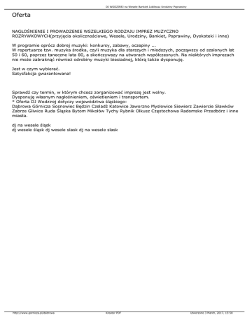 DJ WODZIREJ na Wesele Bankiet Jubileusz Urodziny Poprawiny Oferta NAGŁOŚNIENIE I PROWADZENIE WSZELKIEGO RODZAJU IMPREZ MUZYCZNO ROZRYWKOWYCH(przyjęcia okolicznościowe, Wesele, Urodziny, Bankiet, Poprawiny, Dyskoteki i inne) W programie oprócz dobrej muzyki: konkursy, zabawy, oczepiny ... W repertuarze tzw. muzyka środka, czyli muzyka dla starszych i młodszych, począwszy od szalonych lat 50 i 60, poprzez taneczne lata 80, a skończywszy na utworach współczesnych. Na niektórych imprezach nie może zabraknąć również odrobiny muzyki biesiadnej, którą także dysponuję. Jest w czym wybierać. Satysfakcja gwarantowana! Sprawdź czy termin, w którym chcesz zorganizować imprezę jest wolny. Dysponuję własnym nagłośnieniem, oświetleniem i transportem. * Oferta DJ Wodzirej dotyczy województwa śląskiego: Dąbrowa Górnicza Sosnowiec Będzin Czeladź Katowice Jaworzno Mysłowice Siewierz Zawiercie Sławków Zabrze Gliwice Ruda Śląska Bytom Mikołów Tychy Rybnik Olkusz Częstochowa Radomsko Przedbórz i inne miasta. dj na wesele śląsk dj wesele śląsk dj wesele slask dj na wesele slask http://www.gornicza.pl/dabrowa Kreator PDF Utworzono 3 March, 2017, 15:58