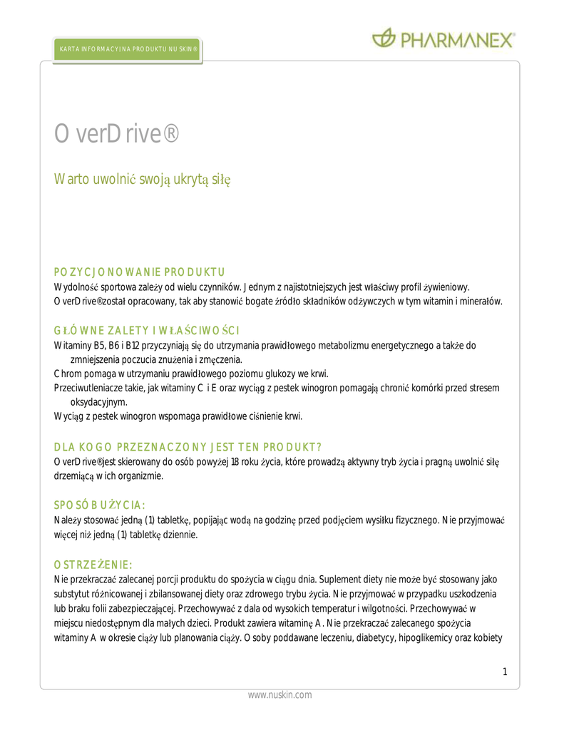 KARTA INFORMACYJNA PRODUKTU NU SKIN® OverDrive® Warto uwolnić swoją ukrytą siłę POZYCJONOWANIE PRODUKTU Wydolność sportowa zależy od wielu czynników. Jednym z najistotniejszych jest właściwy profil żywieniowy. OverDrive® został opracowany, tak aby stanowić bogate źródło składników odżywczych w tym witamin i minerałów. GŁÓWNE ZALETY I WŁAŚCIWOŚCI Witaminy B5, B6 i B12 przyczyniają się do utrzymania prawidłowego metabolizmu energetycznego a także do zmniejszenia poczucia znużenia i zmęczenia. Chrom pomaga w utrzymaniu prawidłowego poziomu glukozy we krwi. Przeciwutleniacze takie, jak witaminy C i E oraz wyciąg z pestek winogron pomagają chronić komórki przed stresem oksydacyjnym. Wyciąg z pestek winogron wspomaga prawidłowe ciśnienie krwi. DLA KOGO PRZEZNACZONY JEST TEN PRODUKT? OverDrive® jest skierowany do osób powyżej 18 roku życia, które prowadzą aktywny tryb życia i pragną uwolnić siłę drzemiącą w ich organizmie. SPOSÓB UŻYCIA: Należy stosować jedną (1) tabletkę, popijając wodą na godzinę przed podjęciem wysiłku fizycznego. Nie przyjmować więcej niż jedną (1) tabletkę dziennie. OSTRZEŻENIE: Nie przekraczać zalecanej porcji produktu do spożycia w ciągu dnia. Suplement diety nie może być stosowany jako substytut różnicowanej i zbilansowanej diety oraz zdrowego trybu życia. Nie przyjmować w przypadku uszkodzenia lub braku folii zabezpieczającej. Przechowywać z dala od wysokich temperatur i wilgotności. Przechowywać w miejscu niedostępnym dla małych dzieci. Produkt zawiera witaminę A. Nie przekraczać zalecanego spożycia witaminy A w okresie ciąży lub planowania ciąży. Osoby poddawane leczeniu, diabetycy, hipoglikemicy oraz kobiety 1 www.nuskin.com KARTA INFORMACYJNA PRODUKTU NU SKIN® w ciąży lub w okresie karmienia piersią powinny przed rozpoczęciem spożywania produktu powinny zasięgnąć opinii lekarskiej.. SKŁAD Kwas L-askorbinowy (167 mg/tabletka 209% RWS*), substancja wypełniająca: celuloza mikrokrystaliczna, siarczan magnezu (20 mg magnezu/tabletka 5,3% RWS*), bursztynian D-alpha-tokoferylu (34 mg TE/tabletka 283% RWS*), wyciąg z ananasa (Ananas comosus (L.) Merr.) (33 mg/tabletka), wyciąg z papai (Carica papaya L.) (33 mg/tabletka), tlenek magnezu (20 mg magnezu/tabletka 5,3% RWS*), wyciąg z owoców cytrusowych (33 mg/tabletka) [Lemon (Citrus limon (L.) Burm. f.) (6,6 mg/tabletka), pomarańczy (Citrus sinensis (L.) Osbeck) (19,8 mg/tabletka), mandarynki (Citrus reticula Blanco) (3,3 mg/tablet), grejpfruta (Citrus x paradisi Macfad.) (3,3 mg/tabletka)], substancje wypełniające (fosforany wapnia, sól sodowa karboksymetylocelulozy usieciowana), drożdże piwowarskie (20 mg/tabletka) (pszenica, jęczmień), chlorek chromu (III) (67 µg chromu/tabletka 168% RWS*), substancja przeciwzbrylająca: kwasy tłuszczowe, D-pantotenian wapnia (3,3 mg/tabletka 55% RWS*), wyciąg z pestek winogron (Vitis vinifera L.) (3,3 mg/tabletka), beta-karoten (1 mg/tabletka), chlorowodorek pirodyksyny (0,6 mg/tabletka 43% RWS*), ryboflawina (0,6 mg/tabletka 43% RWS*), monoazotan tiaminy (0,5 mg/tabletka 45% RWS*), cyjanokobalamina (2 µg/tabletka 80% RI*), dekstryna, dekstroza, emulgator: lecytyna (soja), Substancja wypełniająca: Sól sodowa karboksymetylocelulozy, stabilizator: cytryniany sodu *RWS: Referencyjne wartości spożycia NAJCZĘŚĆIEJ ZADAWANE PYTANIA Niniejszy dokument jest przeznaczony wyłącznie do użytku wewnętrznego pracowników i niezależnych Dystrybutorów Nu Skin Enterprises EMEA i nie może zostać przekazany do wiadomości publicznej. 2 www.nuskin.com PiP_OVERdrive_WEB_PL_1503_INT © 2015 NSE Products, Inc. Jaką rolę odgrywają w OverDrive® witaminy z grupy B i chrom? Witaminy te są niezbędne dla organizmu, gdyż nie potrafi ich on samodzielnie syntezować. Przy aktywności fizycznej wzrasta zapotrzebowanie na witaminy z grupy B ze względu na większe wydatki energetyczne. Suplement OverDrive® dostarcza istiotnych witamin z tej grupy takich jak: witamina B5, B6 i B12 przyczyniając się do utrzymania prawidłowego metabolizmu energetycznego oraz do zmniejszenia uczucia zmęczenia i znużenia. Chrom jest kluczowym minerałem śladowym, który pomaga w utrzymaniu prawidłowego poziomu glukozy we krwi.