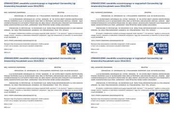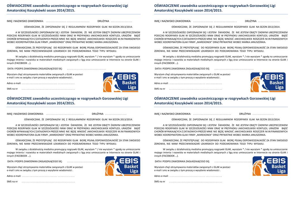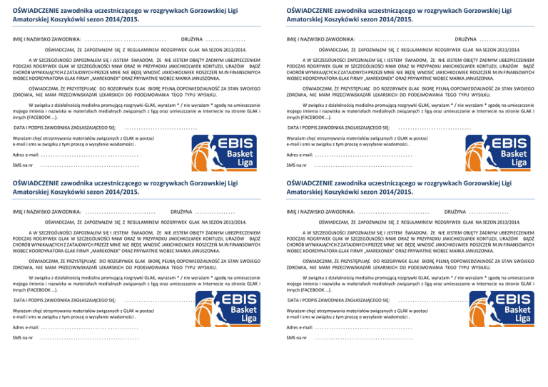 OŚWIADCZENIE zawodnika uczestniczącego w rozgrywkach Gorzowskiej Ligi Amatorskiej Koszykówki sezon 2014/2015. OŚWIADCZENIE zawodnika uczestniczącego w rozgrywkach Gorzowskiej Ligi Amatorskiej Koszykówki sezon 2014/2015. IMIĘ I NAZWISKO ZAWODNIKA: . . . . . . . . . . . . . . . . . . . . . . . . . . . . . . . . . . IMIĘ I NAZWISKO ZAWODNIKA: . . . . . . . . . . . . . . . . . . . . . . . . . . . . . . . . . . DRUŻYNA . . . . . . . . . . . . . . . . . OŚWIADCZAM, ŻE ZAPOZNAŁEM SIĘ Z REGULAMINEM ROZGRYWEK GLAK NA SEZON 2013/2014. DRUŻYNA . . . . . . . . . . . . . . . . . OŚWIADCZAM, ŻE ZAPOZNAŁEM SIĘ Z REGULAMINEM ROZGRYWEK GLAK NA SEZON 2013/2014. A W SZCZEGÓLNOŚCI ZAPOZNAŁEM SIĘ I JESTEM ŚWIADOM, ŻE NIE JESTEM OBJĘTY ŻADNYM UBEZPIECZENIEM PODCZAS ROGRYWEK GLAK W SZCZEGÓLNOŚCI NNW ORAZ W PRZYPADKU JAKICHKOLWIEK KONTUZJI, URAZÓW BĄDŹ CHORÓB WYNIKAJĄCYCH Z ZATAJONYCH PRZEZE MNIE NIE BĘDĘ WNOSIĆ JAKICHKOLWIEK ROSZCZEŃ M.IN FINANSOWYCH WOBEC KOORDYNATORA GLAK FIRMY „MAREKONEK” ORAZ PRYWATNIE WOBEC MARKA JANUSZONKA. A W SZCZEGÓLNOŚCI ZAPOZNAŁEM SIĘ I JESTEM ŚWIADOM, ŻE NIE JESTEM OBJĘTY ŻADNYM UBEZPIECZENIEM PODCZAS ROGRYWEK GLAK W SZCZEGÓLNOŚCI NNW ORAZ W PRZYPADKU JAKICHKOLWIEK KONTUZJI, URAZÓW BĄDŹ CHORÓB WYNIKAJĄCYCH Z ZATAJONYCH PRZEZE MNIE NIE BĘDĘ WNOSIĆ JAKICHKOLWIEK ROSZCZEŃ M.IN FINANSOWYCH WOBEC KOORDYNATORA GLAK FIRMY „MAREKONEK” ORAZ PRYWATNIE WOBEC MARKA JANUSZONKA. OŚWIADCZAM, ŻE PRZYSTĘPUJĄC DO ROZGRYWEK GLAK BIORĘ PEŁNĄ ODPOWIEDZIALNOŚĆ ZA STAN SWOJEGO ZDROWIA, NIE MAM PRZECIWWSKAZAŃ LEKARSKICH DO PODEJMOWANIA TEGO TYPU WYSIŁKU. OŚWIADCZAM, ŻE PRZYSTĘPUJĄC DO ROZGRYWEK GLAK BIORĘ PEŁNĄ ODPOWIEDZIALNOŚĆ ZA STAN SWOJEGO ZDROWIA, NIE MAM PRZECIWWSKAZAŃ LEKARSKICH DO PODEJMOWANIA TEGO TYPU WYSIŁKU. W związku z działalnością medialna promującą rozgrywki GLAK, wyrażam * / nie wyrażam * zgodę na umieszczanie mojego imienia i nazwiska w materiałach medialnych związanych z ligą oraz umieszczanie w Internecie na stronie GLAK i innych (FACEBOOK …). W związku z działalnością medialna promującą rozgrywki GLAK, wyrażam * / nie wyrażam * zgodę na umieszczanie mojego imienia i nazwiska w materiałach medialnych związanych z ligą oraz umieszczanie w Internecie na stronie GLAK i innych (FACEBOOK …). DATA I PODPIS ZAWODNIKA ZAGŁASZAJĄCEGO SIĘ: DATA I PODPIS ZAWODNIKA ZAGŁASZAJĄCEGO SIĘ: ............................... ............................... Wyrażam chęć otrzymywania materiałów związanych z GLAK w postaci e-mail i sms w związku z tym proszę o wysyłanie wiadomości . Wyrażam chęć otrzymywania materiałów związanych z GLAK w postaci e-mail i sms w związku z tym proszę o wysyłanie wiadomości . Adres e-mail: . . . . . . . . . . . . . . . . . . . . . . . . . . . . . . . . . . . . . . . . . Adres e-mail: . . . . . . . . . . . . . . . . . . . . . . . . . . . . . . . . . . . . . . . . . SMS na nr SMS na nr .......................................... .......................................... OŚWIADCZENIE zawodnika uczestniczącego w rozgrywkach Gorzowskiej Ligi Amatorskiej Koszykówki sezon 2014/2015. OŚWIADCZENIE zawodnika uczestniczącego w rozgrywkach Gorzowskiej Ligi Amatorskiej Koszykówki sezon 2014/2015. IMIĘ I NAZWISKO ZAWODNIKA: . . . . . . . . . . . . . . . . . . . . . . . . . . . . . . IMIĘ I NAZWISKO ZAWODNIKA: . . . . . . . . . . . . . . . . . . . . . . . . . . . . . . DRUŻYNA . . . . . . . . . . . . . . . . . OŚWIADCZAM, ŻE ZAPOZNAŁEM SIĘ Z REGULAMINEM ROZGRYWEK GLAK NA SEZON 2013/2014. DRUŻYNA . . . . . . . . . . . . . . . . . OŚWIADCZAM, ŻE ZAPOZNAŁEM SIĘ Z REGULAMINEM ROZGRYWEK GLAK NA SEZON 2013/2014. A W SZCZEGÓLNOŚCI ZAPOZNAŁEM SIĘ I JESTEM ŚWIADOM, ŻE NIE JESTEM OBJĘTY ŻADNYM UBEZPIECZENIEM PODCZAS ROGRYWEK GLAK W SZCZEGÓLNOŚCI NNW ORAZ W PRZYPADKU JAKICHKOLWIEK KONTUZJI, URAZÓW BĄDŹ CHORÓB WYNIKAJĄCYCH Z ZATAJONYCH PRZEZE MNIE NIE BĘDĘ WNOSIĆ JAKICHKOLWIEK ROSZCZEŃ M.IN FINANSOWYCH WOBEC KOORDYNATORA GLAK FIRMY „MAREKONEK” ORAZ PRYWATNIE WOBEC MARKA JANUSZONKA. A W SZCZEGÓLNOŚCI ZAPOZNAŁEM SIĘ I JESTEM ŚWIADOM, ŻE NIE JESTEM OBJĘTY ŻADNYM UBEZPIECZENIEM PODCZAS ROGRYWEK GLAK W SZCZEGÓLNOŚCI NNW ORAZ W PRZYPADKU JAKICHKOLWIEK KONTUZJI, URAZÓW BĄDŹ CHORÓB WYNIKAJĄCYCH Z ZATAJONYCH PRZEZE MNIE NIE BĘDĘ WNOSIĆ JAKICHKOLWIEK ROSZCZEŃ M.IN FINANSOWYCH WOBEC KOORDYNATORA GLAK FIRMY „MAREKONEK” ORAZ PRYWATNIE WOBEC MARKA JANUSZONKA. OŚWIADCZAM, ŻE PRZYSTĘPUJĄC DO ROZGRYWEK GLAK BIORĘ PEŁNĄ ODPOWIEDZIALNOŚĆ ZA STAN SWOJEGO ZDROWIA, NIE MAM PRZECIWWSKAZAŃ LEKARSKICH DO PODEJMOWANIA TEGO TYPU WYSIŁKU. OŚWIADCZAM, ŻE PRZYSTĘPUJĄC DO ROZGRYWEK GLAK BIORĘ PEŁNĄ ODPOWIEDZIALNOŚĆ ZA STAN SWOJEGO ZDROWIA, NIE MAM PRZECIWWSKAZAŃ LEKARSKICH DO PODEJMOWANIA TEGO TYPU WYSIŁKU. W związku z działalnością medialna promującą rozgrywki GLAK, wyrażam * / nie wyrażam * zgodę na umieszczanie mojego imienia i nazwiska w materiałach medialnych związanych z ligą oraz umieszczanie w Internecie na stronie GLAK i innych (FACEBOOK …). W związku z działalnością medialna promującą rozgrywki GLAK, wyrażam * / nie wyrażam * zgodę na umieszczanie mojego imienia i nazwiska w materiałach medialnych związanych z ligą oraz umieszczanie w Internecie na stronie GLAK i innych (FACEBOOK …). DATA I PODPIS ZAWODNIKA ZAGŁASZAJĄCEGO SIĘ: DATA I PODPIS ZAWODNIKA ZAGŁASZAJĄCEGO SIĘ: ............................... ............................... Wyrażam chęć otrzymywania materiałów związanych z GLAK w postaci e-mail i sms w związku z tym proszę o wysyłanie wiadomości . Wyrażam chęć otrzymywania materiałów związanych z GLAK w postaci e-mail i sms w związku z tym proszę o wysyłanie wiadomości . Adres e-mail: . . . . . . . . . . . . . . . . . . . . . . . . . . . . . . . . . . . . . . . . . Adres e-mail: . . . . . . . . . . . . . . . . . . . . . . . . . . . . . . . . 